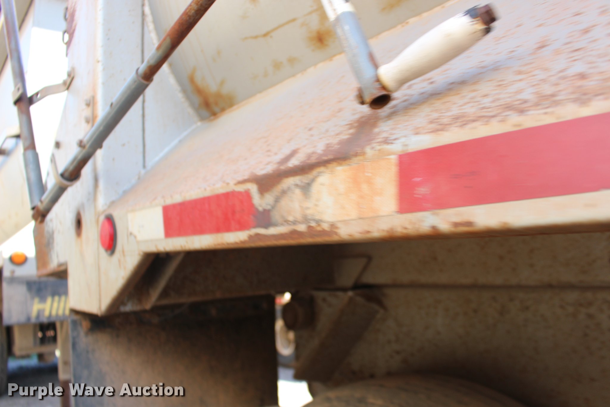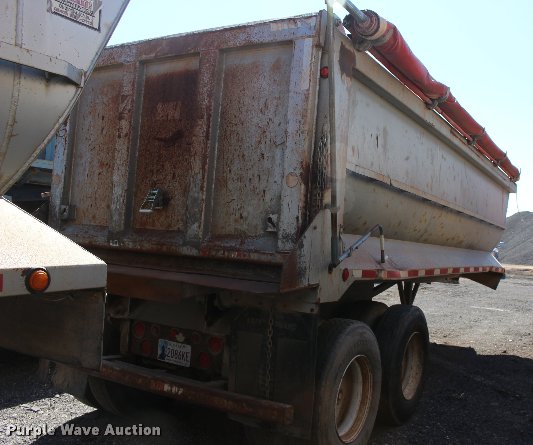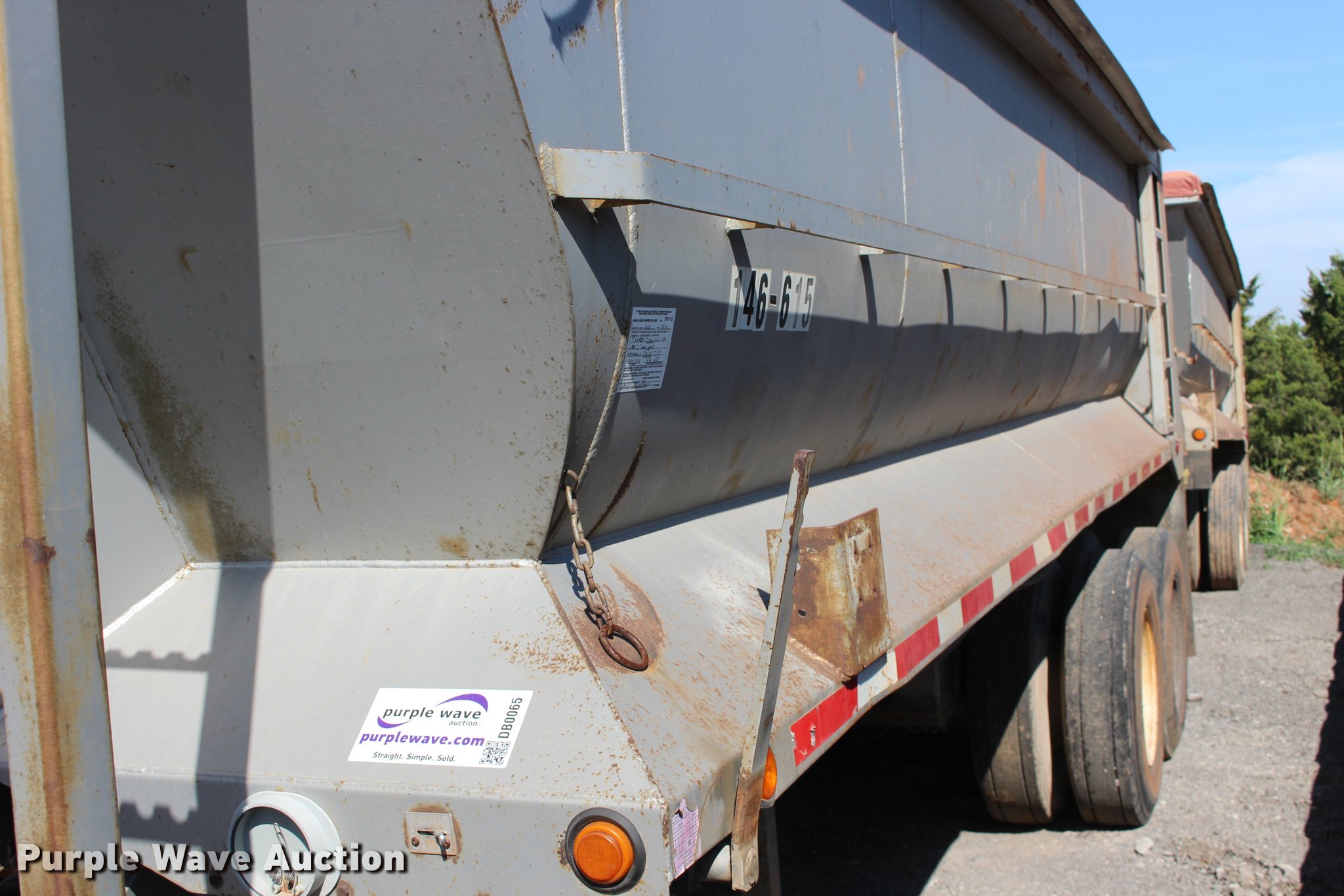 Purple Wave is selling a used End Dump Rock Trailer in Oklahoma. This item is a 2003 Hilbilt barrel end dump trailer with the following: Model 22 3/16 HDMN, 20.5'L x 96"W, Single ram hoist, Rollover tarp, Dual leg landing gear, Fifth wheel plate, Tandem axle, Ride well air suspension, Air brakes, Steel wheels, 11R22.5 tires, Unit# 146.615