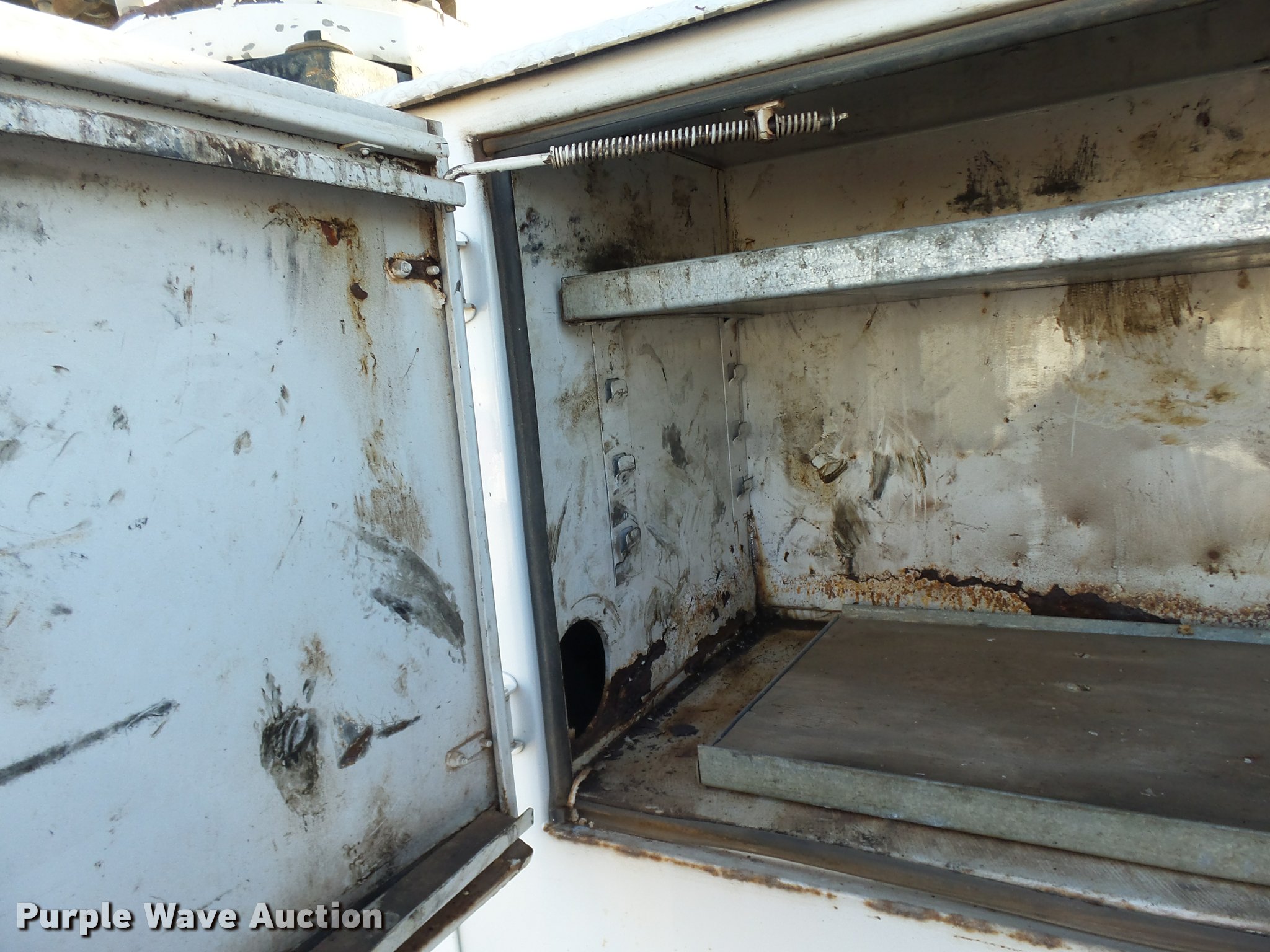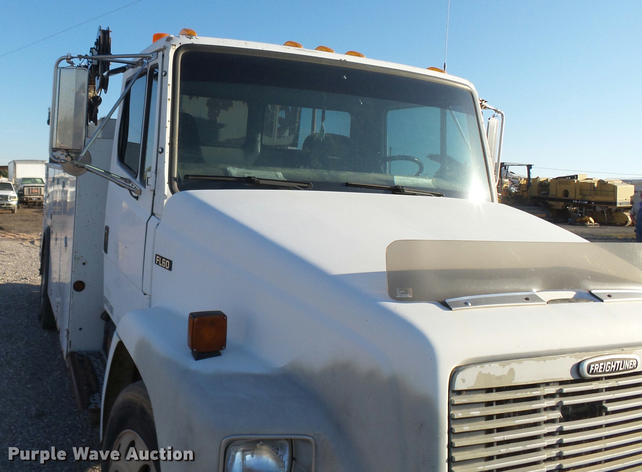 Purple Wave is selling a used Service Truck in Oklahoma. This item is a 2001 Freightliner FL60 service truck with crane with the following: 94,885 miles on odometer, Caterpillar 3126 7.2L six cylinder turbo diesel engine, 330 HP, Serial 9SZ04902, Manual transmission, AC and heat, Tilt, Telescoping steering wheel, AM/FM/CD, Power windows, Heated mirrors, Air suspension seat, Front tow hooks, Beacon light, PTO, IMT DOM-2-13 service bed, 15'L, Shelving, Slide-out drawers, Utility rack, Work lights, Mounted vise, Torch bottle rack, Dutec toolbox, Merritt top-mounted toolboxes, Ingersoll-Rand 2475 air compressor, Kohler Command Pro 125 engine,, IMT 3820 crane, 7,500 lbs max lift capacity, Remote control, (2) outriggers, Single fuel tank, Pintle hitch, Trailer wiring, 170" wheelbase, 235/80R22.5 tires, GVWR 25,500 lbs, Cracked glass, Unit# 778.530