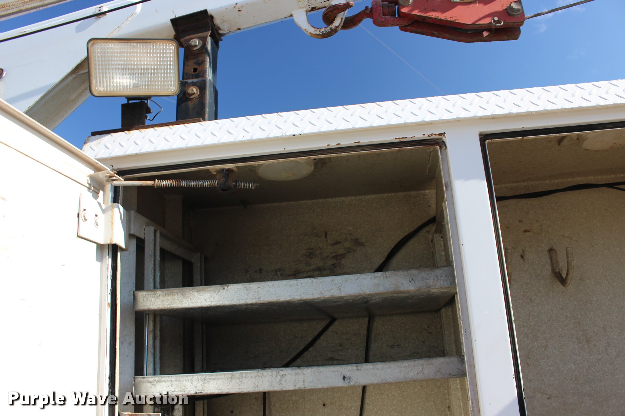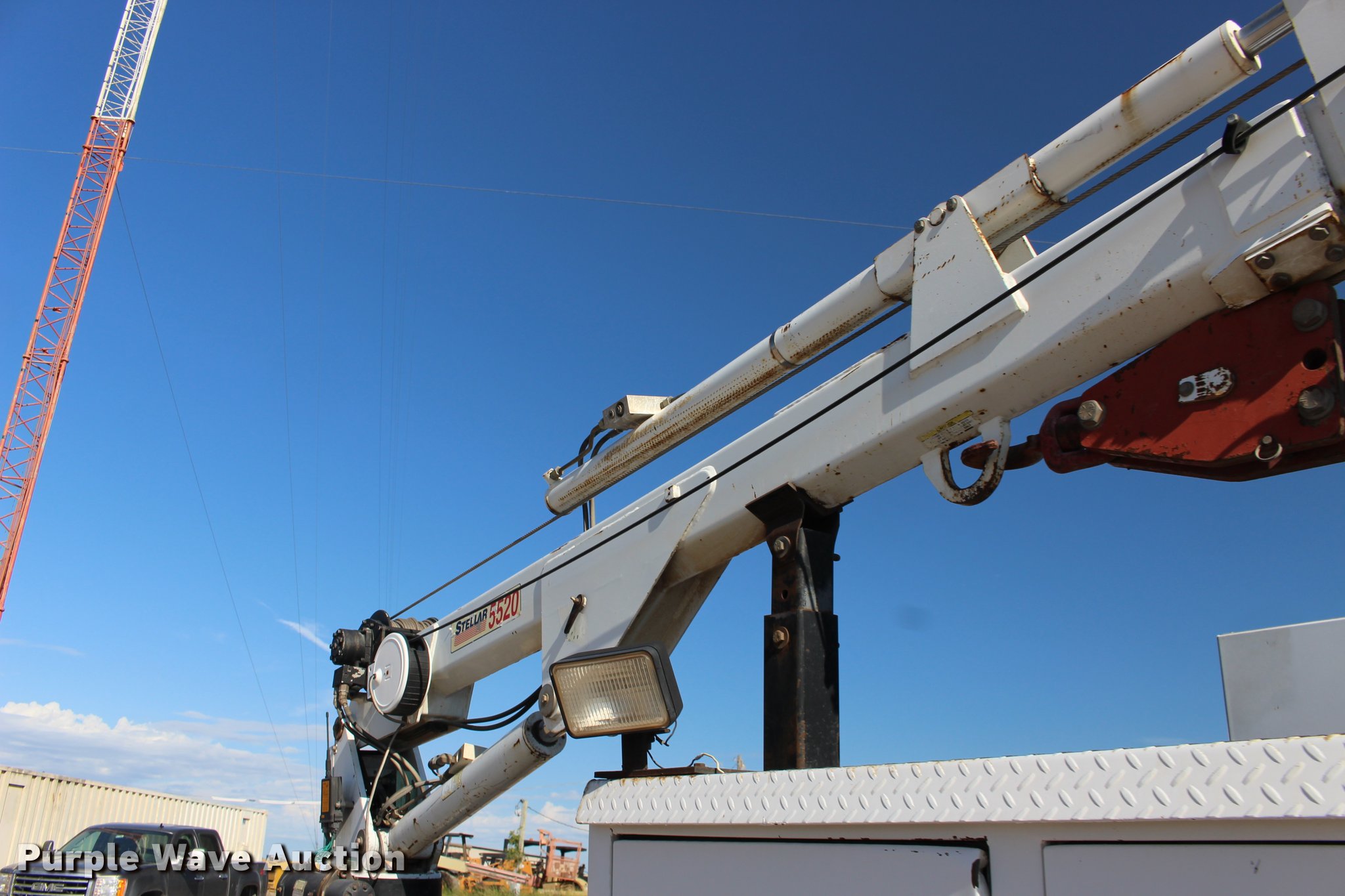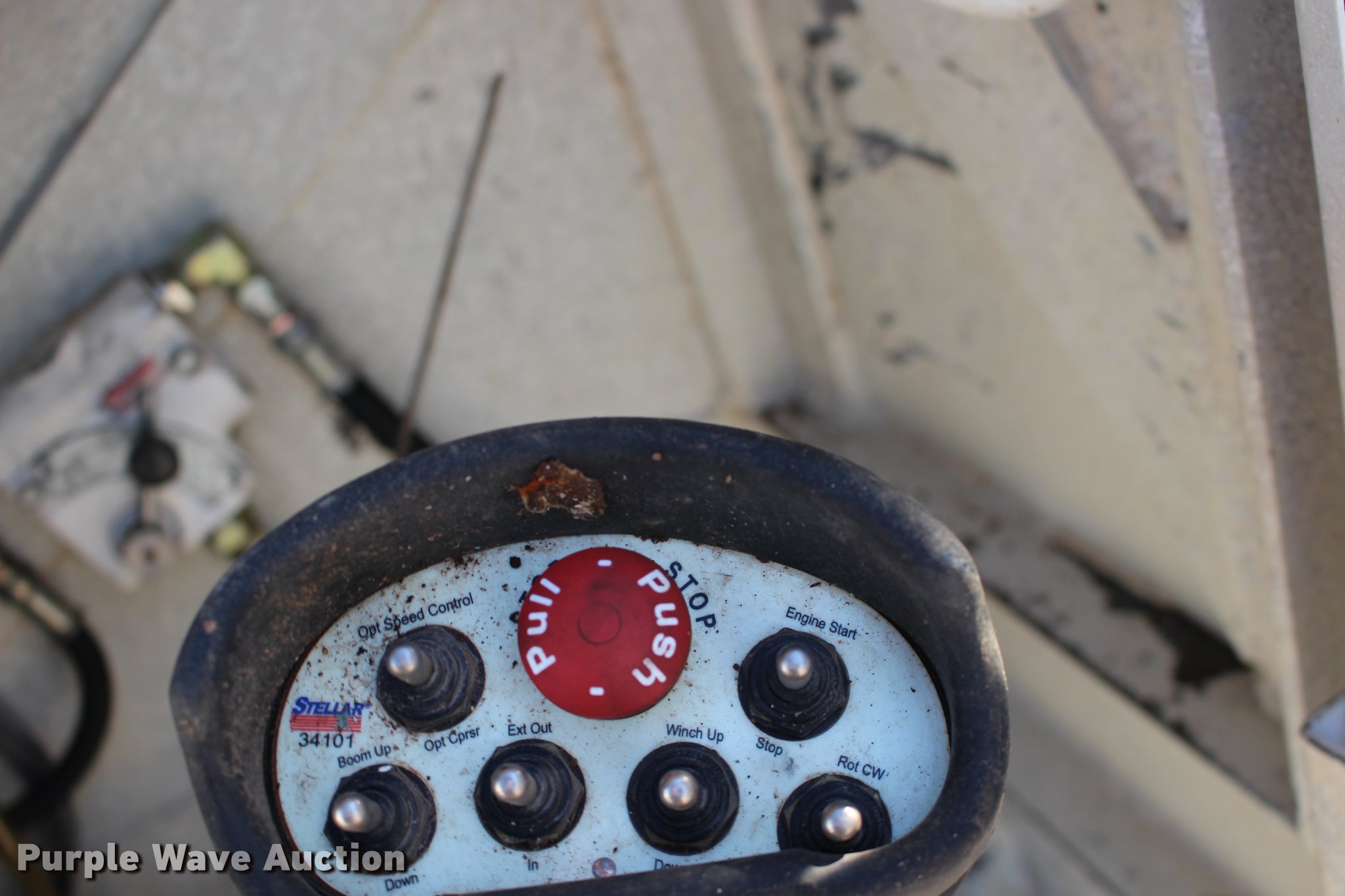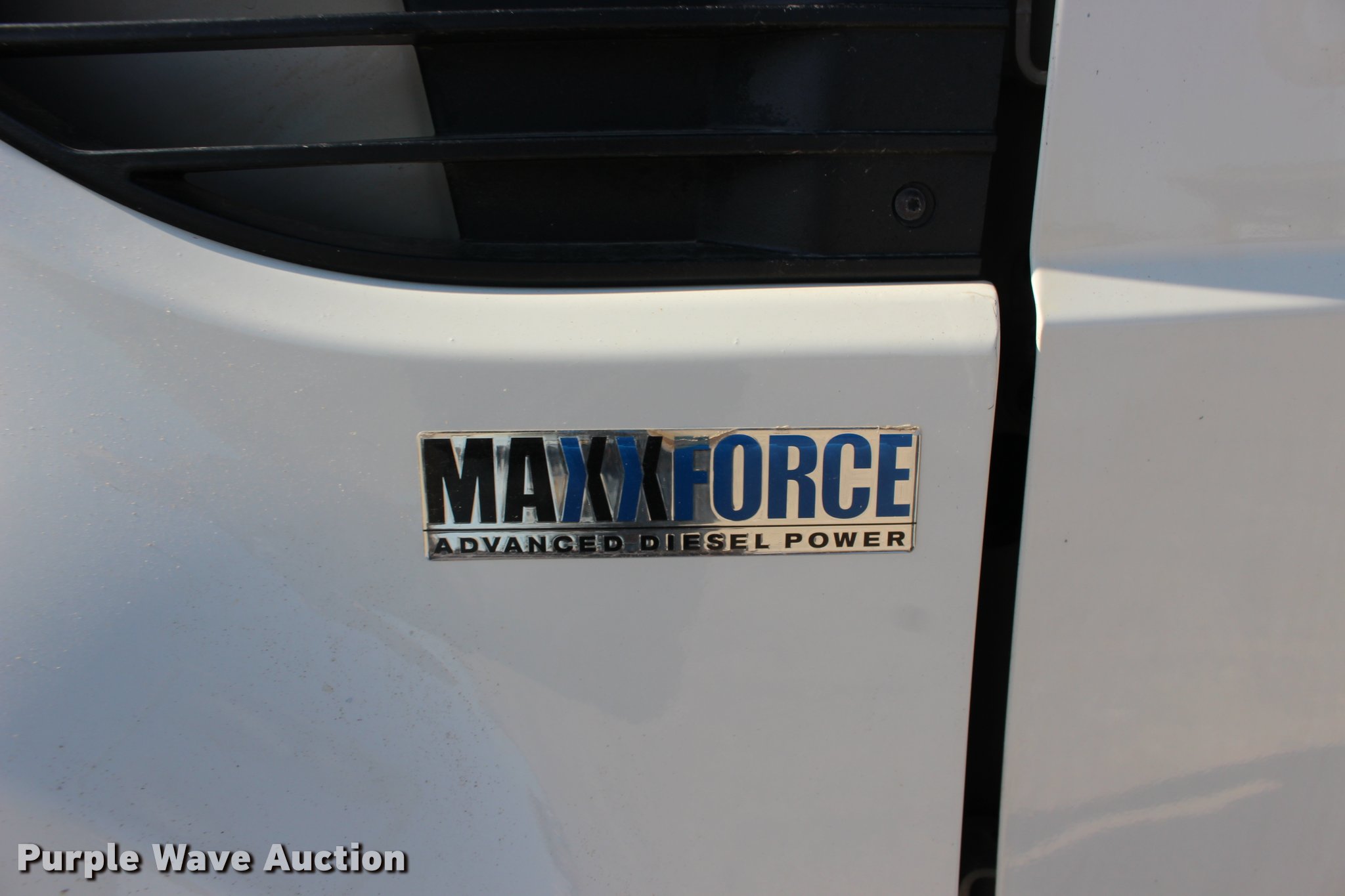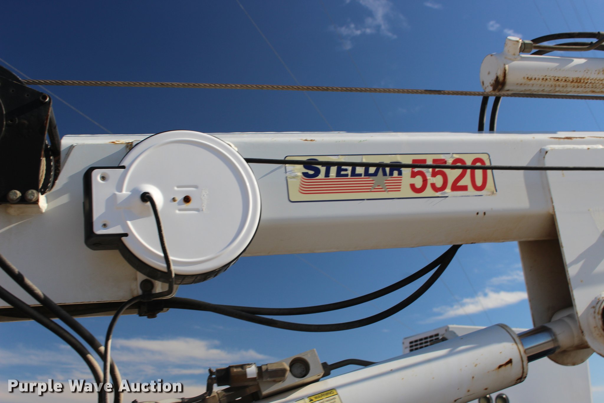 Purple Wave is selling a used Service Truck in Oklahoma. This item is a 2013 International TerraStar service truck with crane with the following: 208,615 km on odometer, 8,595 hours on first meter, 7,797 hours on second meter, International MaxxForce 7 6.4L V8 turbo diesel engine, Automatic transmission, Single axle, AC and heat, Tilt, AM/FM, Air suspension seat, Stellar auxiliary controls, Front tow hooks, PTO, Caseco MM238 service bed, 12'L, Shelving, Slide-out drawers, Utility rack, Work lights, Wilton mounted vise, Bed liner, Torch bottle rack, Rotocomp NK40-2 air compressor, Stellar SRS-40 engine, 200 psi, Hose reel, Oil/lube system, Hose reels, Hydraulic fluid reservoir, Grease reservoir, Fuel tank, Stellar 5520 crane, 21.5' boom length, 5,000 lbs max lift capacity, Remote control, (2) outriggers, Serial BCF05B184, Receiver hitch, Spring suspension, Hydraulic brakes, Michelin 225/70R19.5 tires, Unit# 151.043