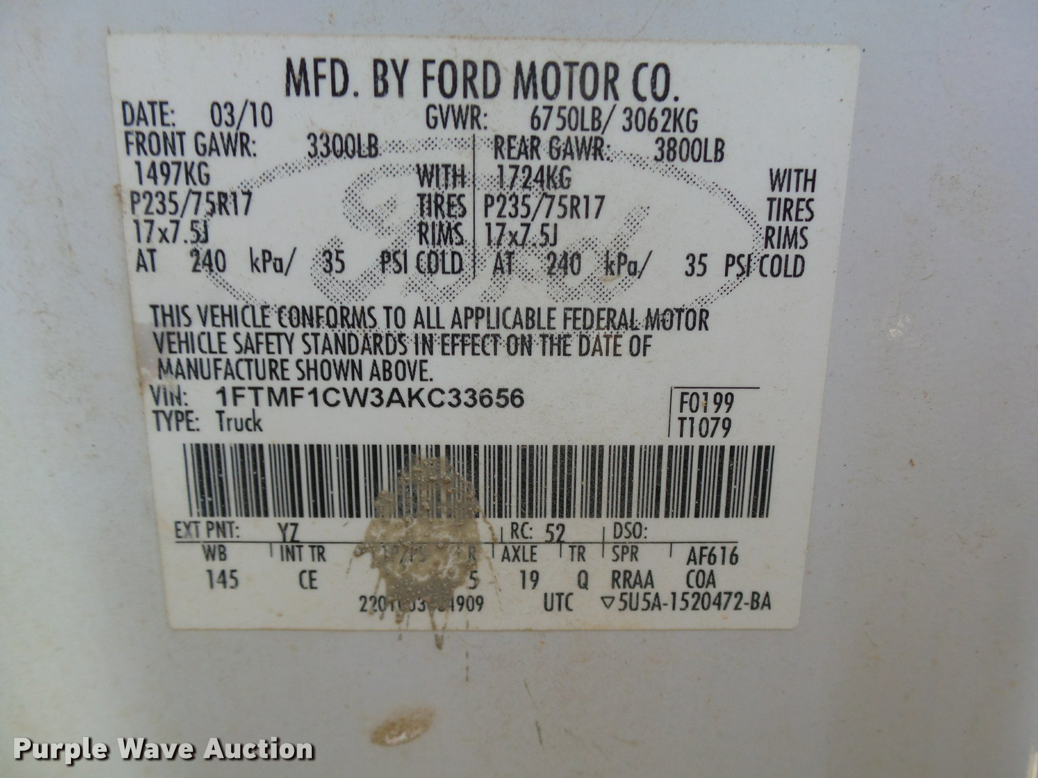 Purple Wave is selling a used 1/2 Ton Pickup or Van in Oklahoma. This item is a 2010 Ford F150 XL pickup truck with the following: 206,574 miles on odometer, 4.6L V8 SOHC 24V gas engine, Automatic transmission, AC and heat, Tilt, Cruise, AM/FM/CD, Manual windows and locks, Cloth interior, Beacon light, Long bed, Toolbox, Receiver hitch, Trailer wiring, 235/75R17 tires, Cracked glass, Unit# 701.245