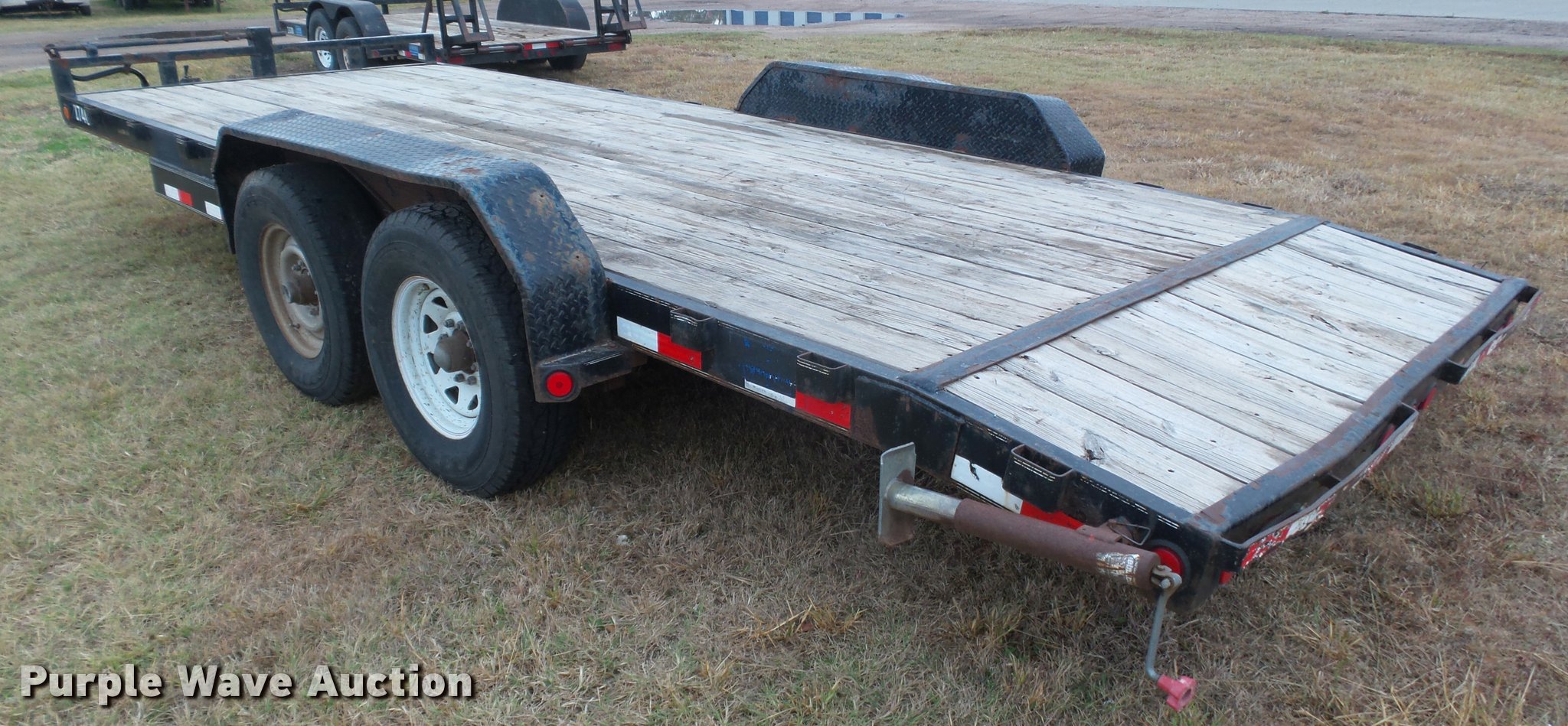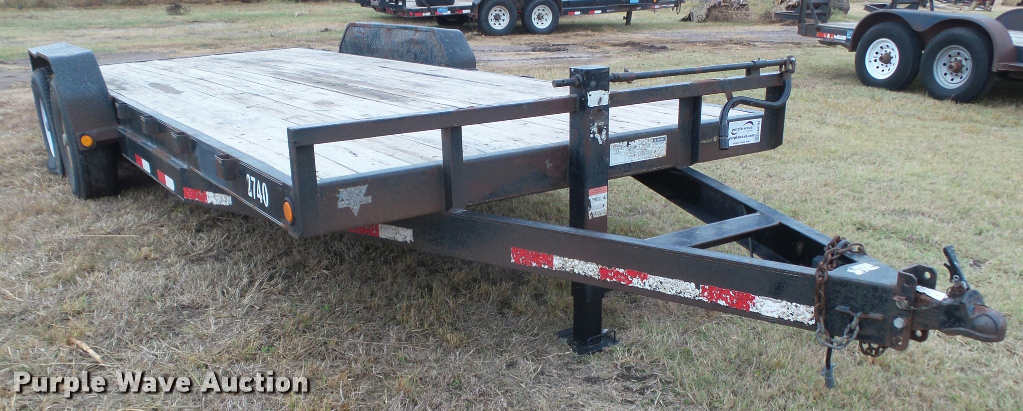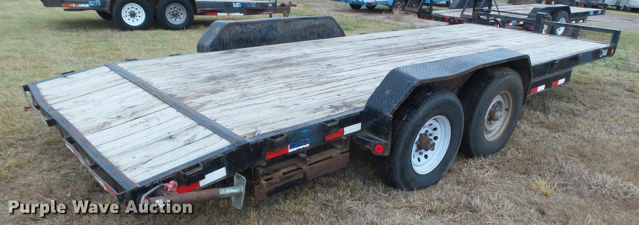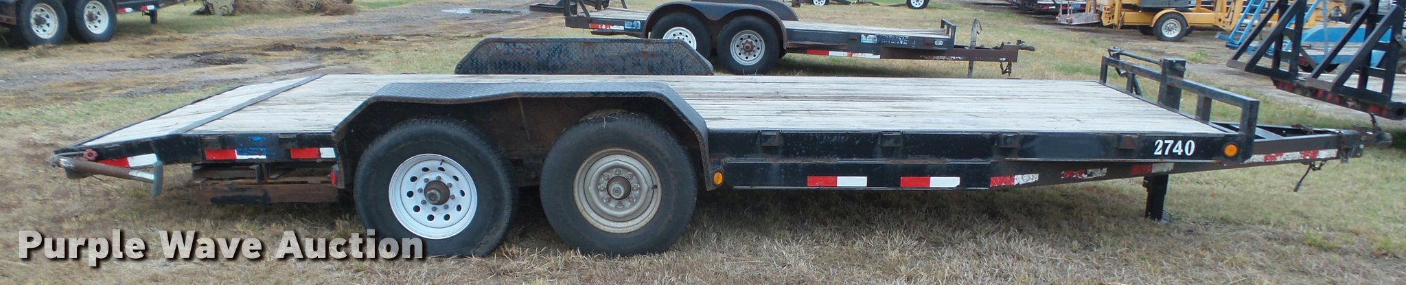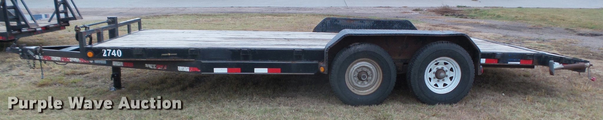 Purple Wave is selling a used Car or Utility Trailer in Kansas. This item is a 2008 PJ utility trailer with the following: 25' overall length, 20'L x 83"W wood deck, 2'L dovetail, 6'L ramps, Stake side pockets, Single leg landing gear, 2 5/16" ball hitch, Tandem axle, Steel wheels, LT235/85R16 tires, GVWR 14,000 lbs, Unit# 2740