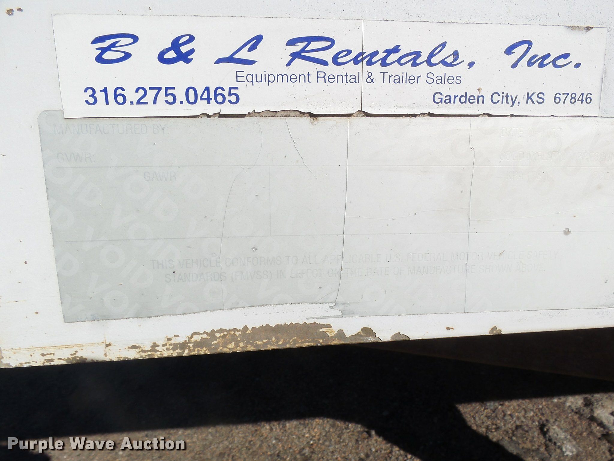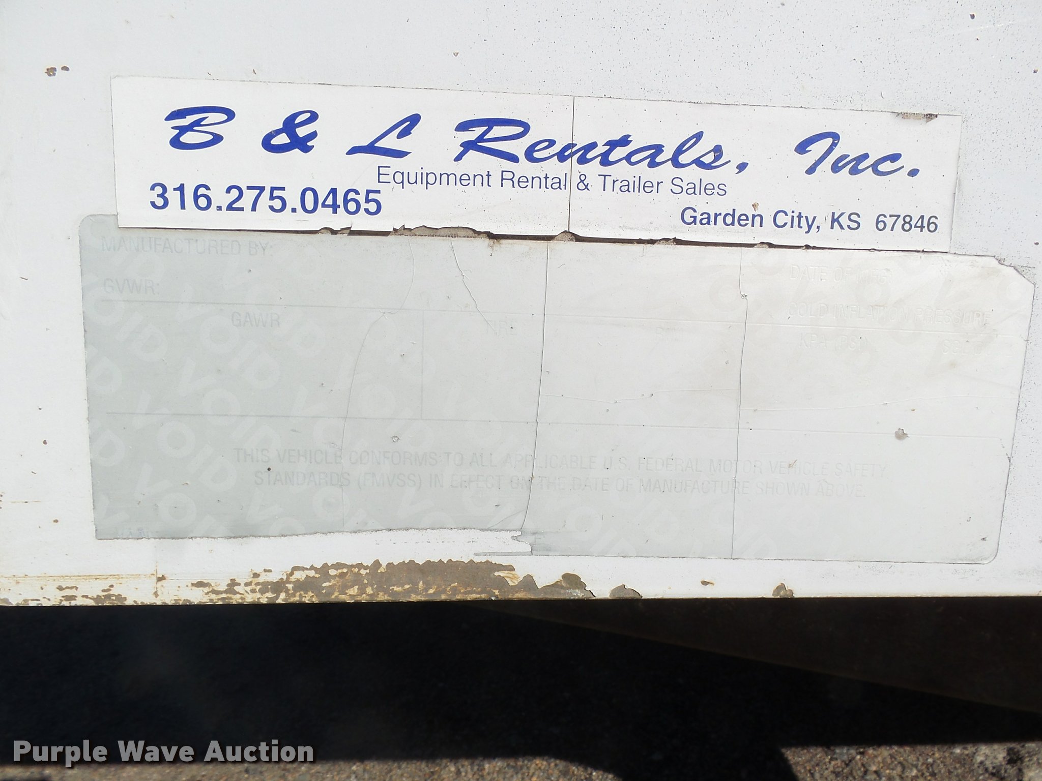 2002 Titan enclosed cargo trailer. 16' overall length, 12'L x 80"W, Wood floor, Swing-out rear doors, Side entry door, Single leg landing gear, 2" ball hitch, Tandem axle, Spring suspension, Steel wheels, ST225/75R15 tires, Unit# 2400. Kansas title. 5DZC6122721002704. K & M Rental. 1203 W. McArtor Road. Dodge City, KS 67801