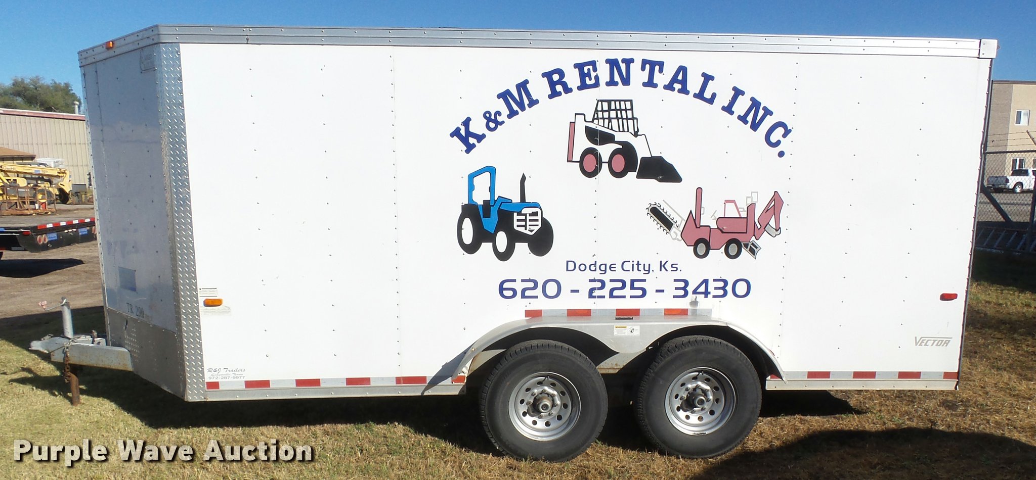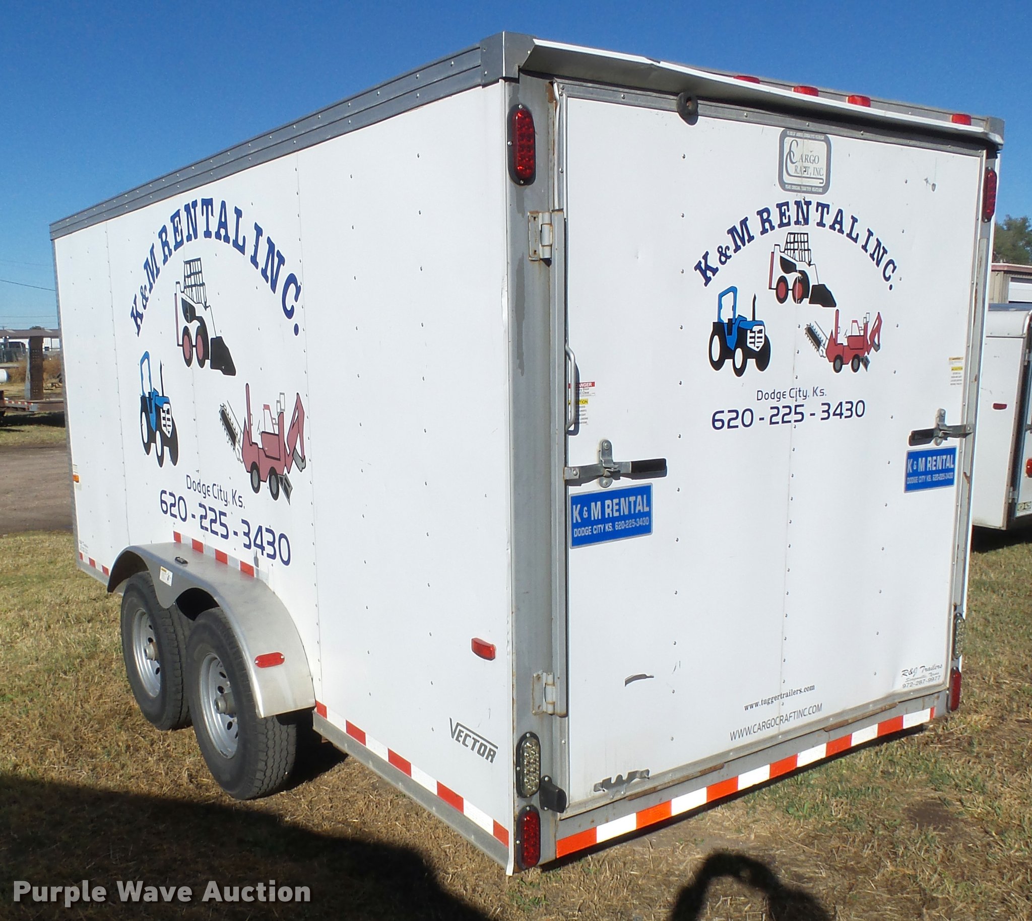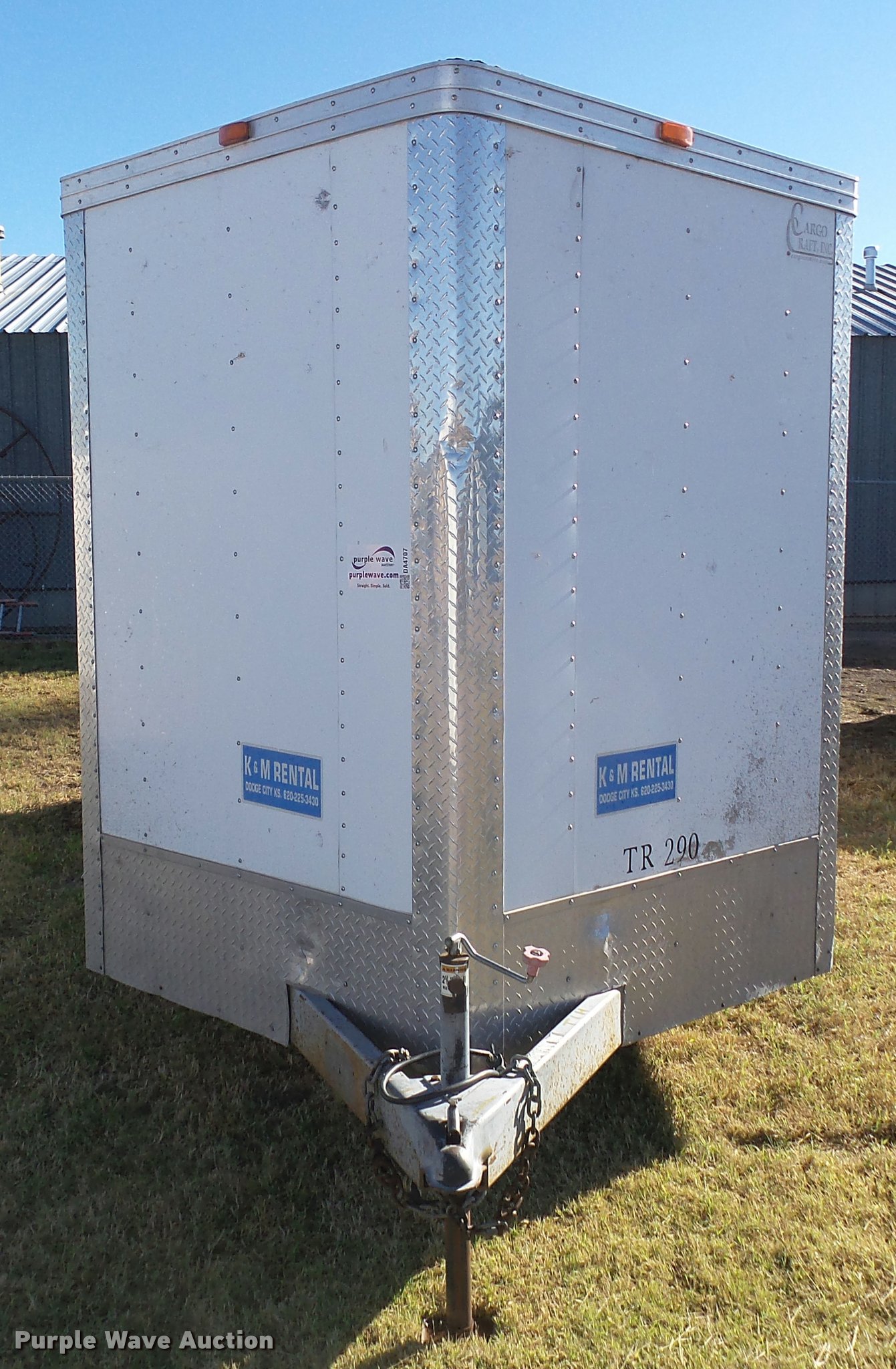2009 Cargo Craft enclosed cargo trailer. 21' overall length, 19'L x 86"W, Wood floor, Ramp, Side entry door, Single leg landing gear, Bumper pull, Tandem axle, Spring suspension, Steel wheels, LT235/85R16 tires, GVWR 12,000 lbs, GAWR 6,000 lbs, Unit# TR-290. Kansas title. 4D6EB19239C022461. K & M Rental. 1203 W. McArtor Road. Dodge City, KS 67801