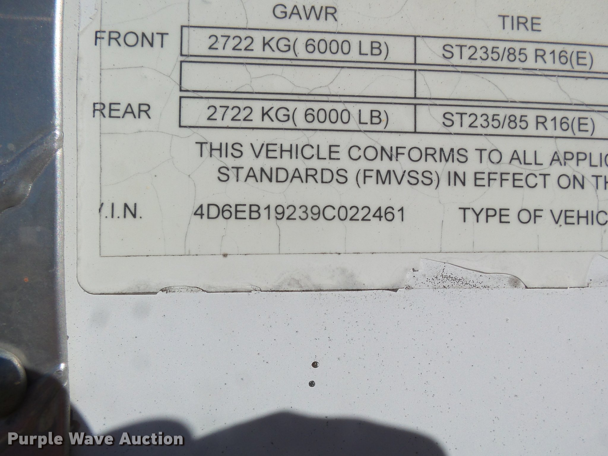 Purple Wave is selling a used Enclosed Cargo Trailer in Kansas. This item is a 2009 Cargo Craft enclosed cargo trailer with the following: 21' overall length, 19'L x 86"W, Wood floor, Ramp, Side entry door, Single leg landing gear, Bumper pull, Tandem axle, Spring suspension, Steel wheels, LT235/85R16 tires, GVWR 12,000 lbs, GAWR 6,000 lbs, Unit# TR-290
