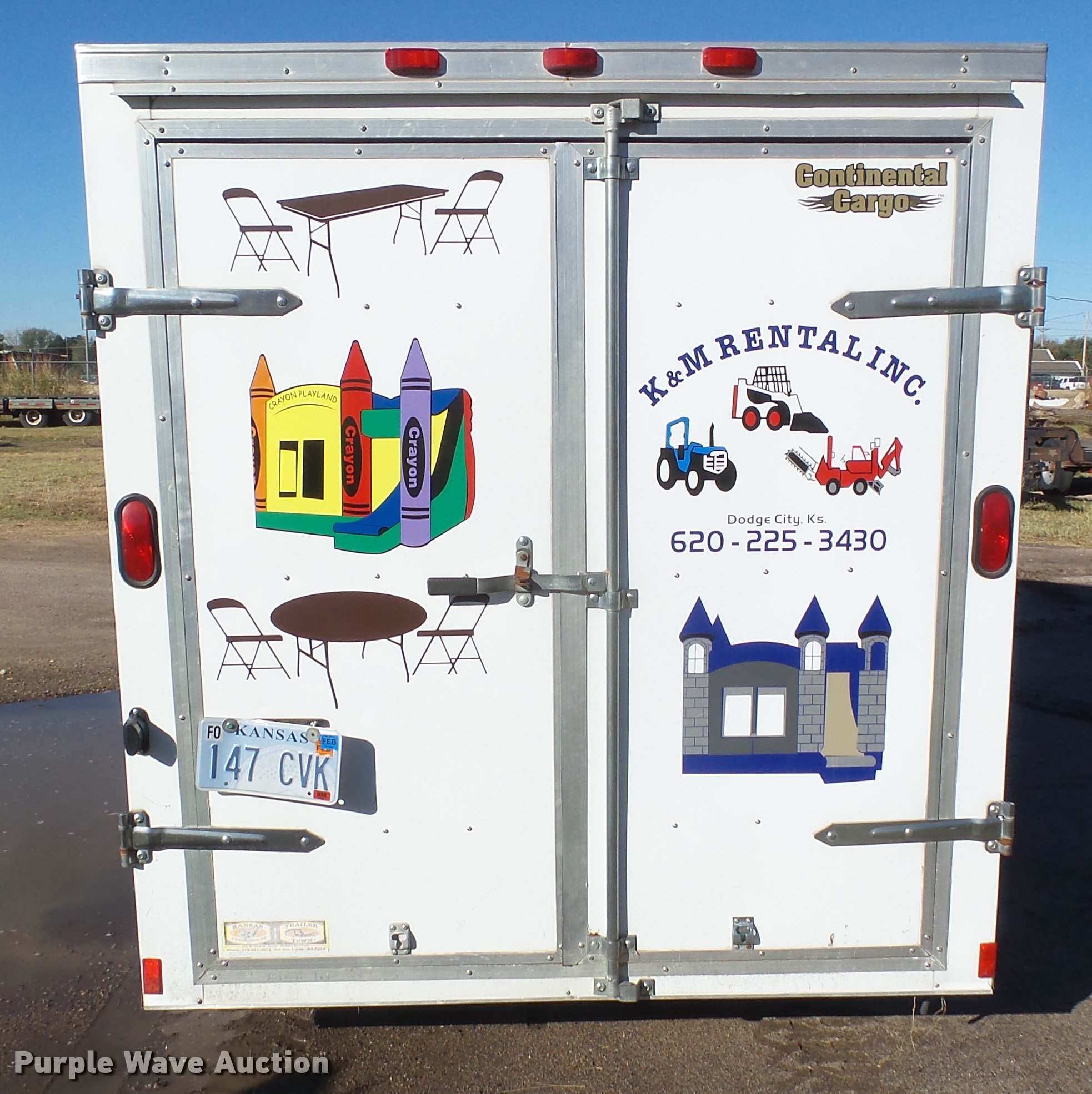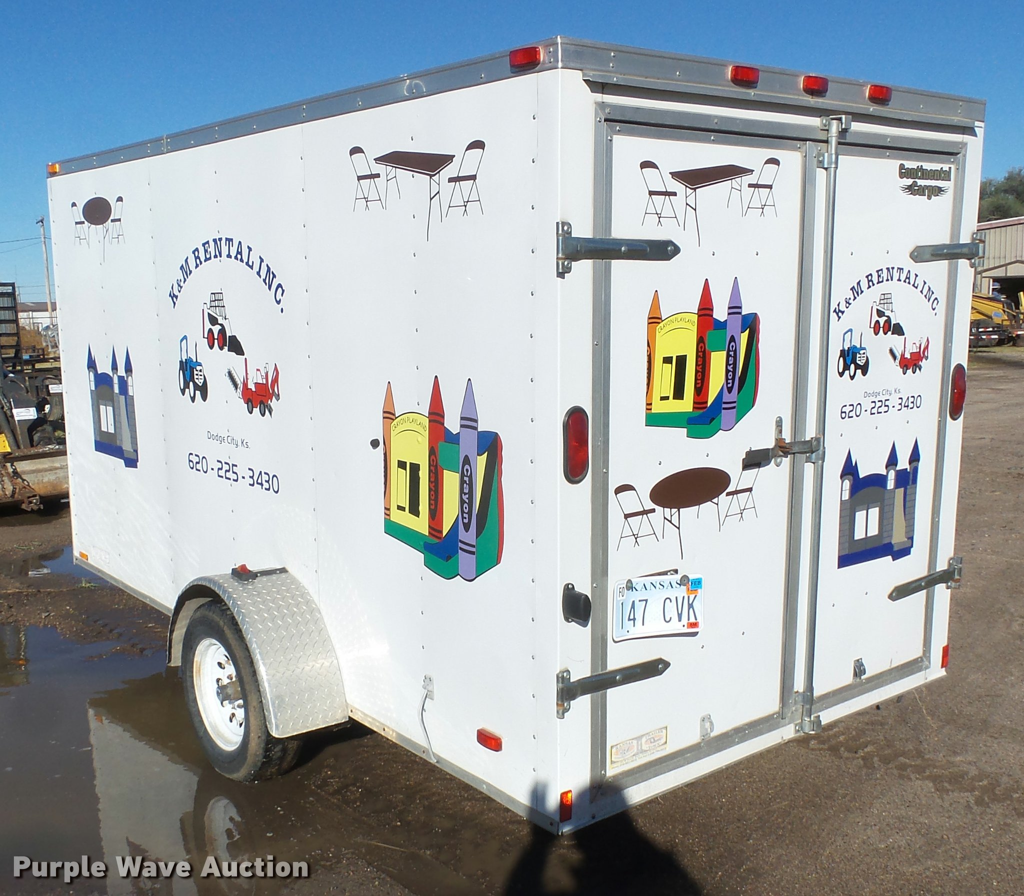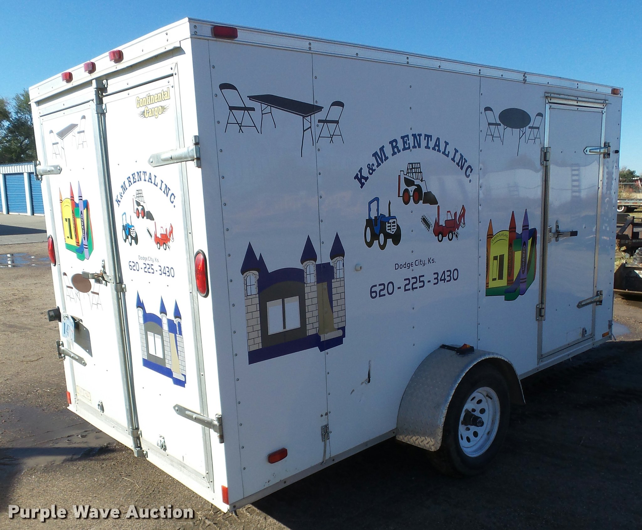 2006 Continental enclosed cargo trailer. 16' overall length, 14'L x 72"W, Wood floor, Swing-out rear doors, Side entry door, Interior lighting, Single leg landing gear, 2" ball hitch, Single axle, Spring suspension, Steel wheels, ST205/75D14 tires, Contents are not included, Unit# TR-300. Kansas title. 5NHUVH2116W002785. K & M Rental. 1203 W. McArtor Road. Dodge City, KS 67801