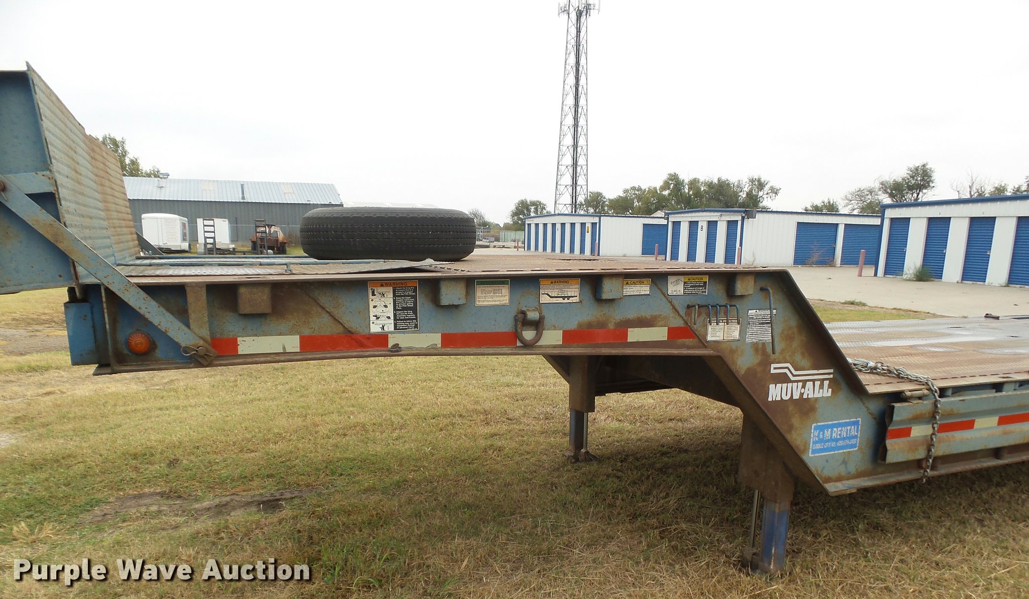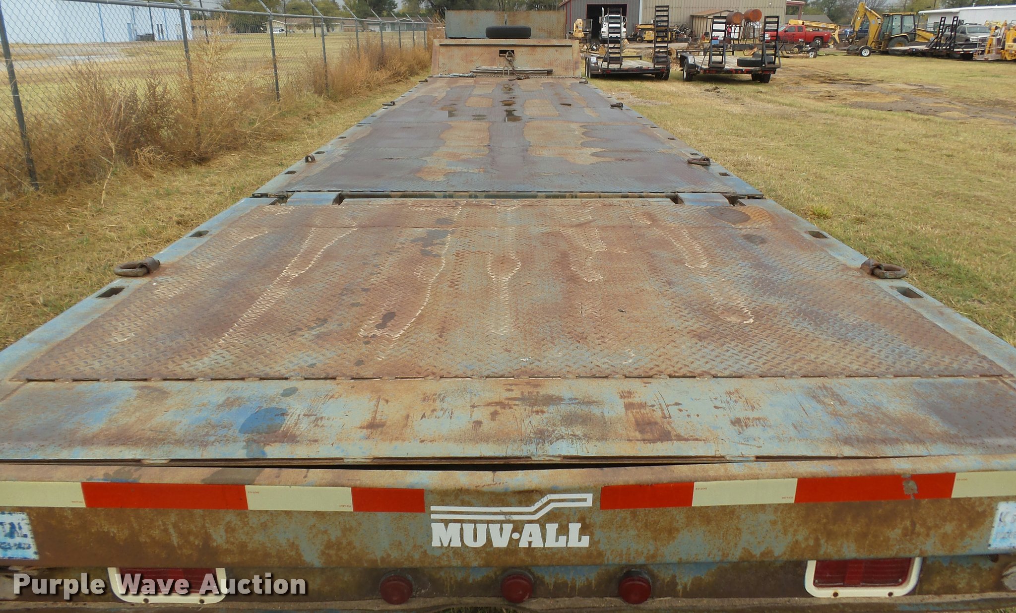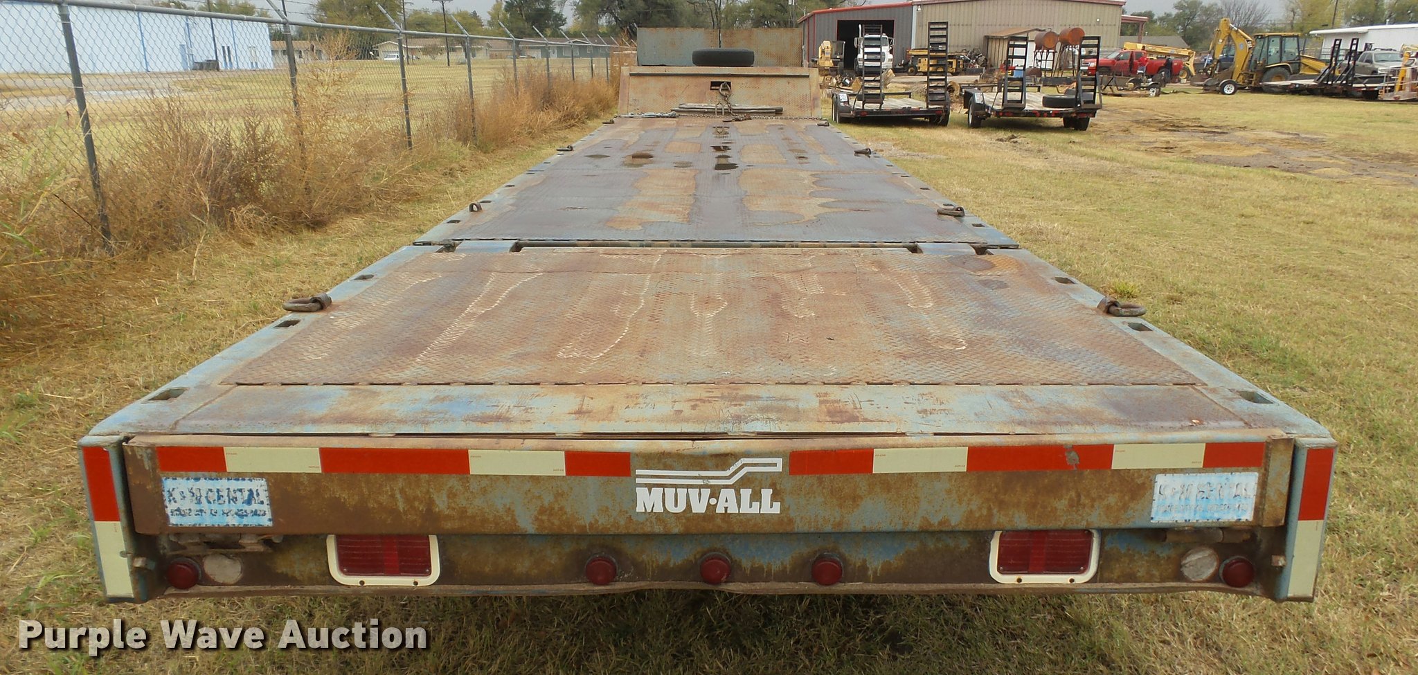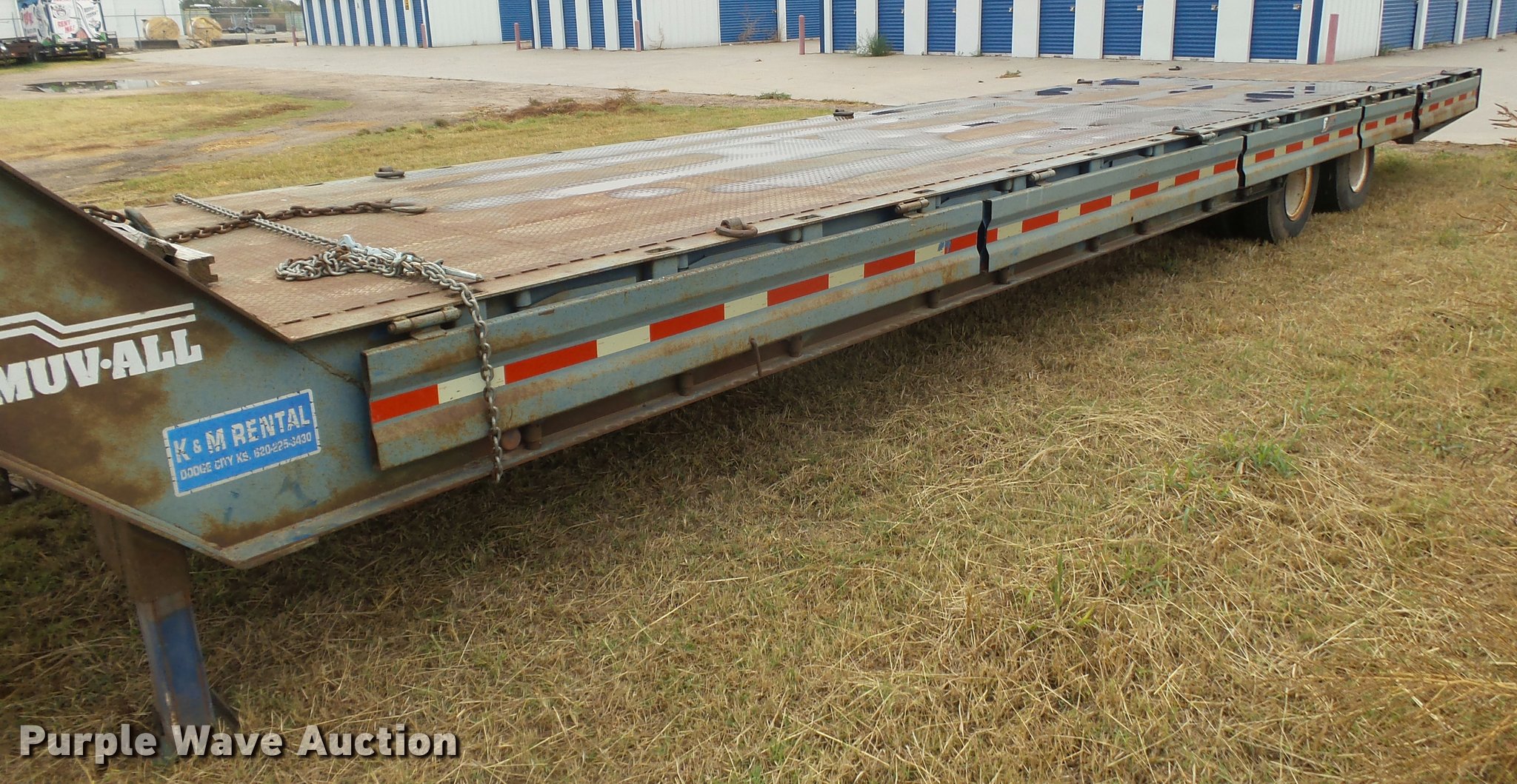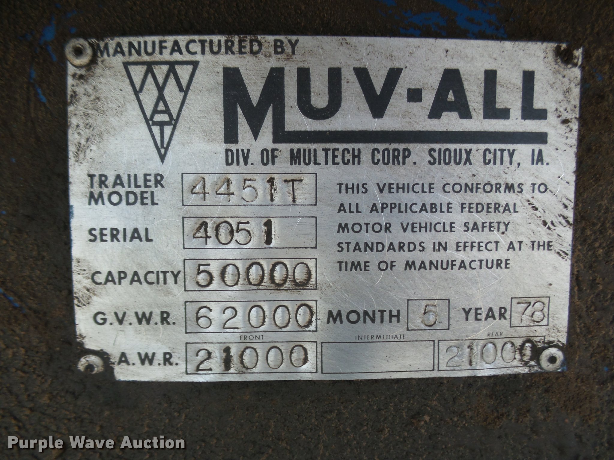 Purple Wave is selling a used Equip. Trailer in Kansas. This item is a 1978 Muvall 4451T equipment trailer with the following: 45' overall length, 27'L x 94"W main deck, 8'L upper deck, 12" swing-out outriggers, Steel deck, 36" floor height, 7'L hydratail, Winch, 12,000 lbs maximum capacity, Recessed toolbox, D-ring tie downs, Stake side pockets, Dual leg hydraulic landing gear, Fifth wheel plate, Tandem axle, Spring suspension, Air brakes, Steel wheels, 8.25R15 tires, GVWR 62,000 lbs, GAWR 21,000 lbs, Chains and boomers are not included