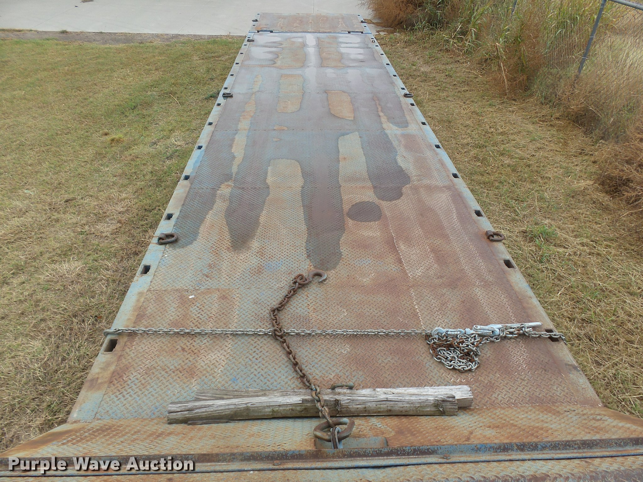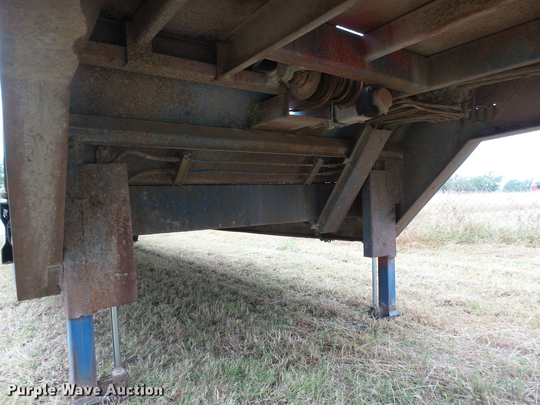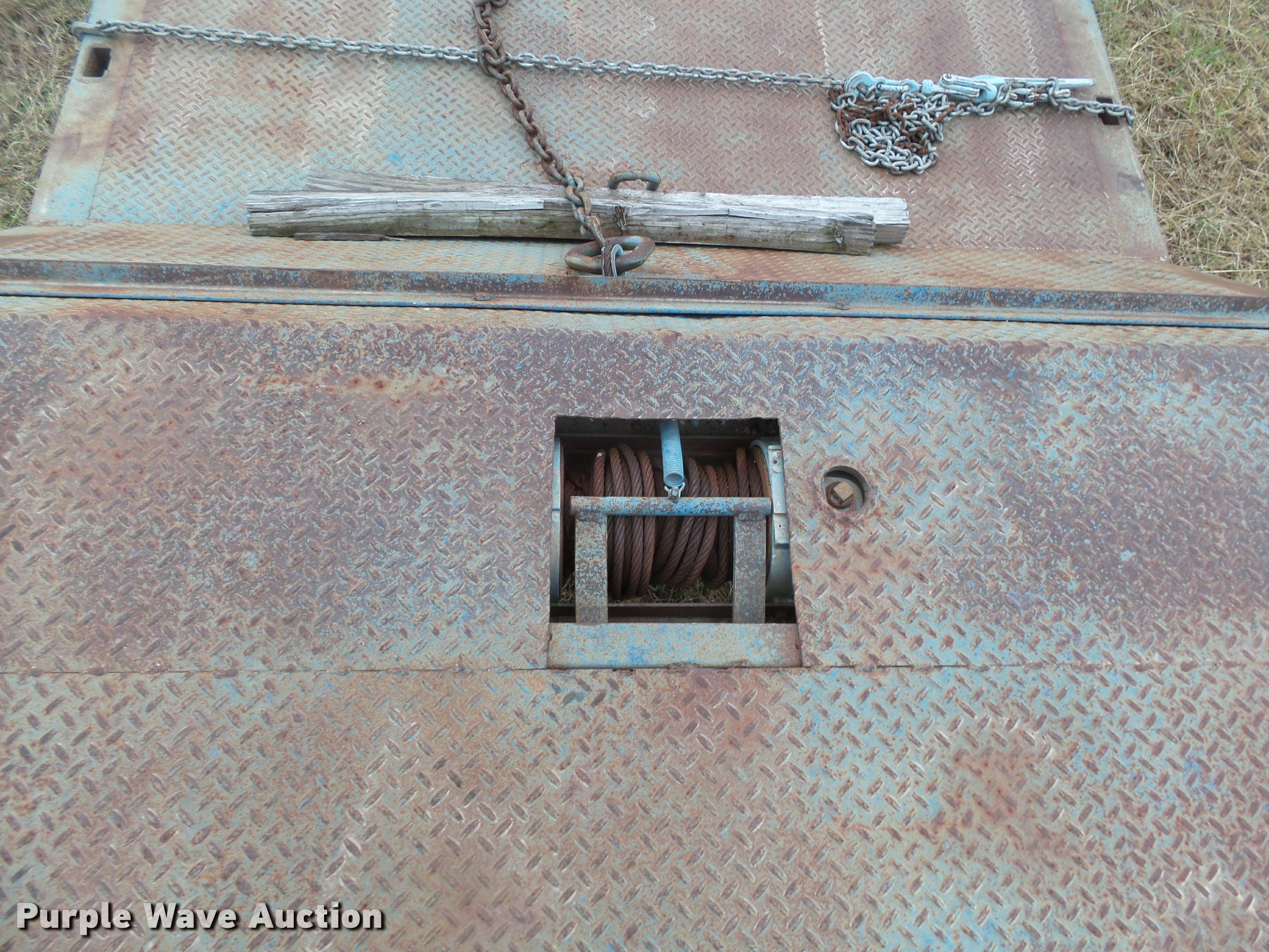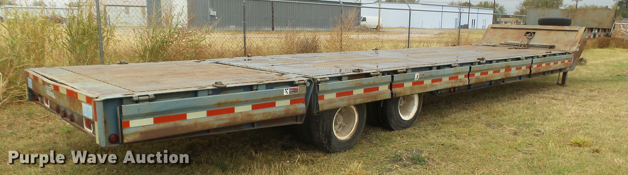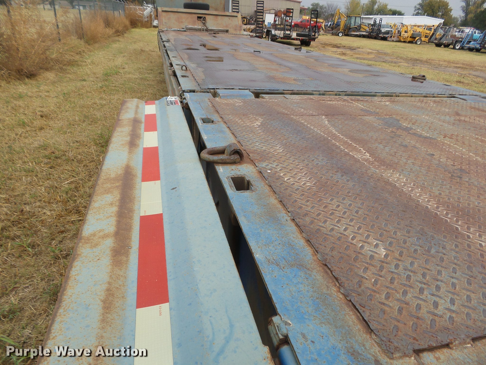 Purple Wave is selling a used Equip. Trailer in Kansas. This item is a 1978 Muvall 4451T equipment trailer with the following: 45' overall length, 27'L x 94"W main deck, 8'L upper deck, 12" swing-out outriggers, Steel deck, 36" floor height, 7'L hydratail, Winch, 12,000 lbs maximum capacity, Recessed toolbox, D-ring tie downs, Stake side pockets, Dual leg hydraulic landing gear, Fifth wheel plate, Tandem axle, Spring suspension, Air brakes, Steel wheels, 8.25R15 tires, GVWR 62,000 lbs, GAWR 21,000 lbs, Chains and boomers are not included