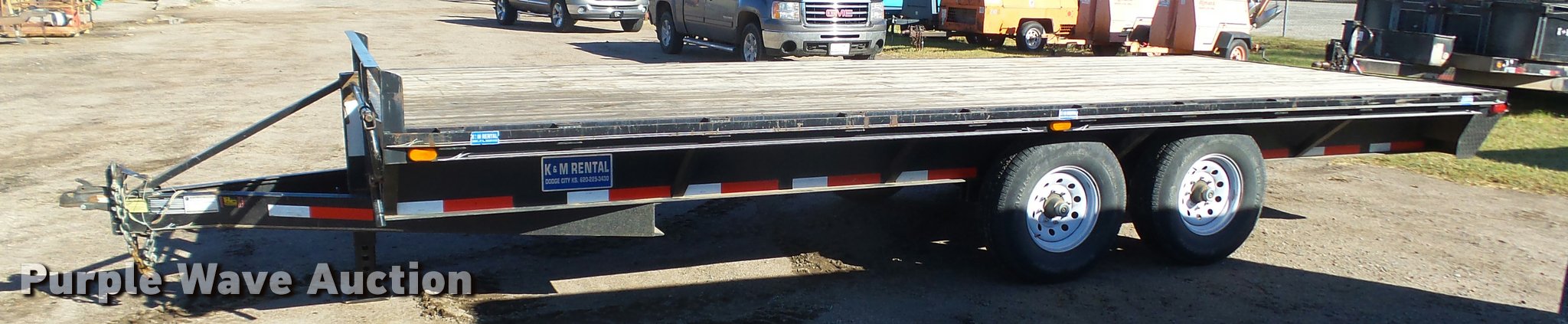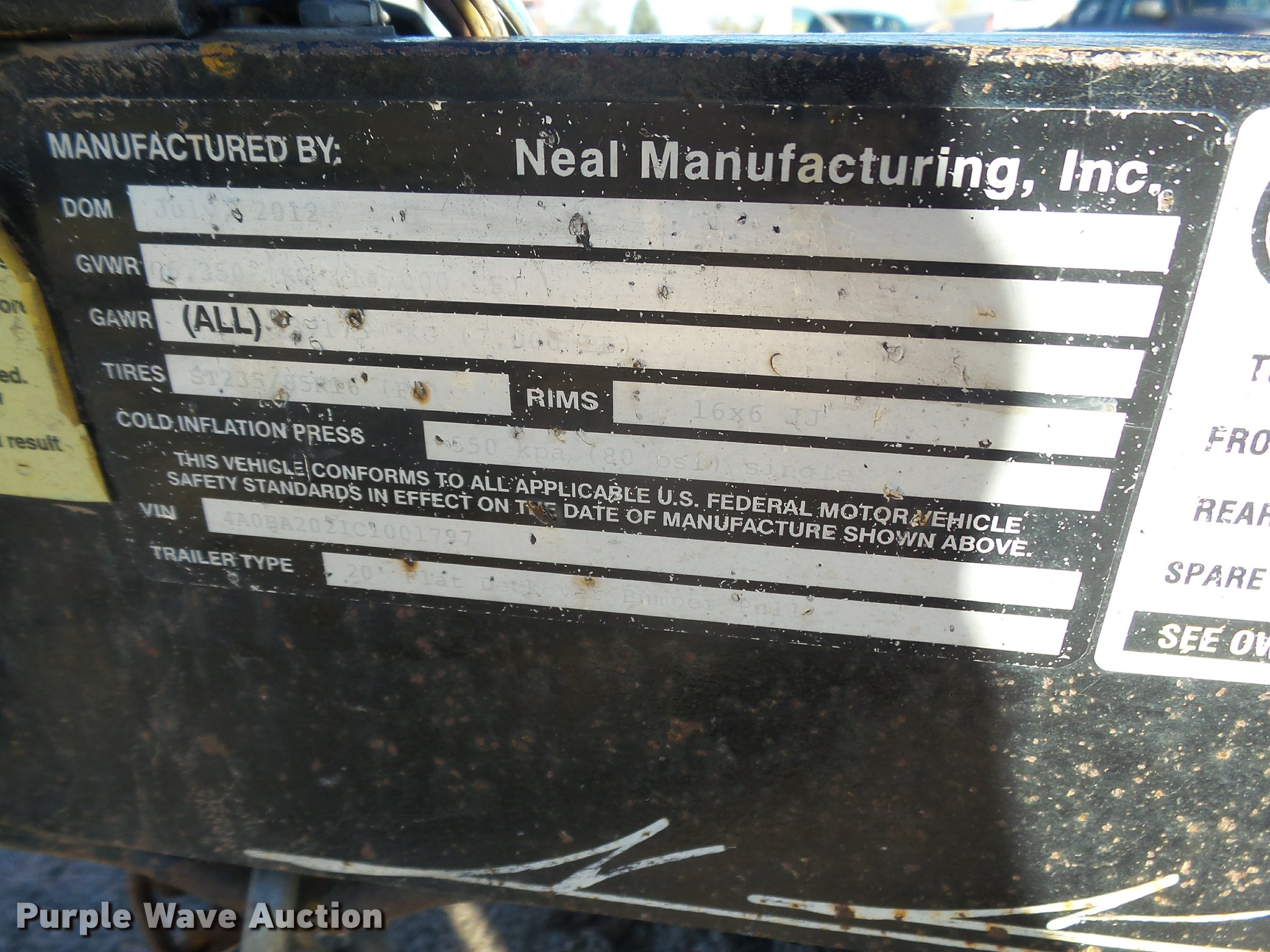 Purple Wave is selling a used Car or Utility Trailer in Kansas. This item is a 2012 Neal utility trailer with the following: 24' overall length, 20'L x 102"W wood deck, 36" floor height, 7'7" ramps, Stake side pockets, Single leg landing gear, Bumper pull, Tandem axle, Spring suspension, Steel wheels, ST235/85R16 tires, GVWR 14,000 lbs, GAWR 7,000 lbs
