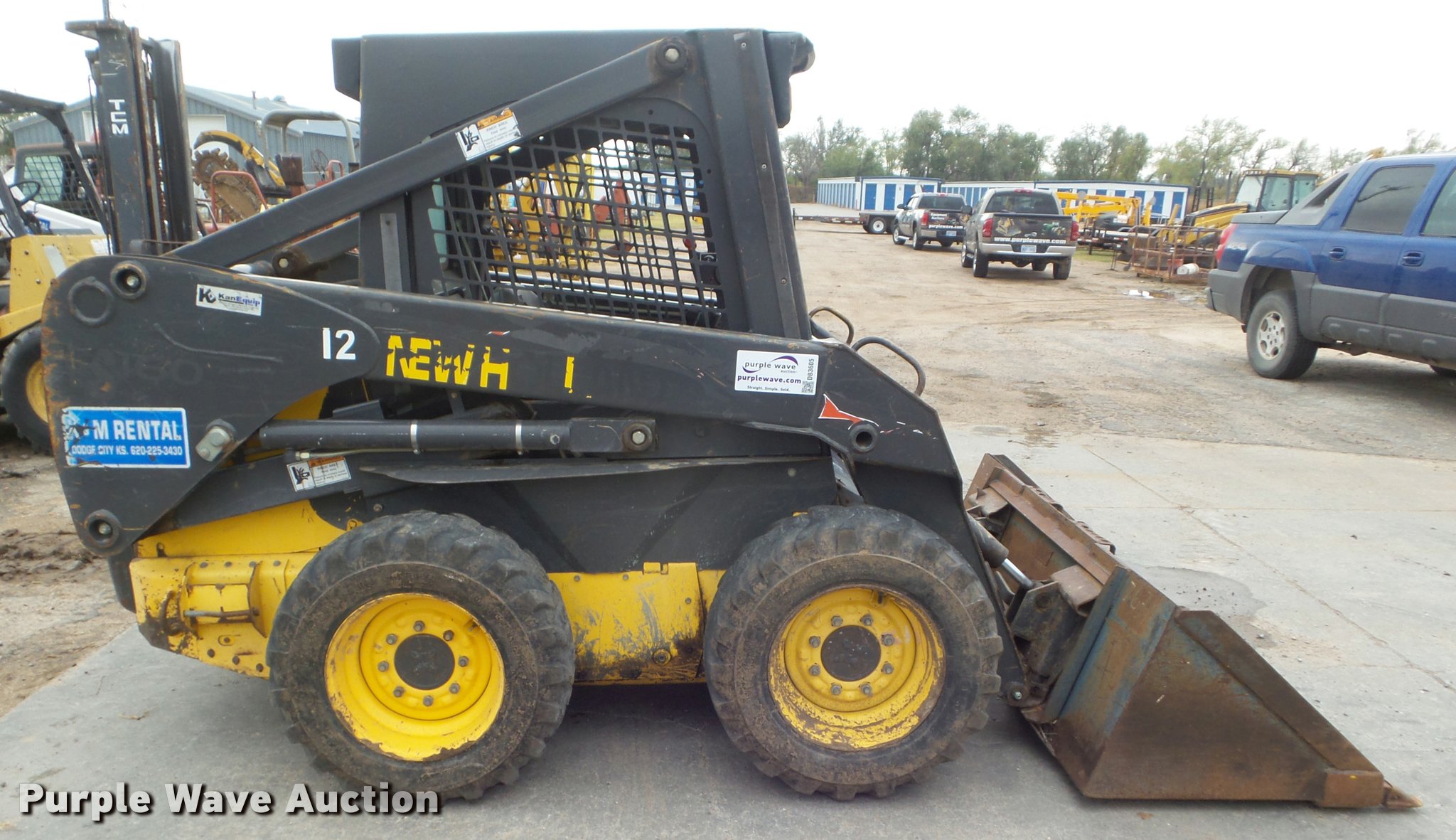 2006 New Holland LS160 skid steer. 1,688 hours on meter, New Holland four cylinder diesel engine, Hydrostatic transmission, Open station/canopy Hand and foot controls, Spring suspension seat, Front and rear work lights, 67"W bucket Weld-on cutting edge, Manual quick coupler, 10-16.5 tires, Hydraulic oil pressure sensor needs replaced, Serial LMU029918. K & M Rental. 1203 W. McArtor Road. Dodge City, KS 67801