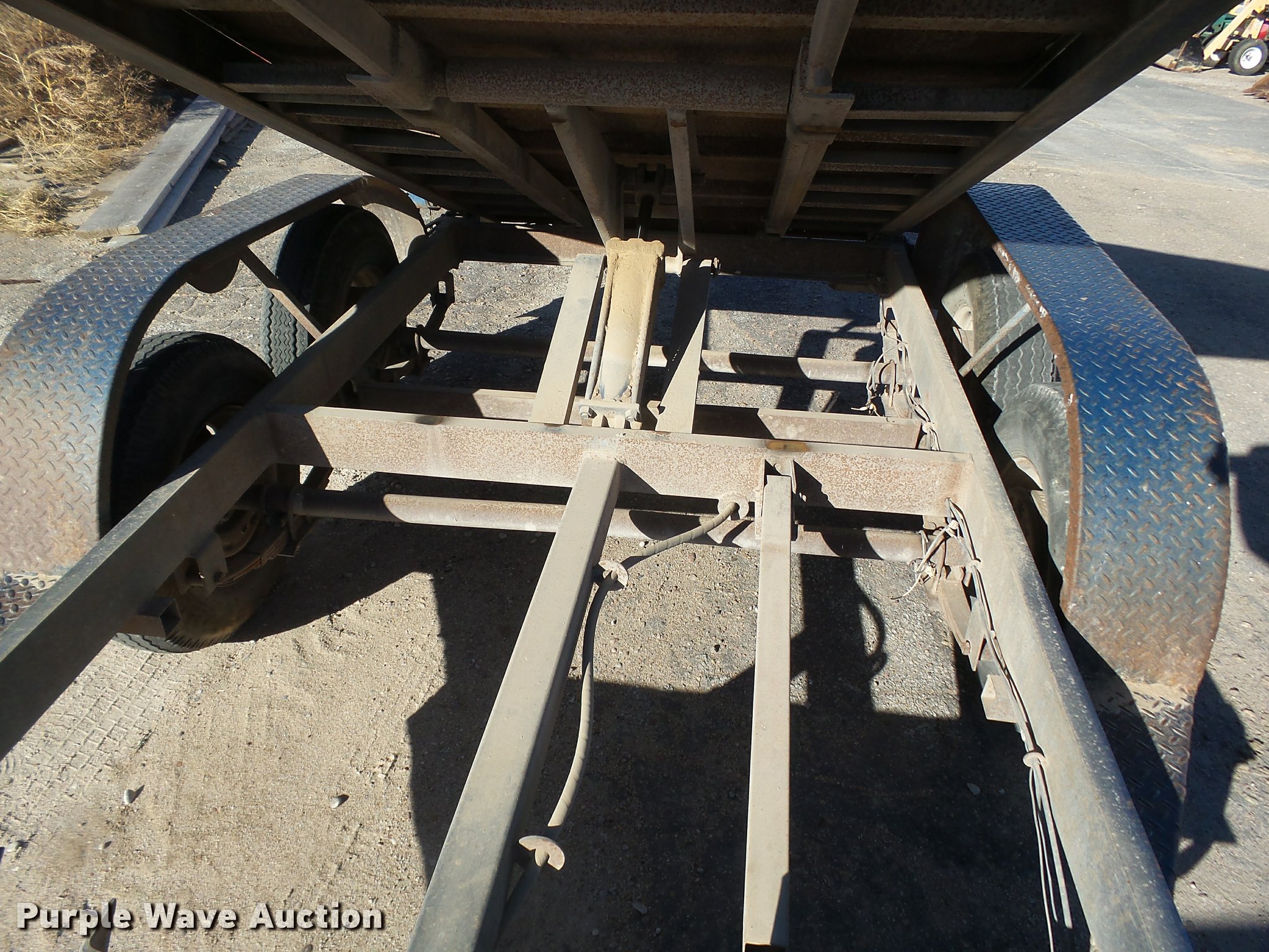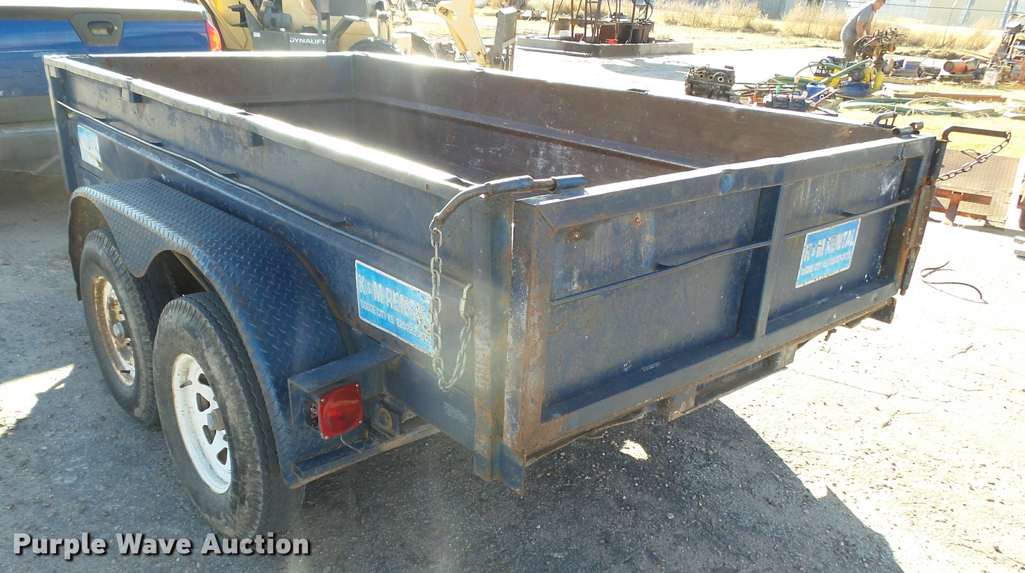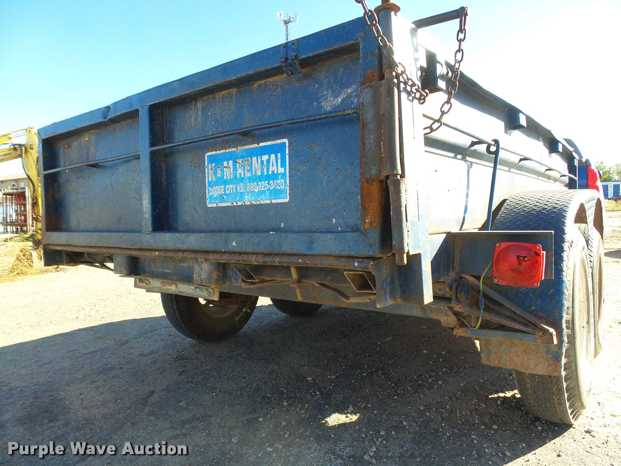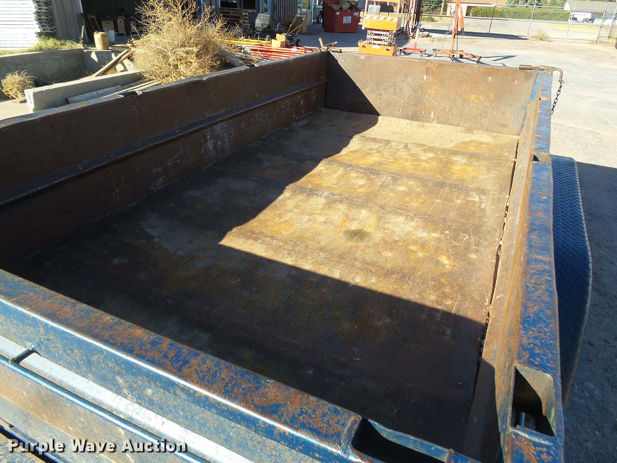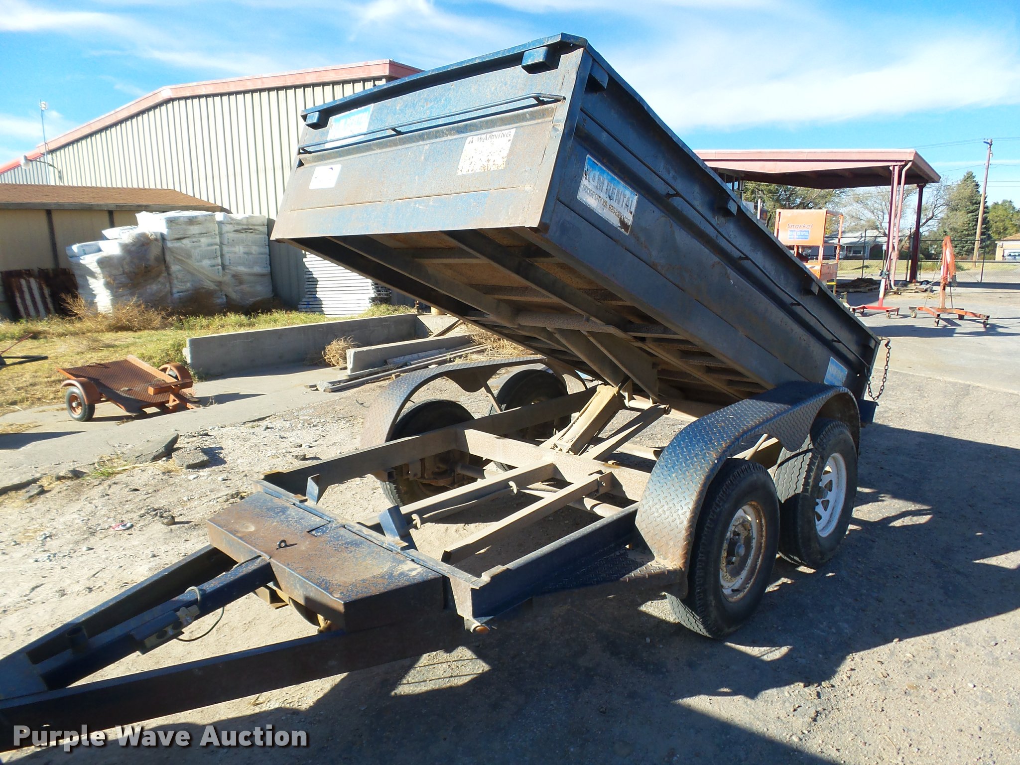 Purple Wave is selling a used Dump Trailer in Kansas. This item is a 1997 Big Tex dump trailer with the following: 15.5' overall length, 10.5'L x 64"W, 24" floor height, 18" side height, Steel construction, Single ram hoist, End gate, Trailer controls, Electric over hydraulic dump, Single leg landing gear, 2" ball hitch, Tandem axle, Spring suspension, Steel wheels, 7.00-15 tires