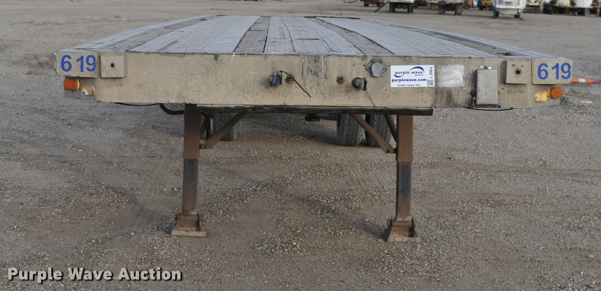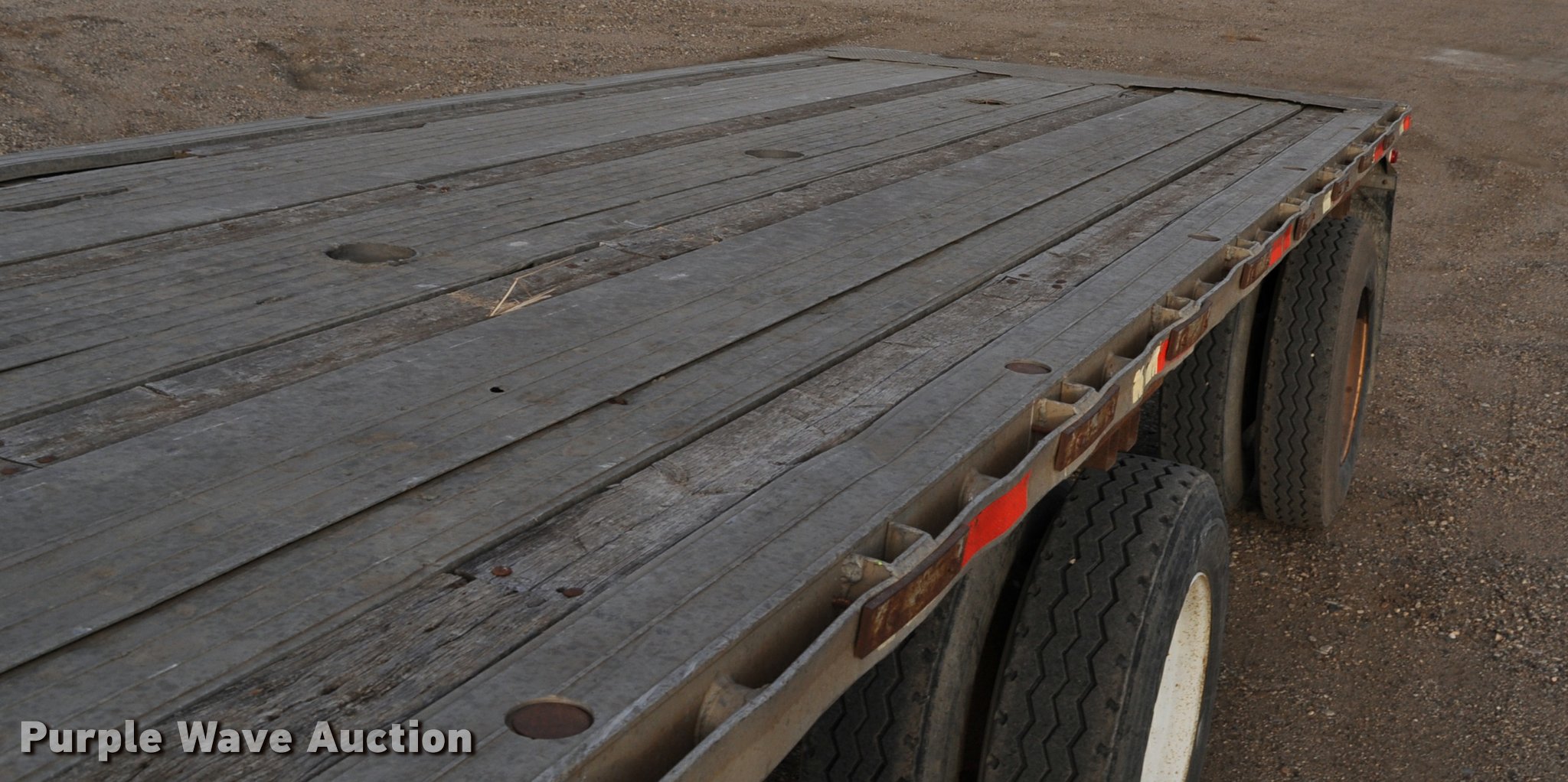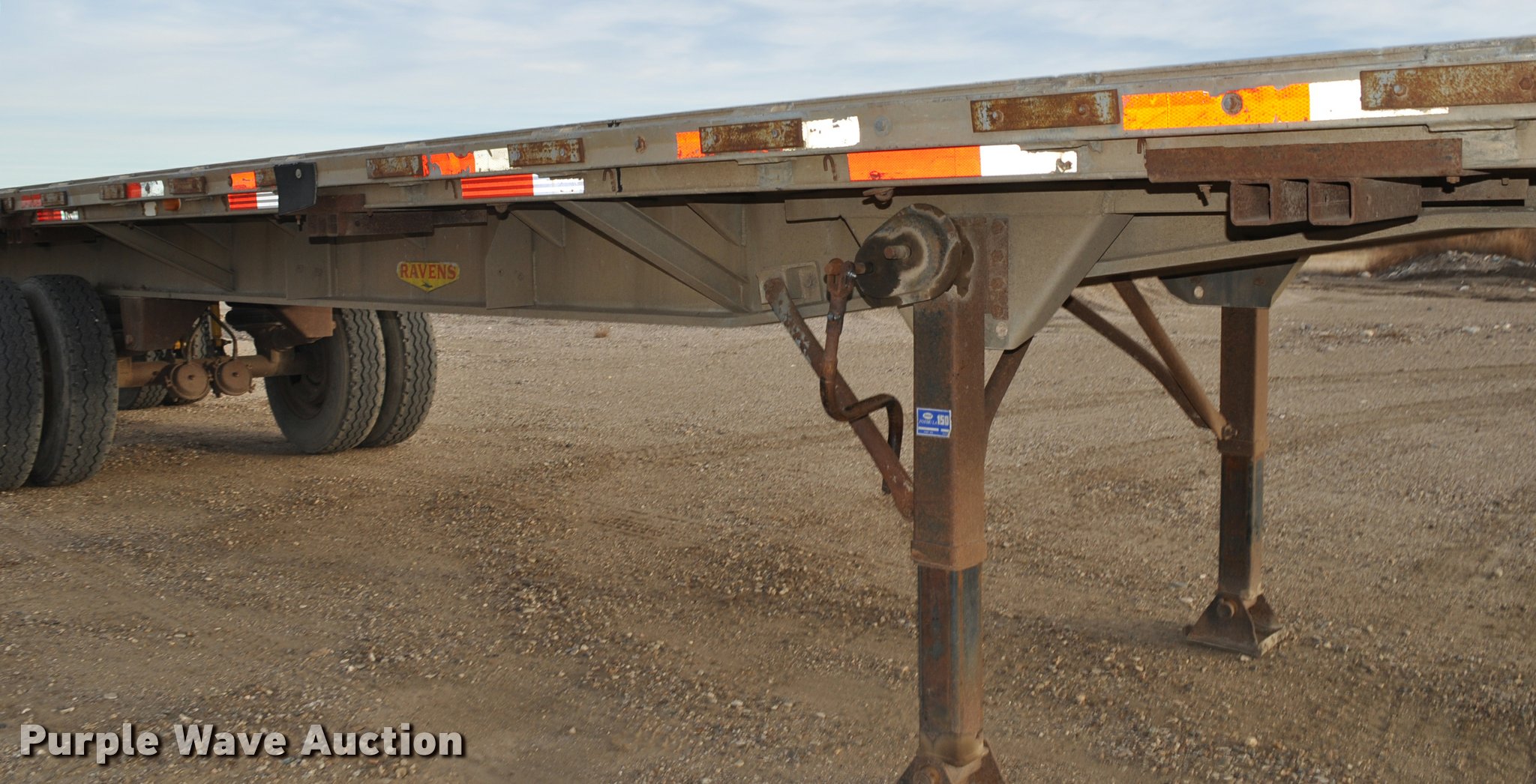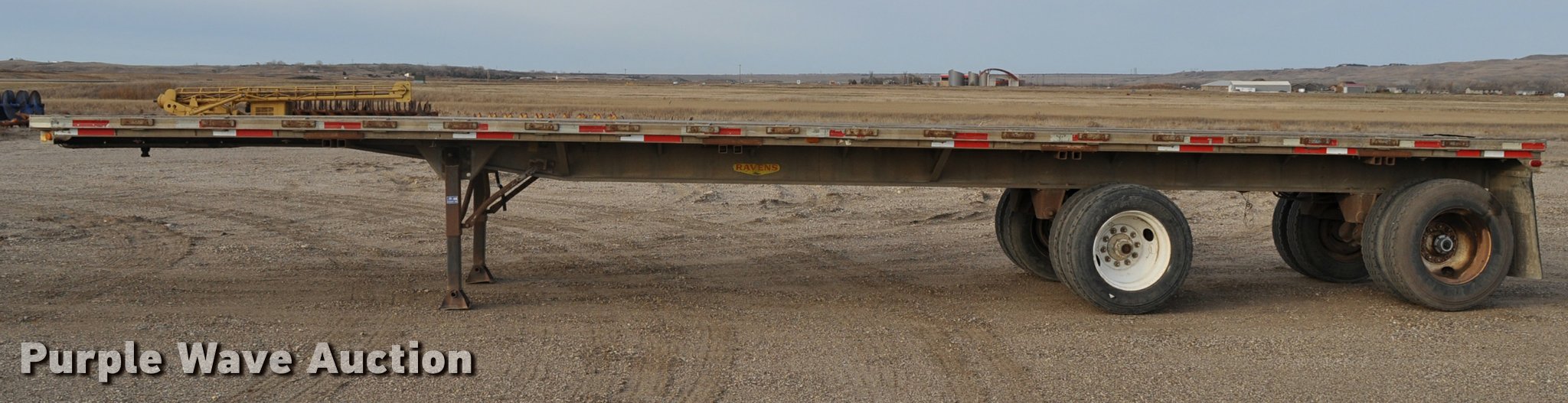 Purple Wave is selling a used Flat or Drop Deck Trailer in South Dakota. This item is a 1977 Raven 54028 flatbed trailer with the following: 40'L x 96"W wood deck, Stake side pockets, Dual leg two speed landing gear, Fifth wheel plate, Spread axle, Air suspension, Air brakes, 24.5 tires, Unit# 619