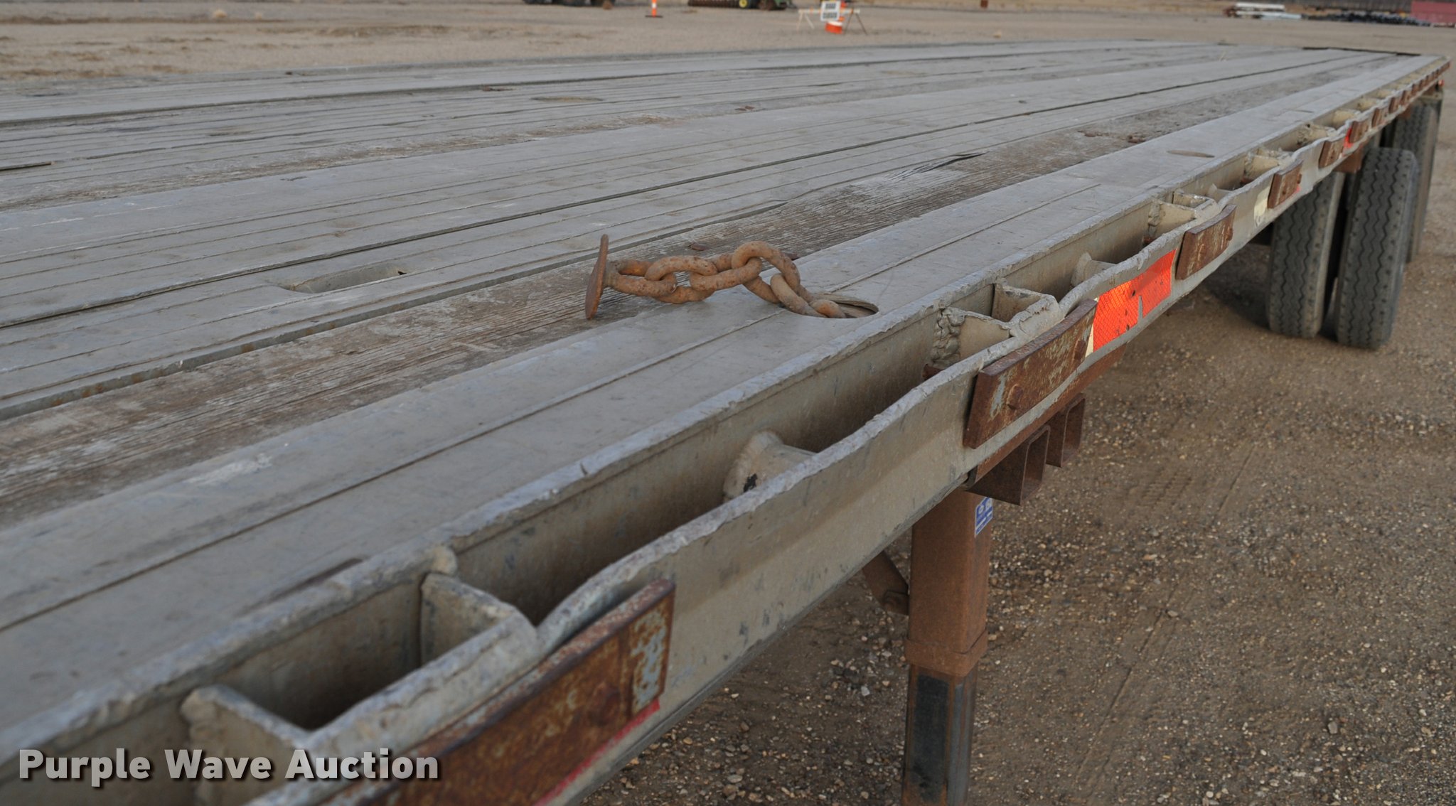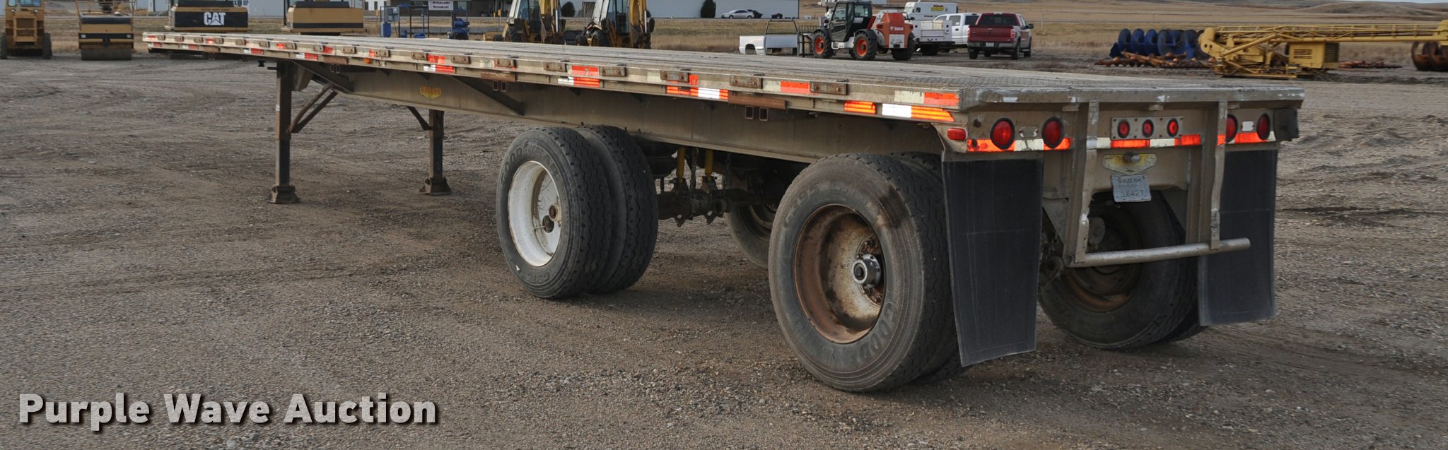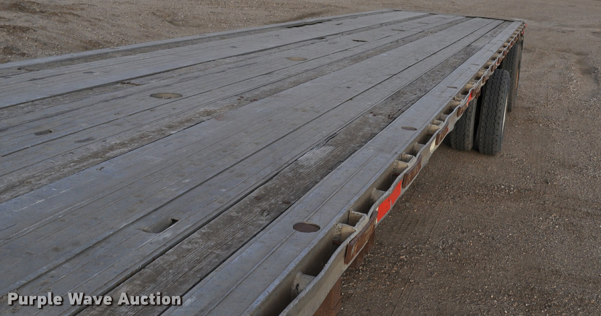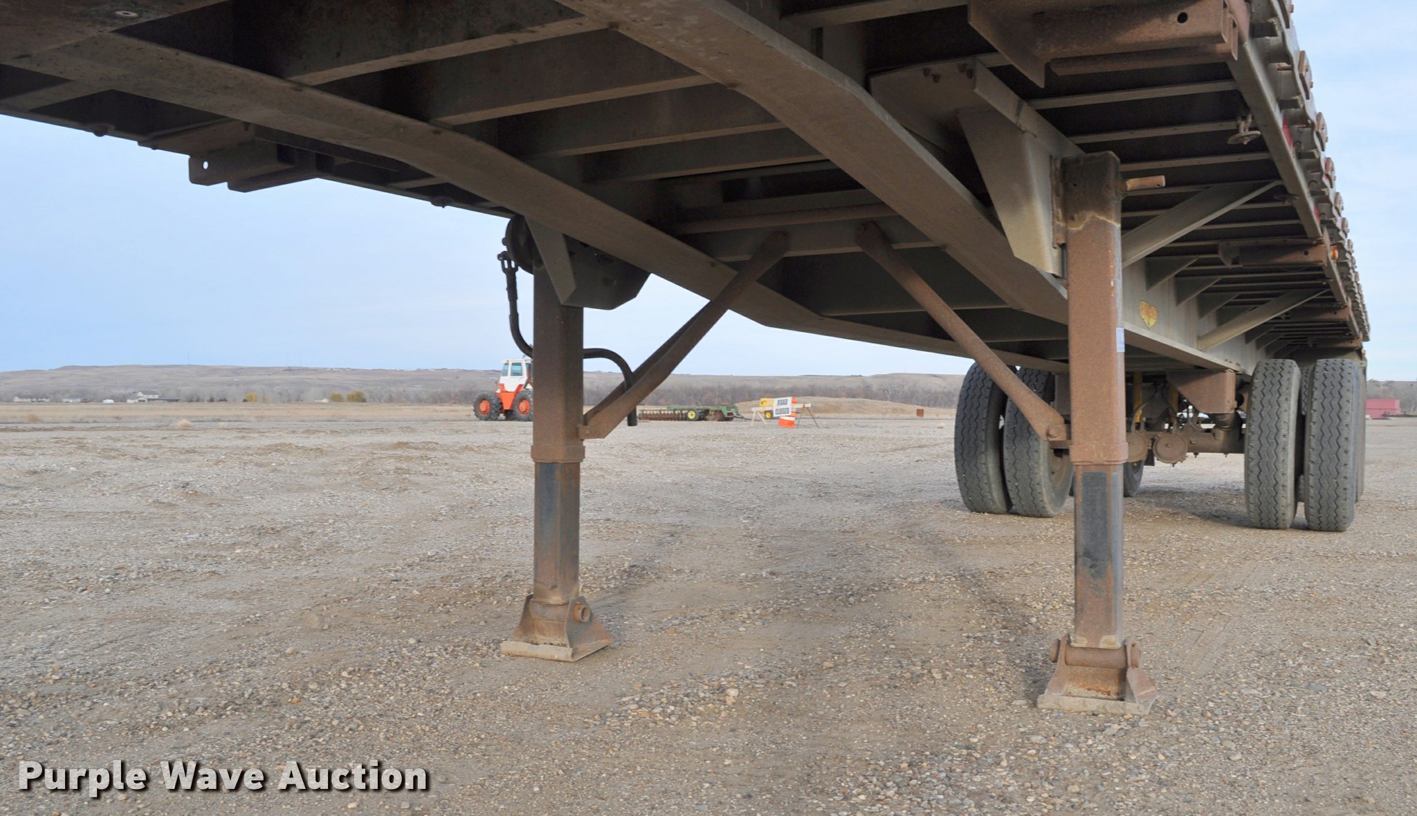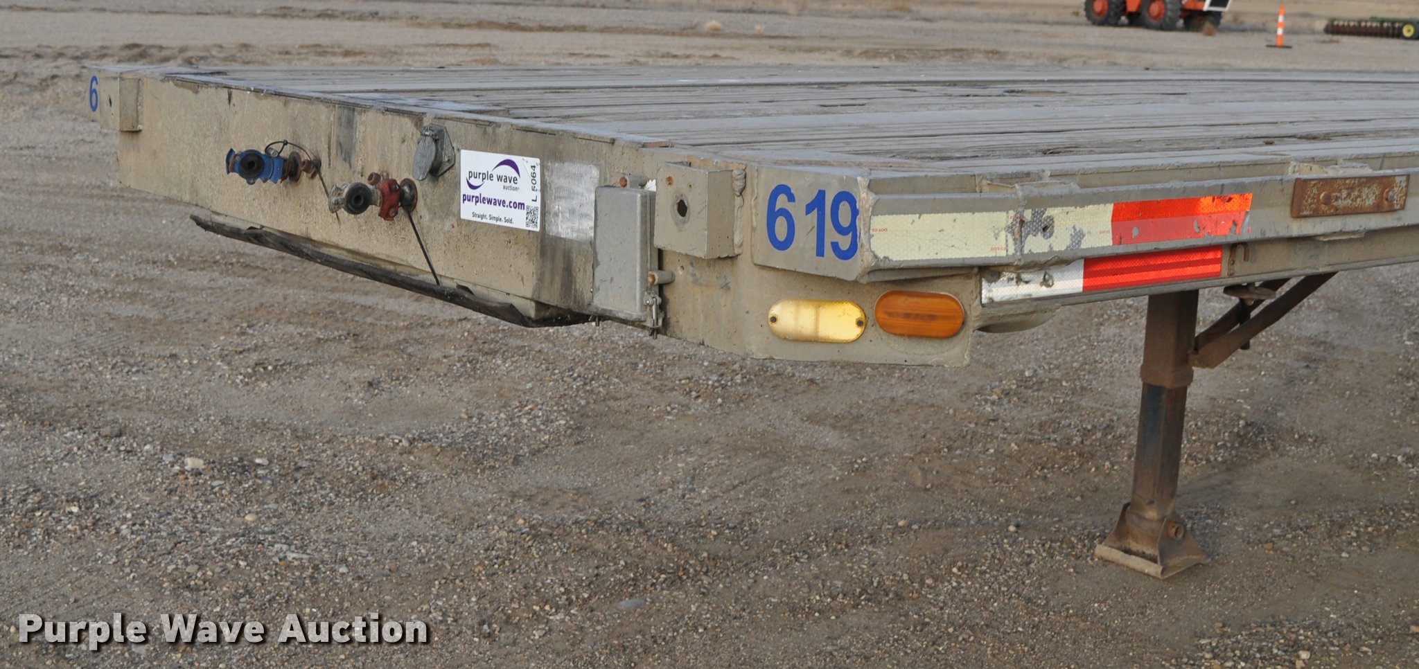 Purple Wave is selling a used Flat or Drop Deck Trailer in South Dakota. This item is a 1977 Raven 54028 flatbed trailer with the following: 40'L x 96"W wood deck, Stake side pockets, Dual leg two speed landing gear, Fifth wheel plate, Spread axle, Air suspension, Air brakes, 24.5 tires, Unit# 619