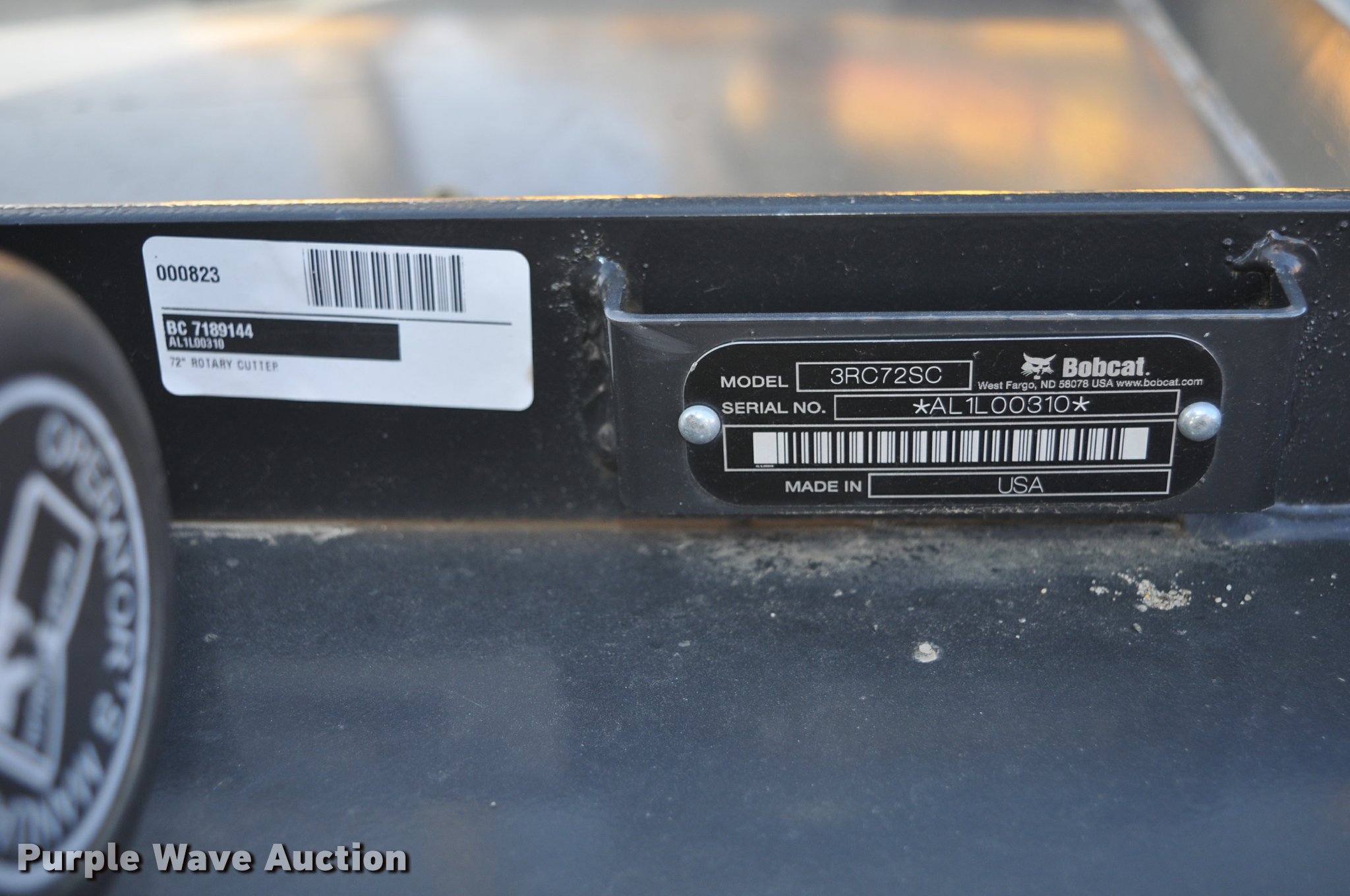 Purple Wave is selling a used Mower, Cutter, Shredder in South Dakota. This item is a 2013 Bobcat 3RC72SC rotary mower with the following: 72" cutting capacity, Chain guards, 540 PTO, Three point, Solid gauge wheel, Unused, Serial AL1L00310, Unit# 00823