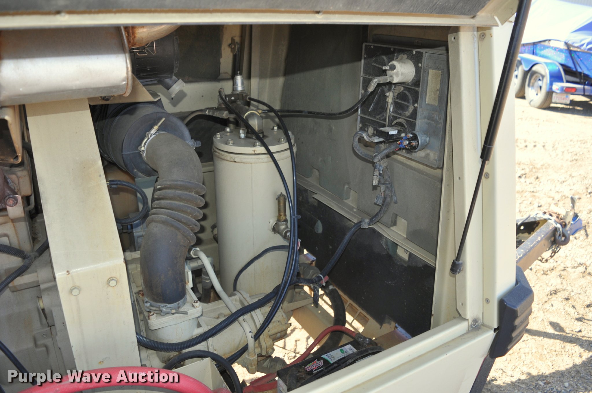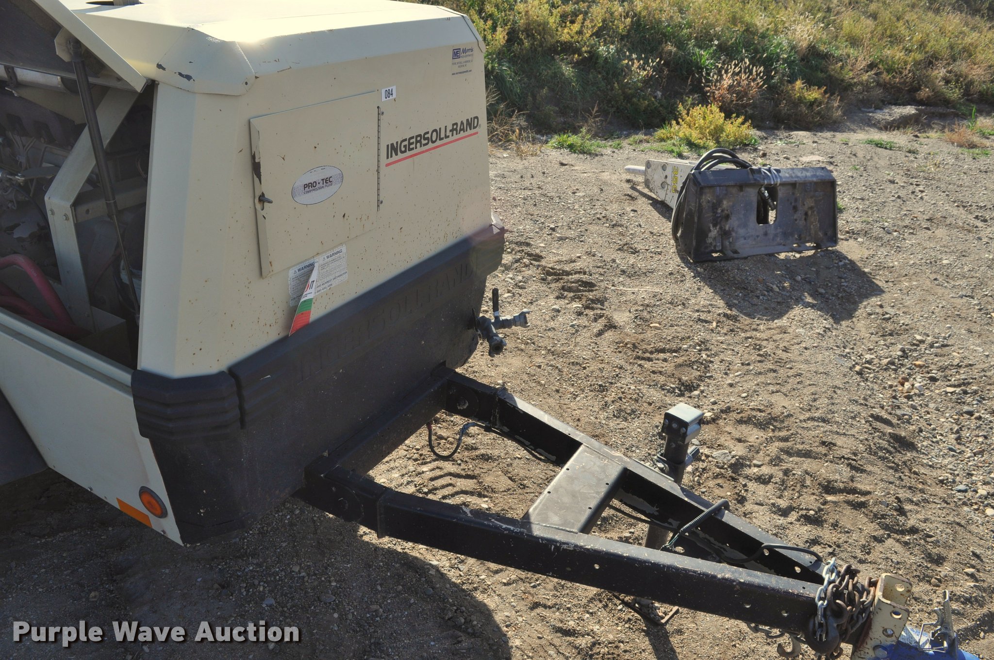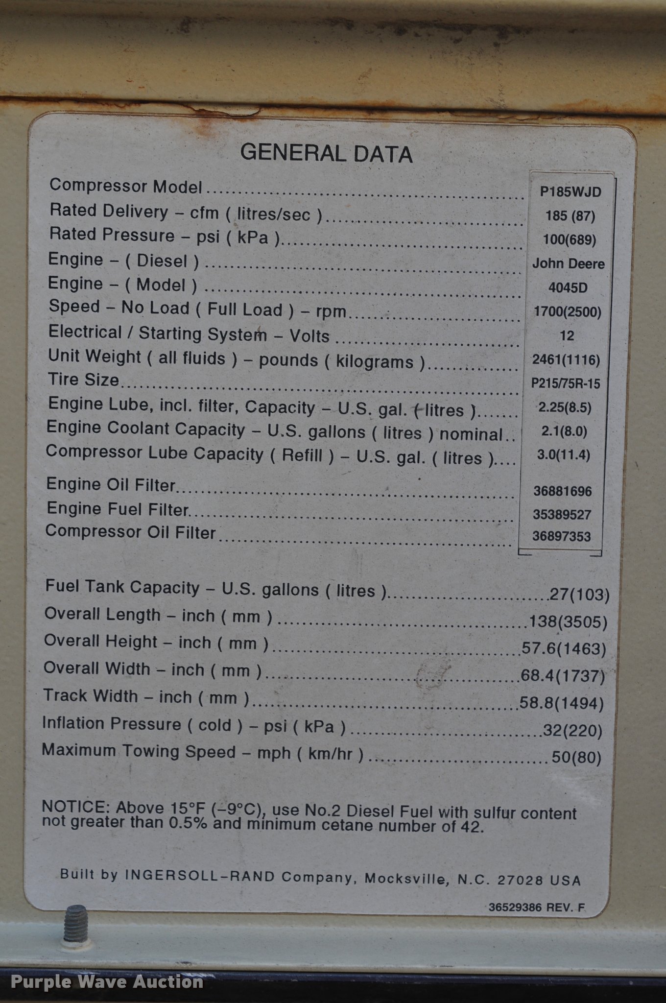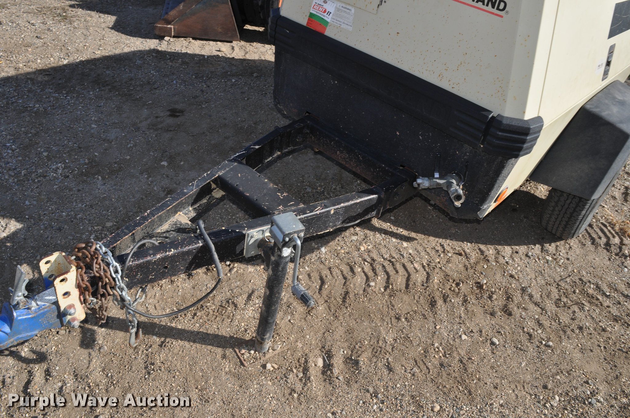 Purple Wave is selling a used Air Compressor in South Dakota. This item is a 1999 Ingersoll Rand P185WJD air compressor with the following: 391 hours on meter, John Deere 4045DF150 4.5L four cylinder diesel engine, 80 HP, Serial PE4045D054147, Electric start, Fuel tank, 185 CFM, 100 psi, 2" ball hitch, 205/75R15 tires, Serial 304432UIJ221, Unit# 000084