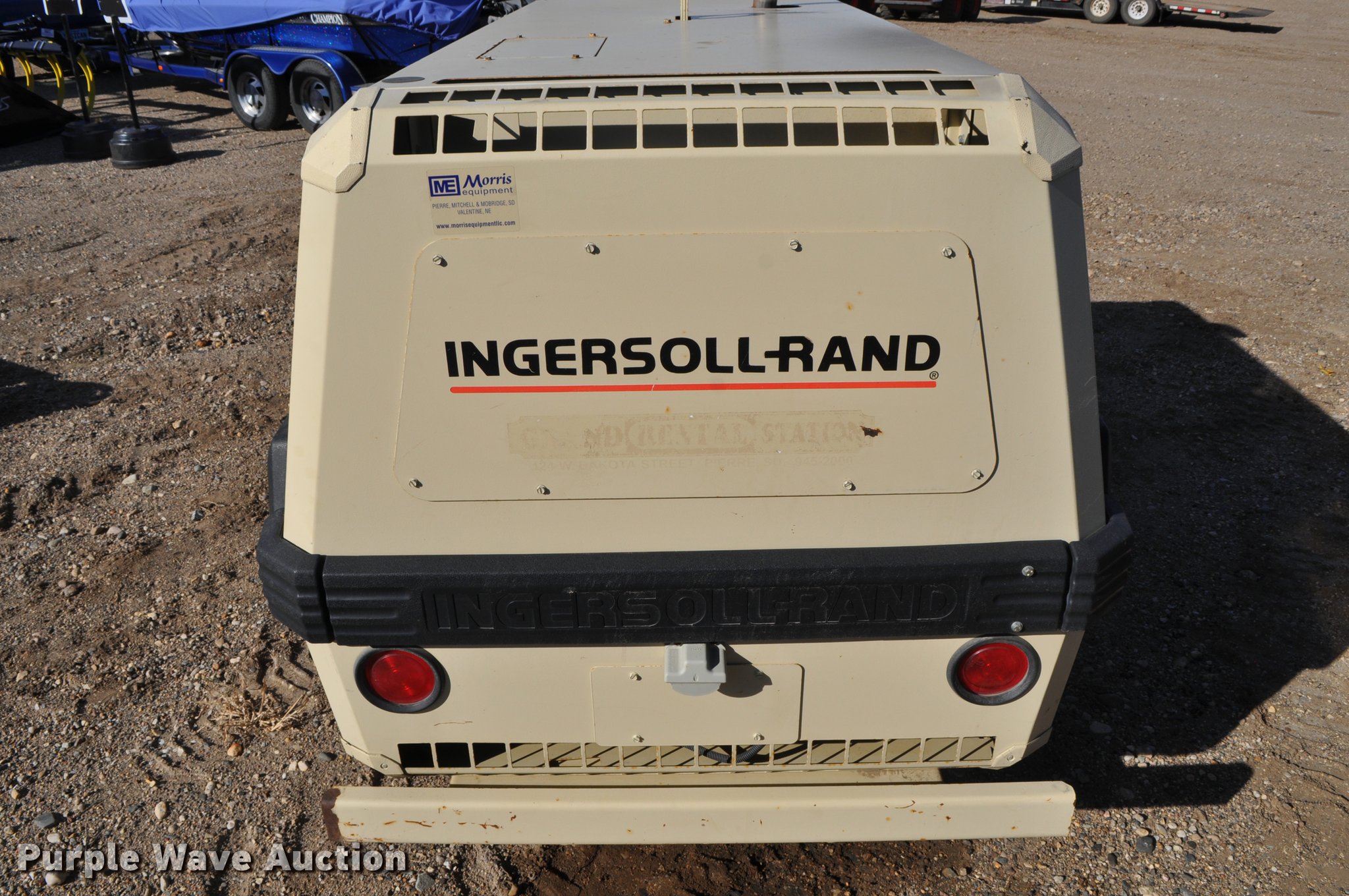 1999 Ingersoll Rand P185WJD air compressor. 391 hours on meter, John Deere 4045DF150 4.5L four cylinder diesel engine 80 HP, Serial PE4045D054147, Electric start, Fuel tank, 185 CFM, 100 psi, 2" ball hitch, 205/75R15 tires, Serial 304432UIJ221, Unit# 000084. Transfer of ownership documentation will be a bill of sale. Morris Equipment. 1908 N. Garfield. Pierre, SD 57501