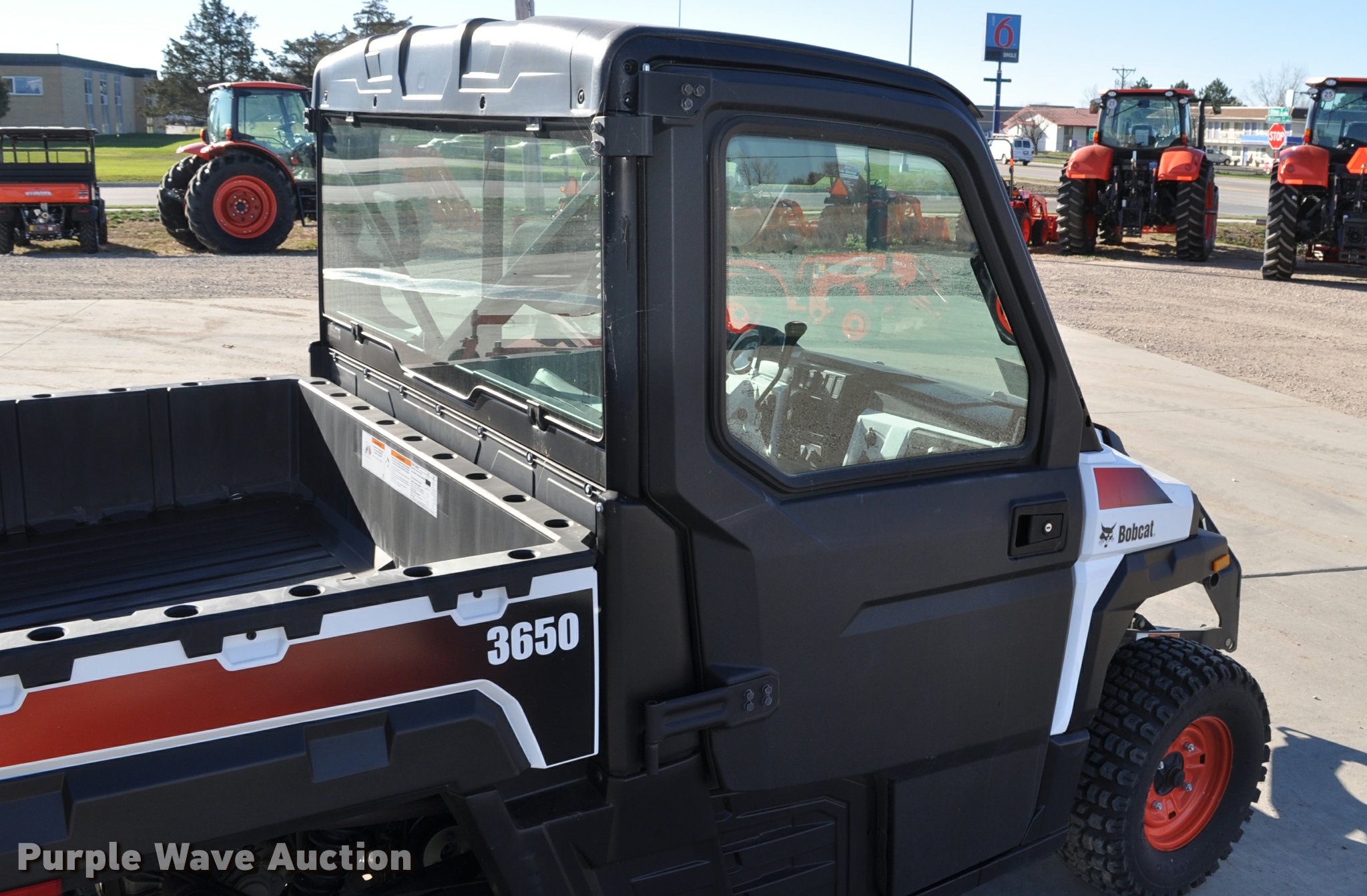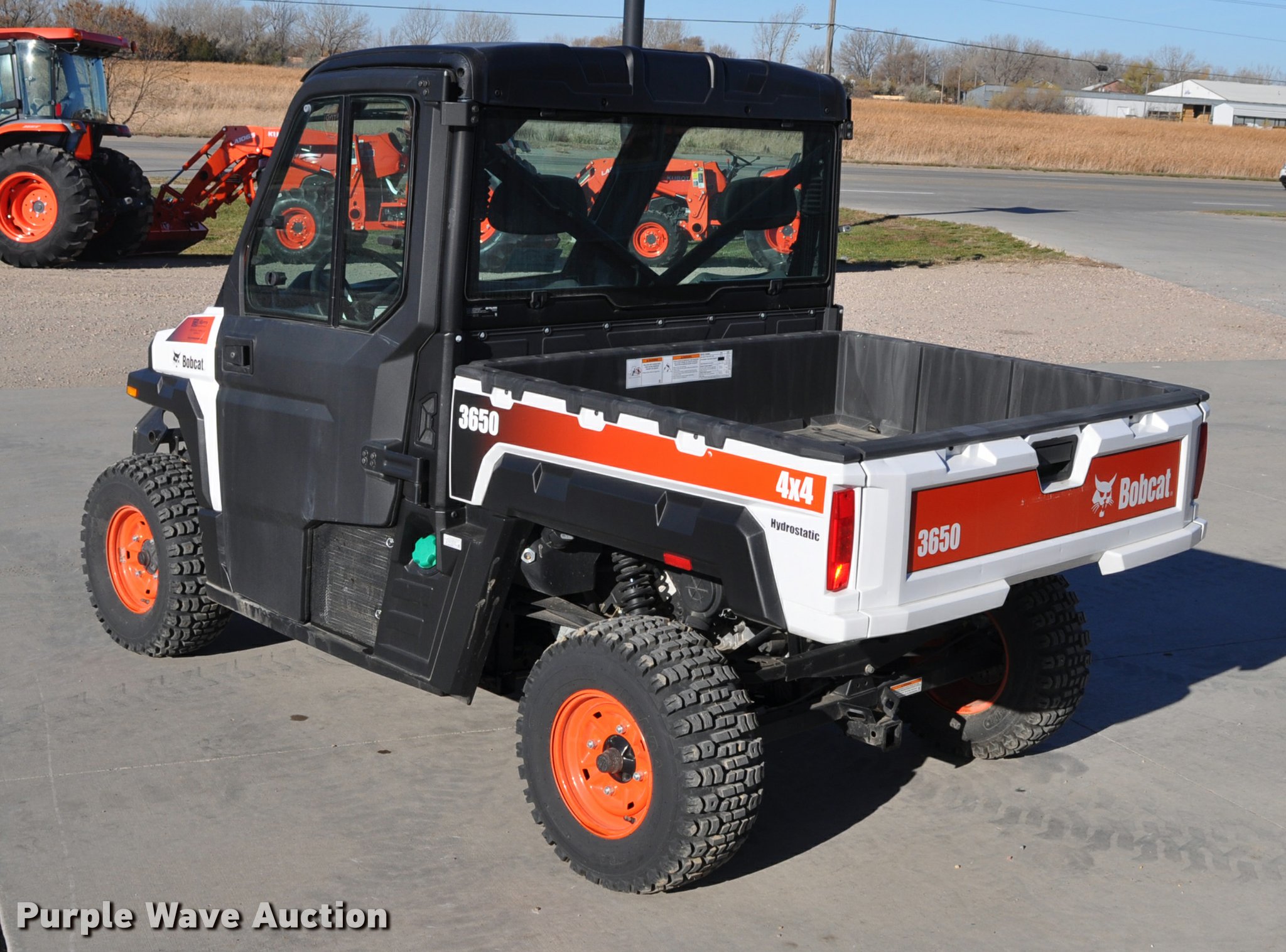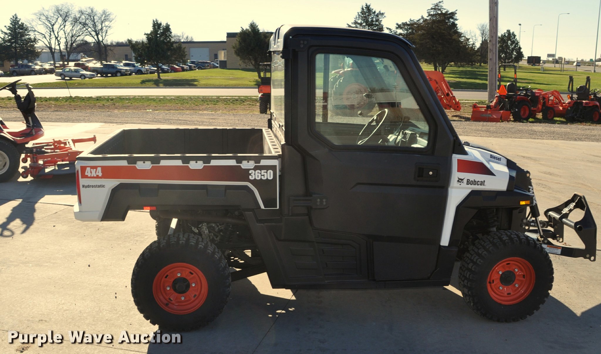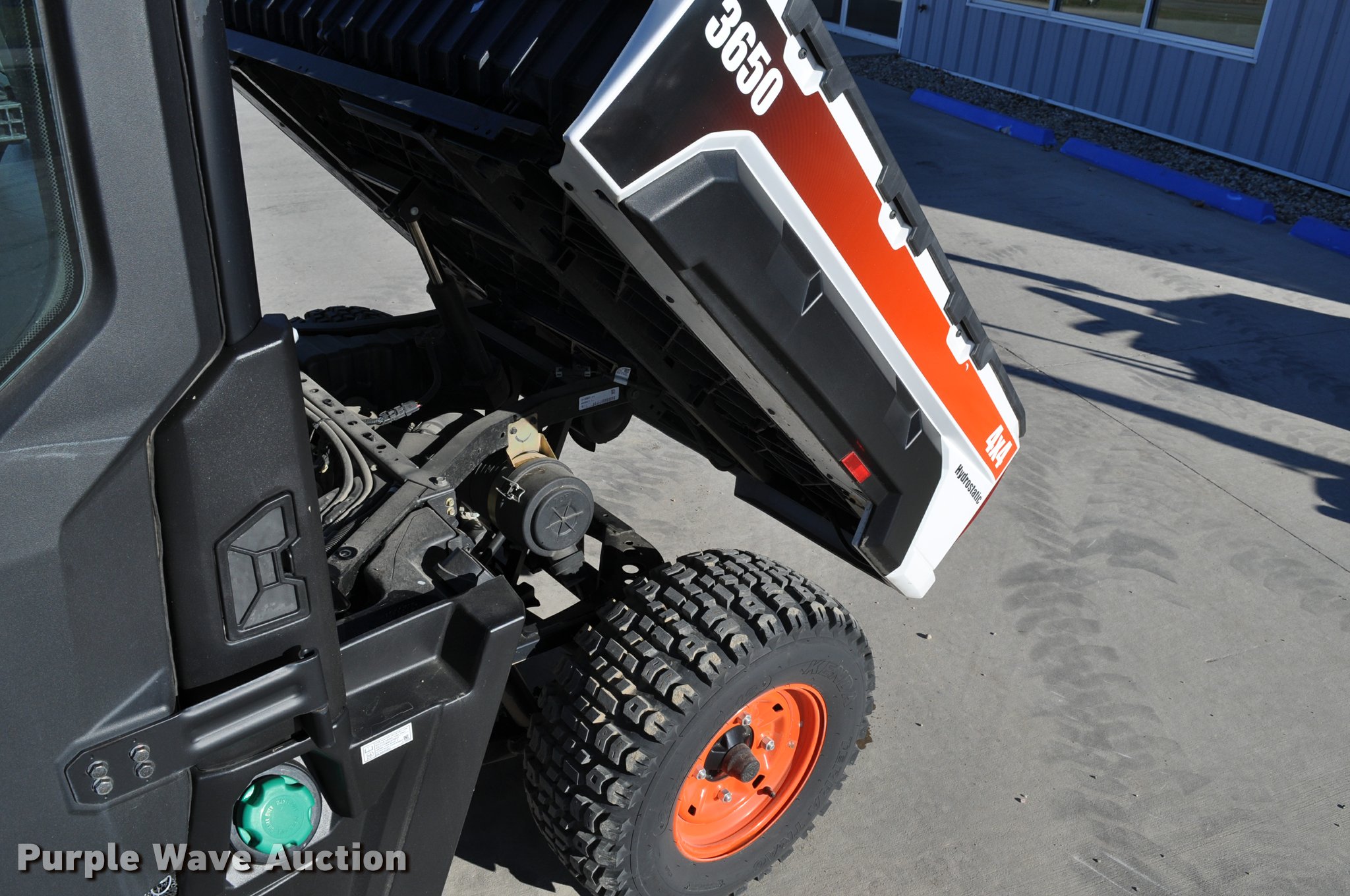 Purple Wave is selling a used Utility Vehicle in South Dakota. This item is a 2013 Bobcat 3650 utility vehicle with the following: 12 hours on meter, 21 miles on odometer, Yanmar 0.904L diesel engine, 25 HP, Two speed hydrostatic transmission, Four wheel drive, Enclosed cab, AC and heat, Wipers, Tool carrier, Auxiliary hydraulics, Electric over hydraulic dump bed, Receiver hitch, 25 x 10-12 tires, Serial 4XAAVW4A5D7011186, Unit# 000819