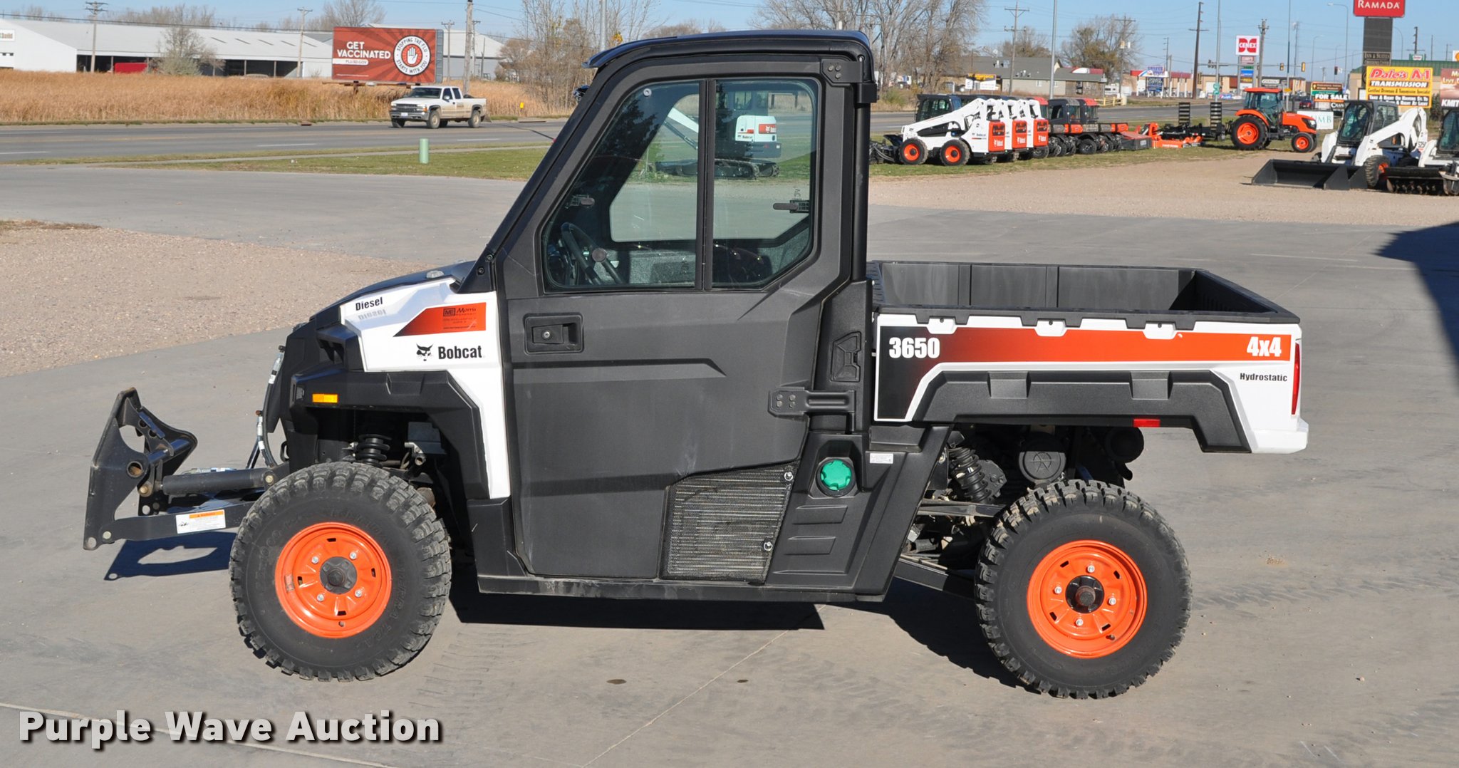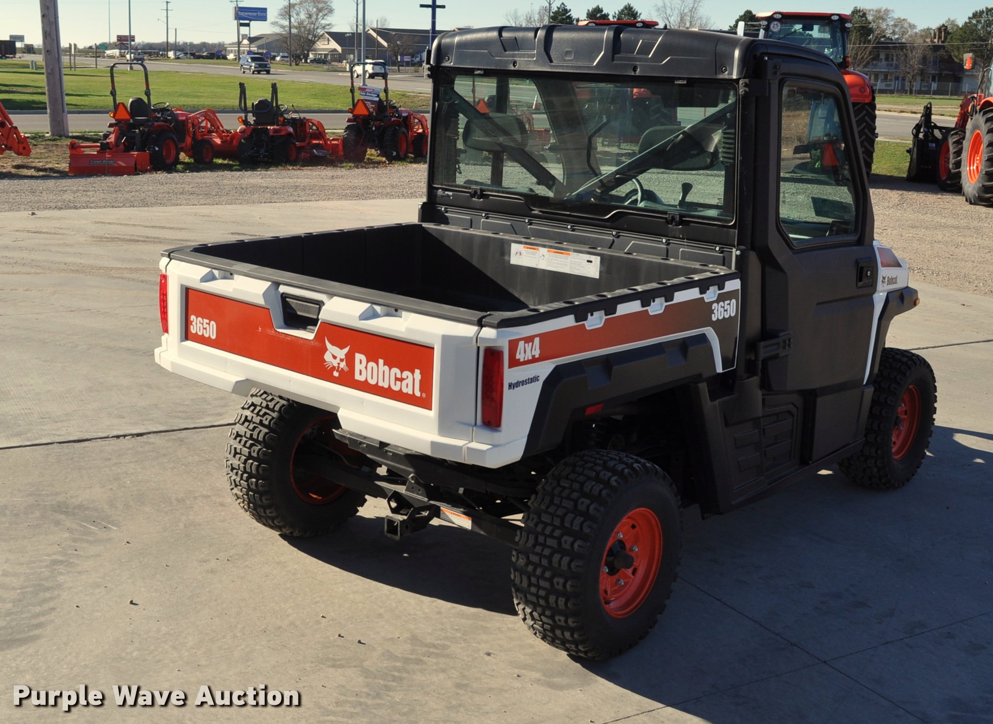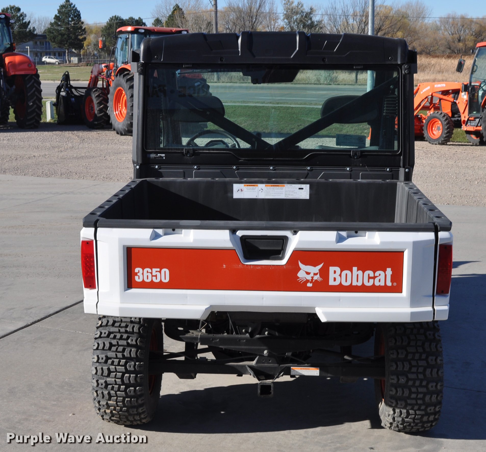 Purple Wave is selling a used Utility Vehicle in South Dakota. This item is a 2013 Bobcat 3650 utility vehicle with the following: 12 hours on meter, 21 miles on odometer, Yanmar 0.904L diesel engine, 25 HP, Two speed hydrostatic transmission, Four wheel drive, Enclosed cab, AC and heat, Wipers, Tool carrier, Auxiliary hydraulics, Electric over hydraulic dump bed, Receiver hitch, 25 x 10-12 tires, Serial 4XAAVW4A5D7011186, Unit# 000819