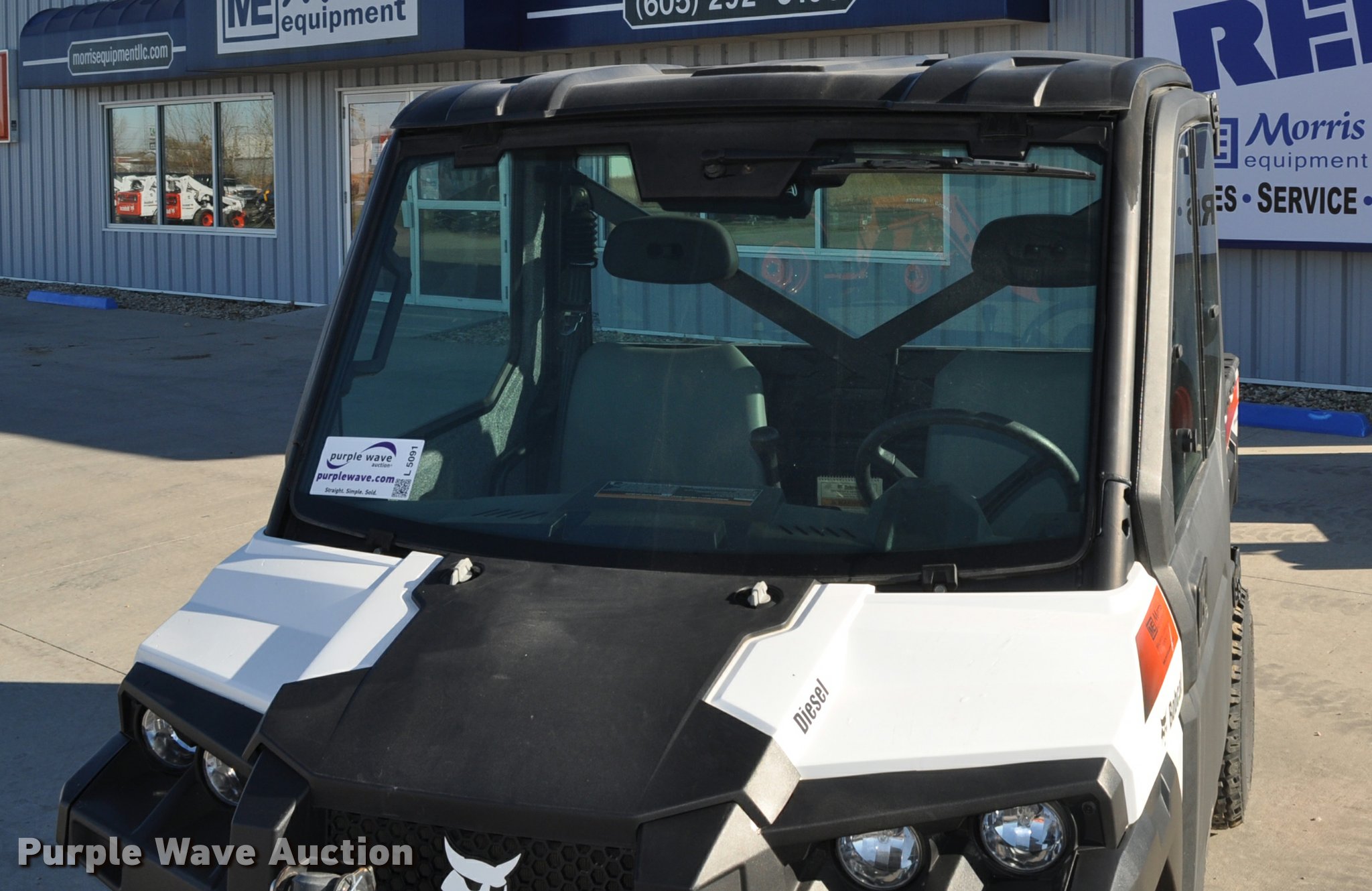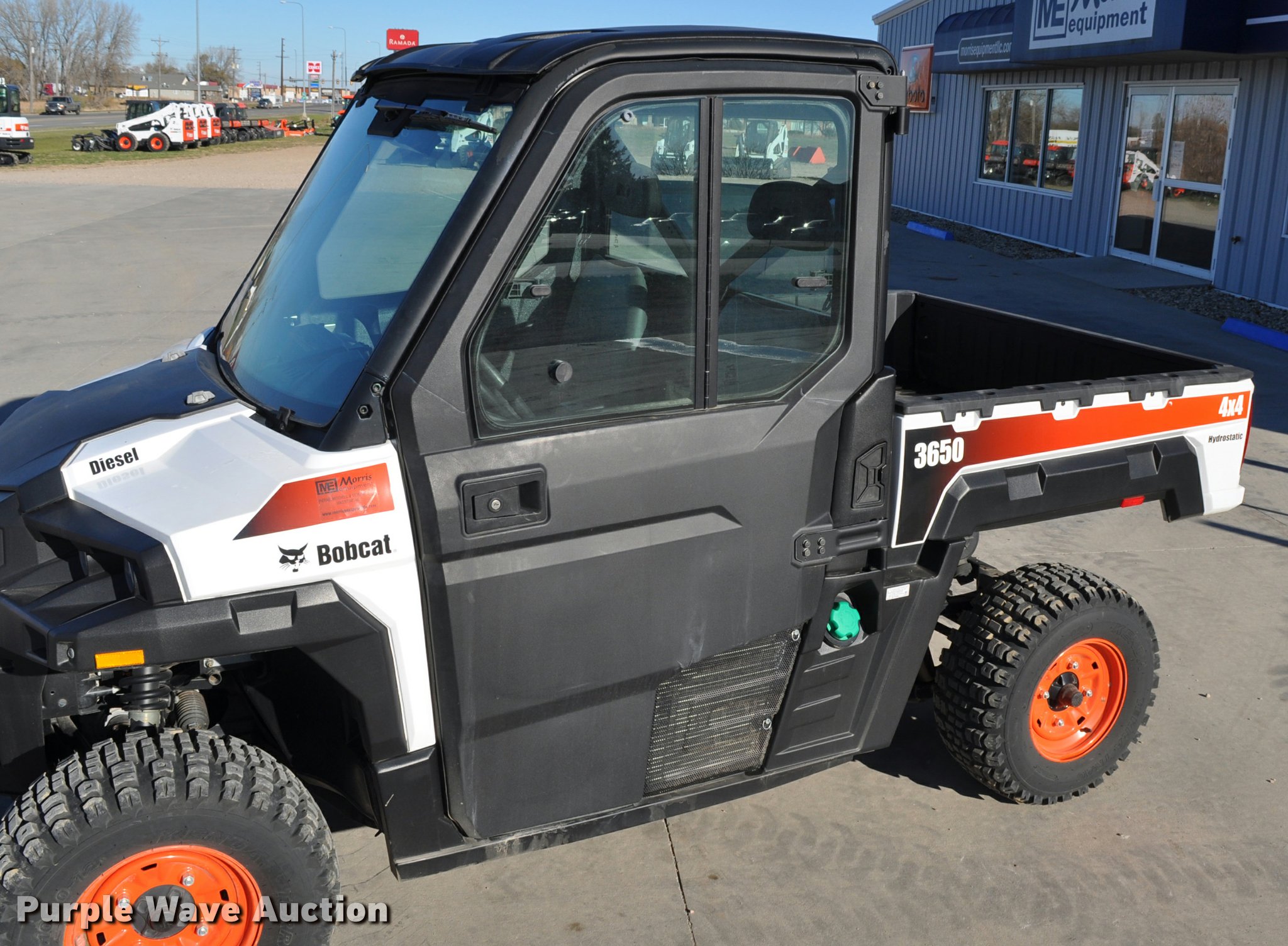 2013 Bobcat 3650 utility vehicle. 12 hours on meter, 21 miles on odometer, Yanmar 0.904L diesel engine 25 HP, Two speed hydrostatic transmission, Four wheel drive, Enclosed cab, AC and heat, Wipers, Tool carrier, Auxiliary hydraulics, Electric over hydraulic dump bed, Receiver hitch, 25 x 10-12 tires, Serial 4XAAVW4A5D7011186, Unit# 000819. Seller is a South Dakota licensed motor vehicle dealer. The buyer may be required to pay sales tax and/or registration fees to the dealer prior to taking possession. Title will be assigned and distributed by the dealer. Please contact the seller for distribution questions. 4XAAVW4A5D7011186. Morris Equipment. 1210 S. Ohlman Street. Mitchell, SD 57301