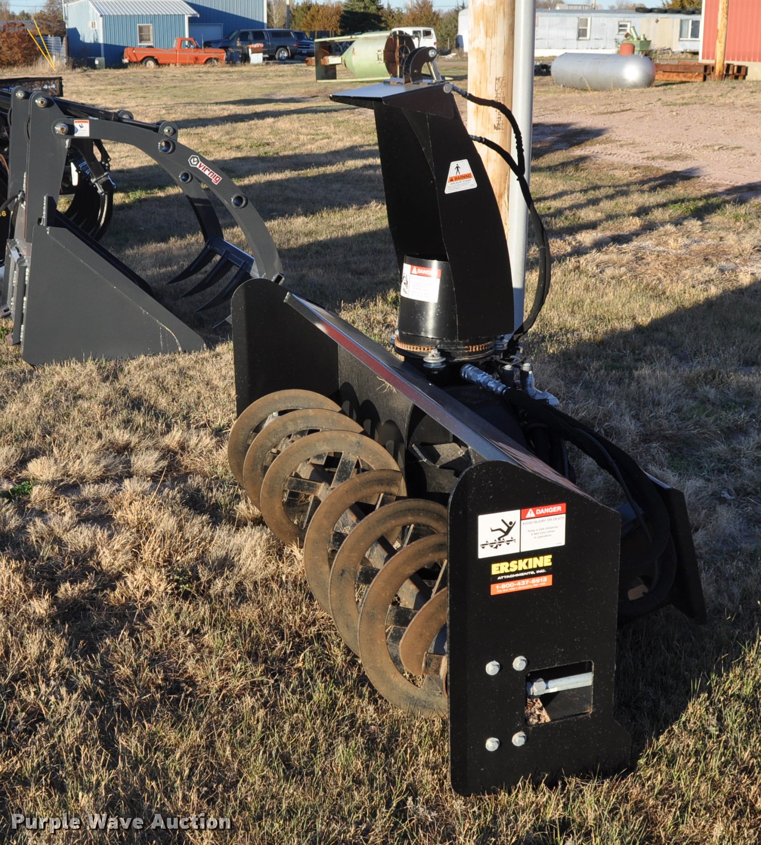 Purple Wave is selling a used Skid Steer Attach. in Nebraska. This item is a Erskine 2410FM skid steer snow blower with the following: 84"W, Hydraulic rotate and deflect, Unused, Serial 1031826, Unit# 00393