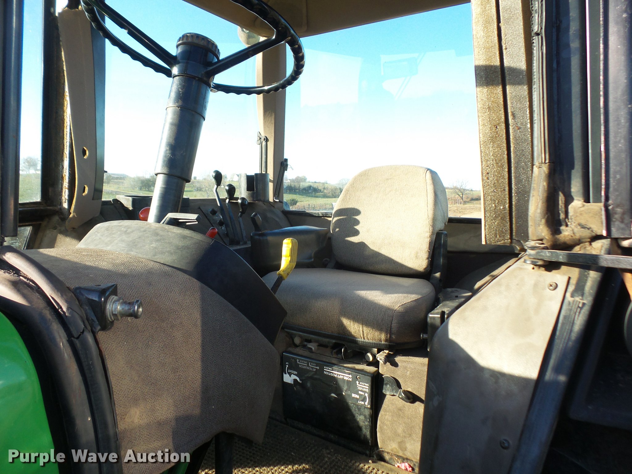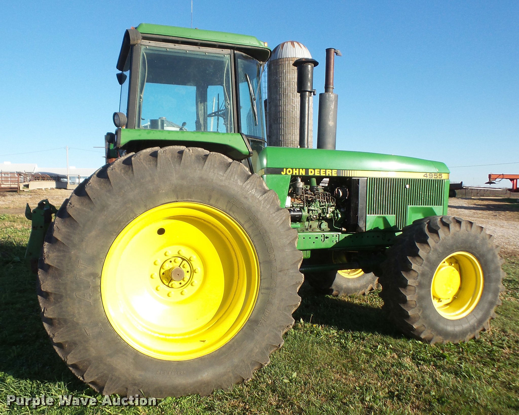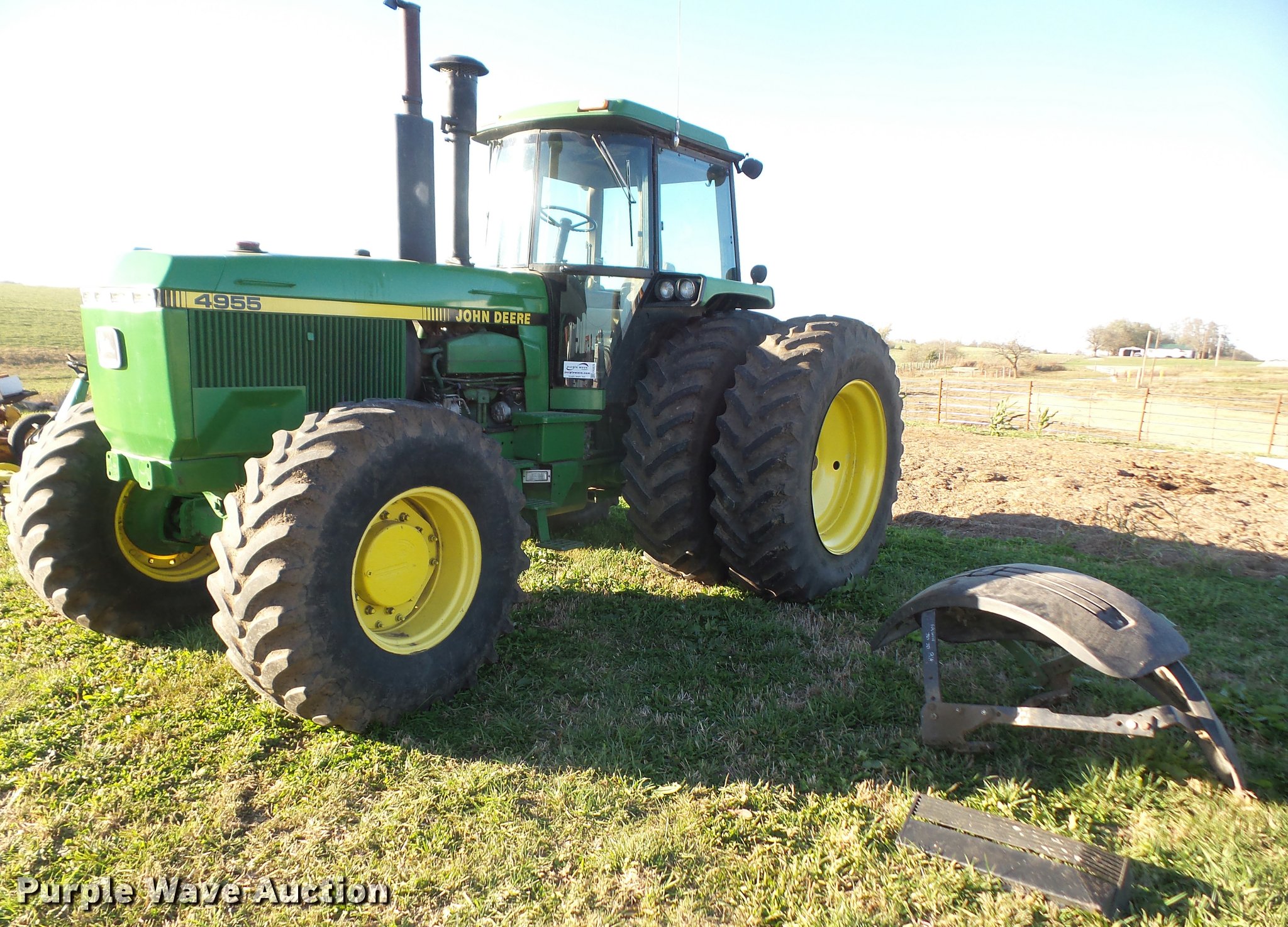 Purple Wave is selling a used Tractor in Kansas. This item is a 1989 John Deere 4955 MFWD tractor with the following: 8,054 hours on meter, John Deere 6076 7.6L six cylinder turbo diesel engine, 200 HP, Serial RG6076A117375, Powershift transmission, 15F-4R gears, AC and heat, Tilt steering wheel, AM/FM, Suspension seat, Three point, Top link, Quick attach, Seven pin outlet, Large 1000 PTO, (3) rear hydraulic remote sets, 18.4R28 front tires, 520/85R42 dual rear tires, Fenders included, In-frame overhaul, Serial RW4955P002961