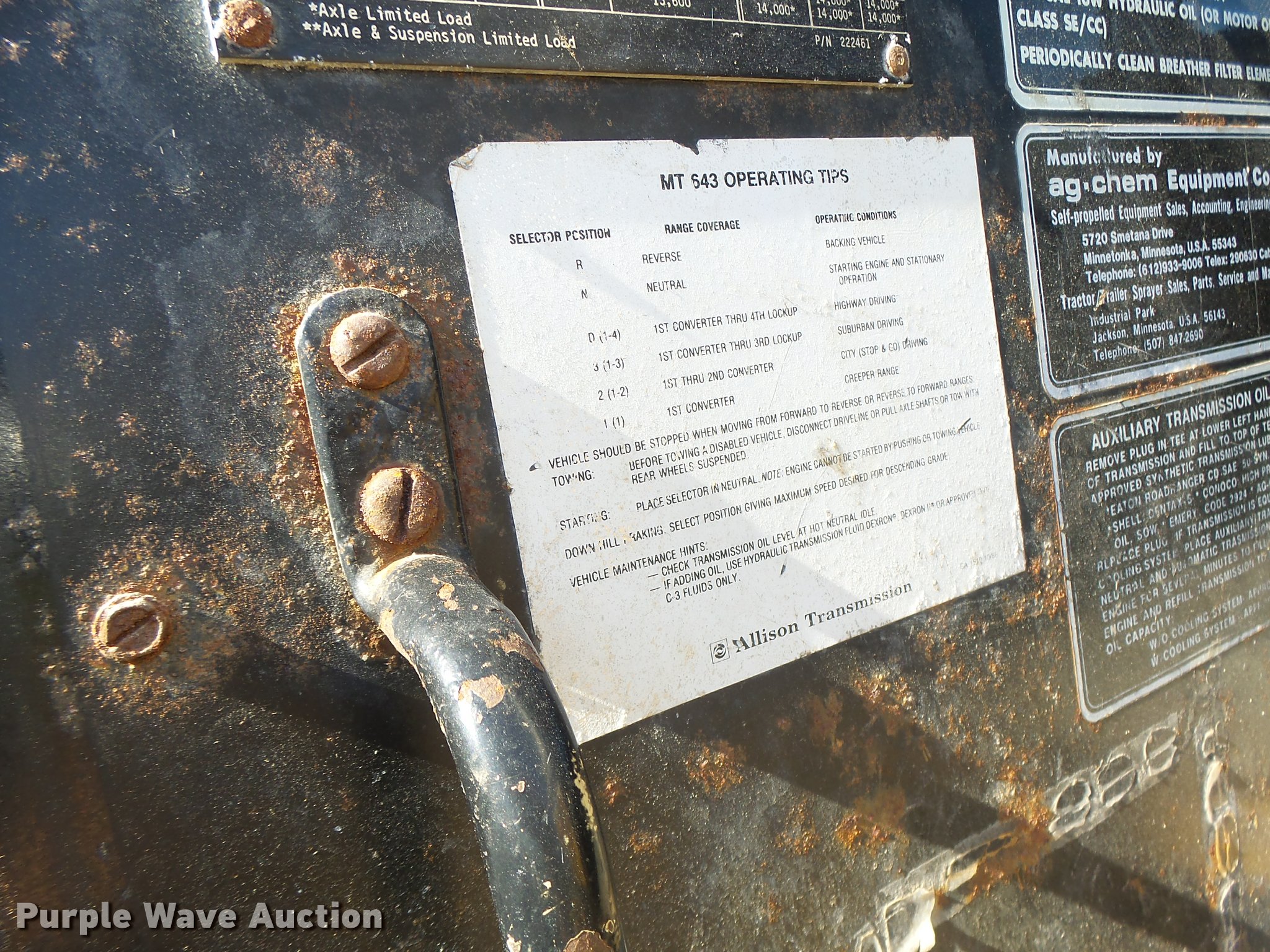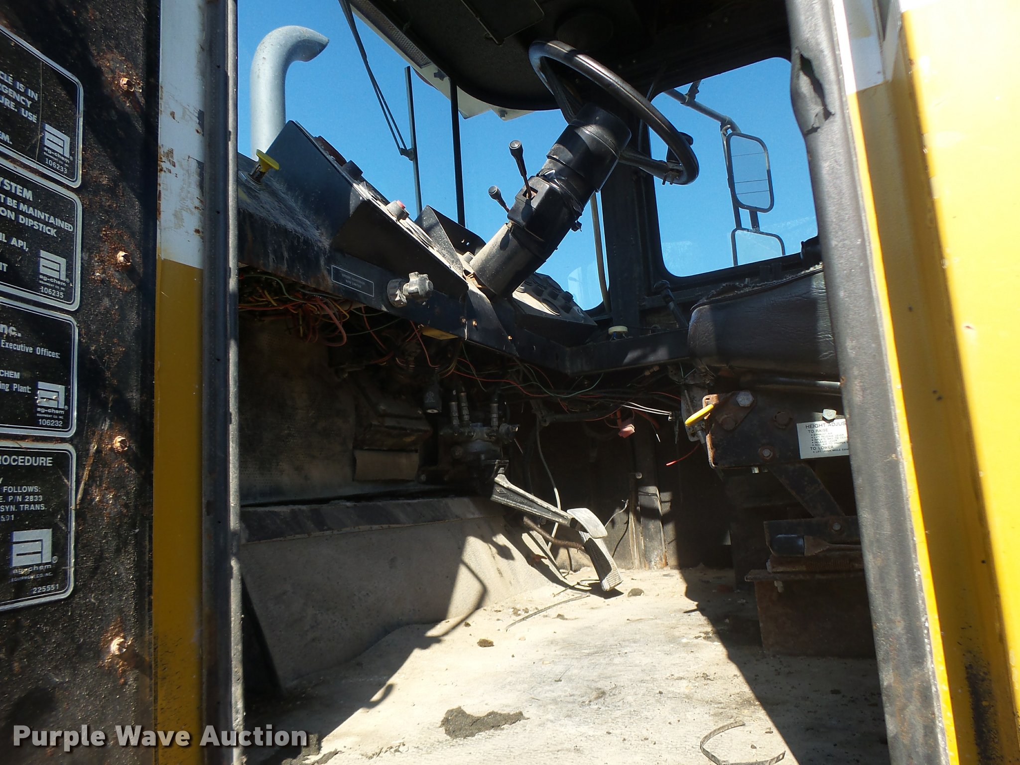 Purple Wave is selling a used Applicator Self Propelled in Missouri. This item is a Ag-Chem TerraGator 1664 self-propelled applicator with the following: 49,920 miles on odometer, 7,277 hours on meter, Caterpillar 3208 eight cylinder turbo diesel engine, Allison automatic transmission, Suspension seat, 48x31-20 front tires, 66x43-25 rear tires, Transmission inoperable, Starter may need to be replaced, Serial T7541