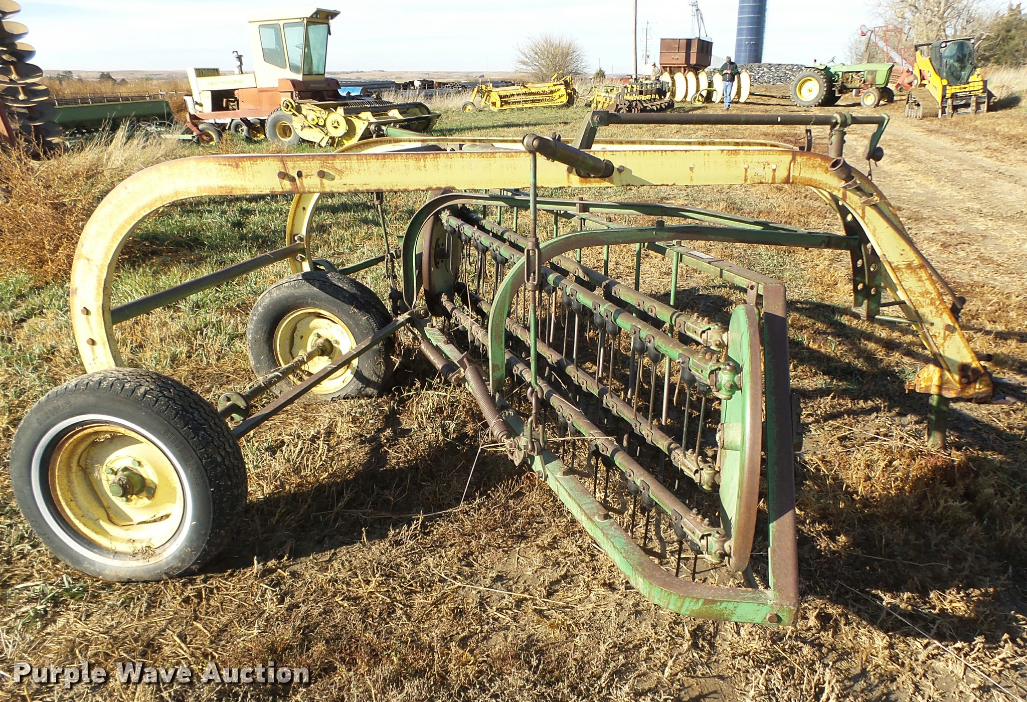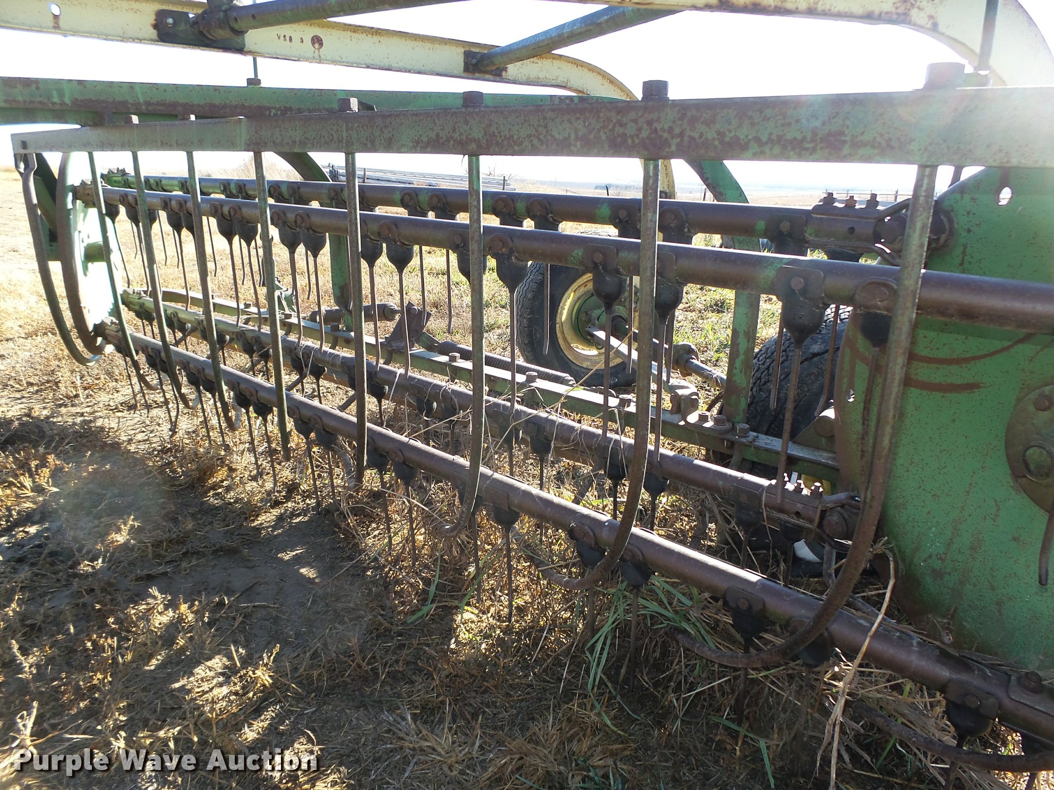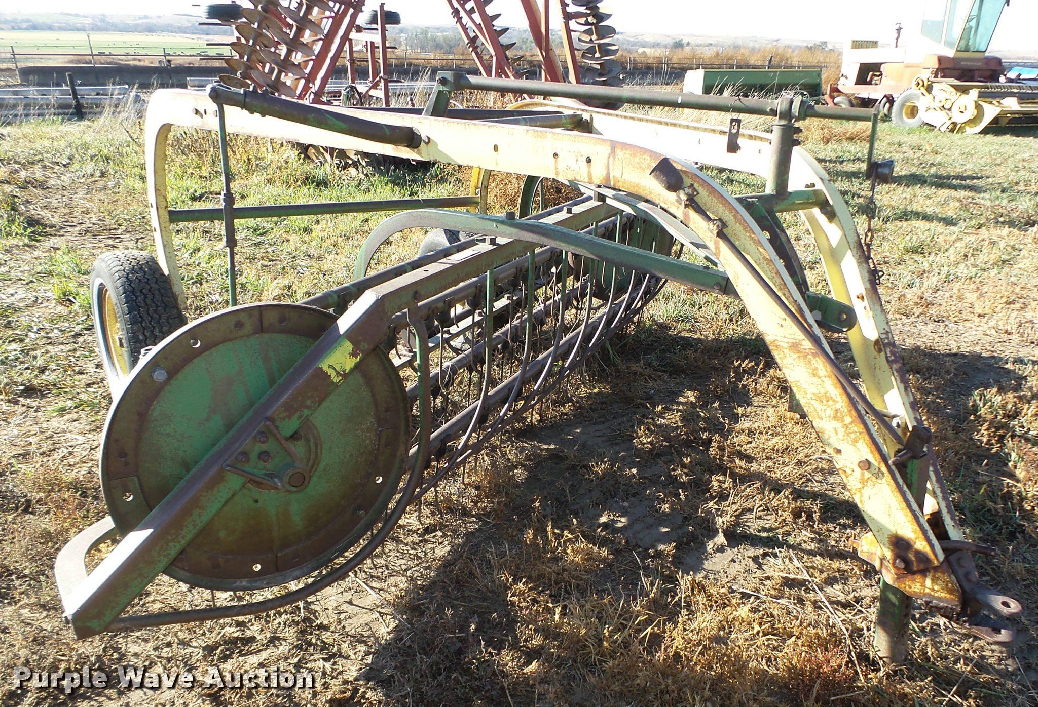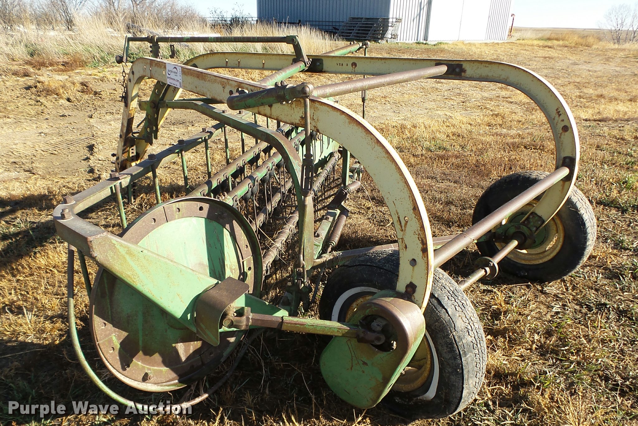 Purple Wave is selling a used Hay Rake in Nebraska. This item is a John Deere 894A hay rake with the following: Adjustable height, Pin hitch, 14" tires, Serial 45173