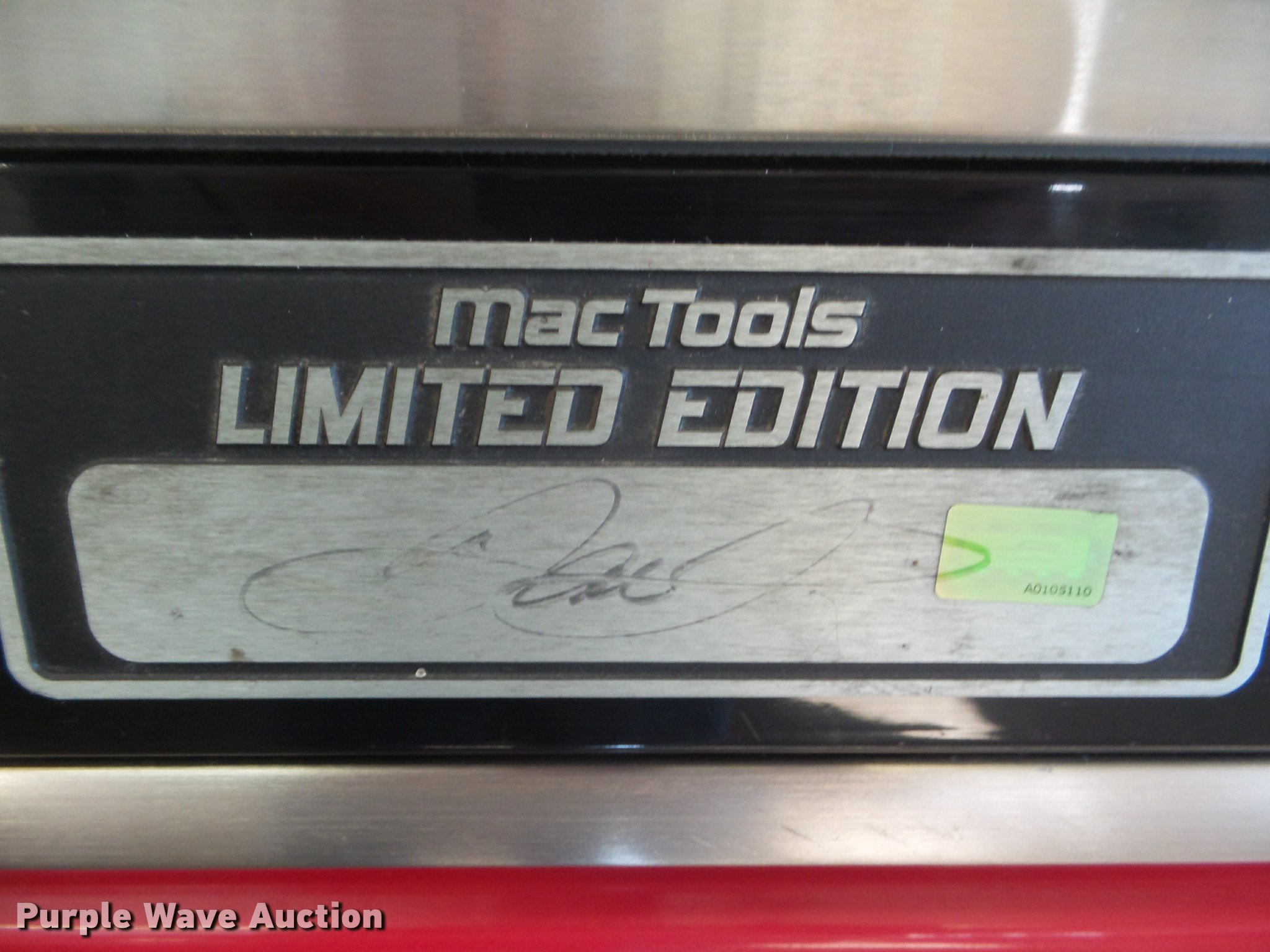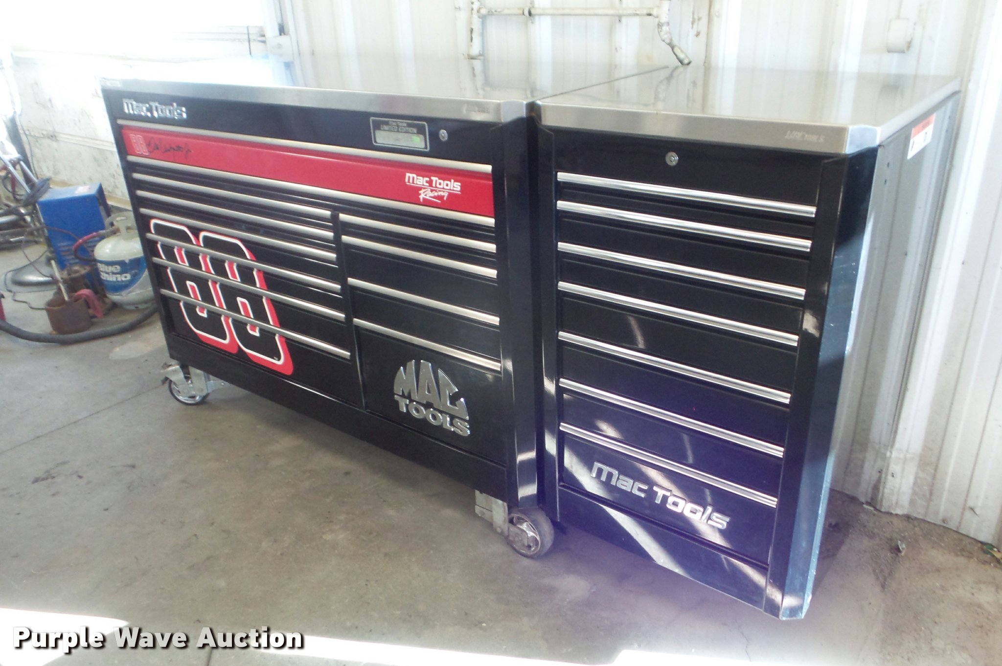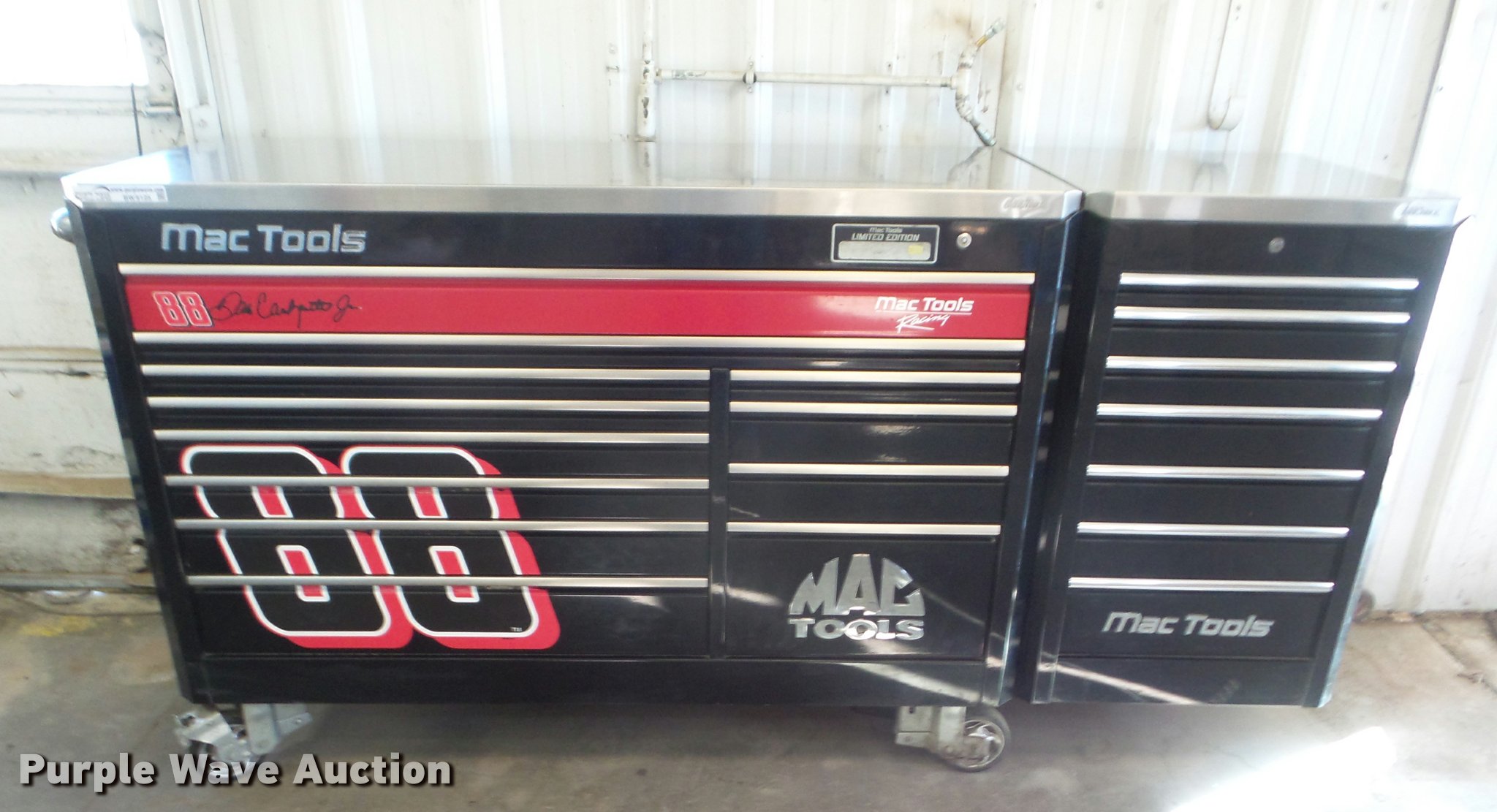 Purple Wave is selling a used Tools in Kansas. This item is a Mac Dale Earnhart Jr. Edition toolbox with the following: 66"L x 26"W main box, 26"L x 26"W side box, 4'H overall, Ball bearing rolling drawers, Wheels