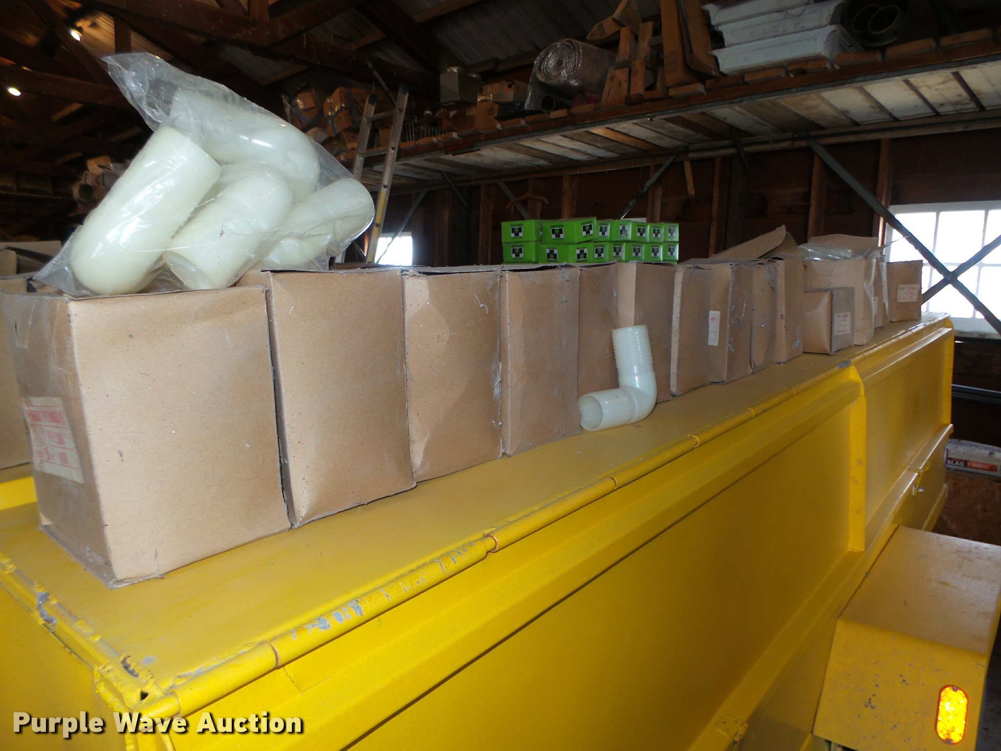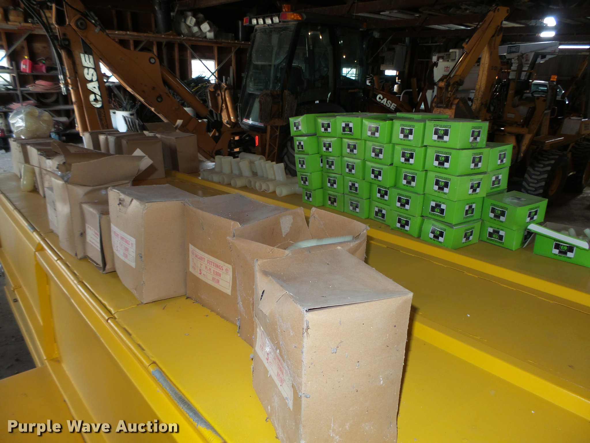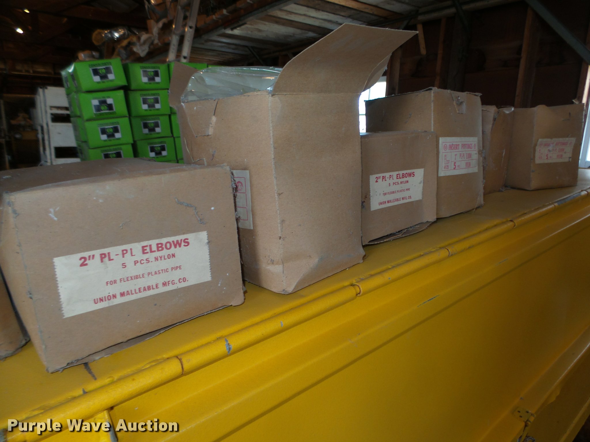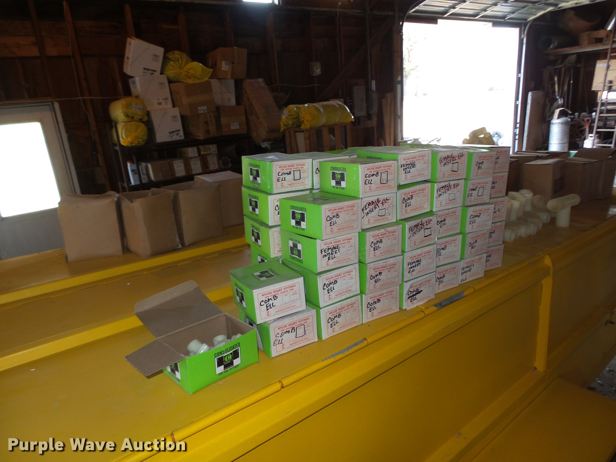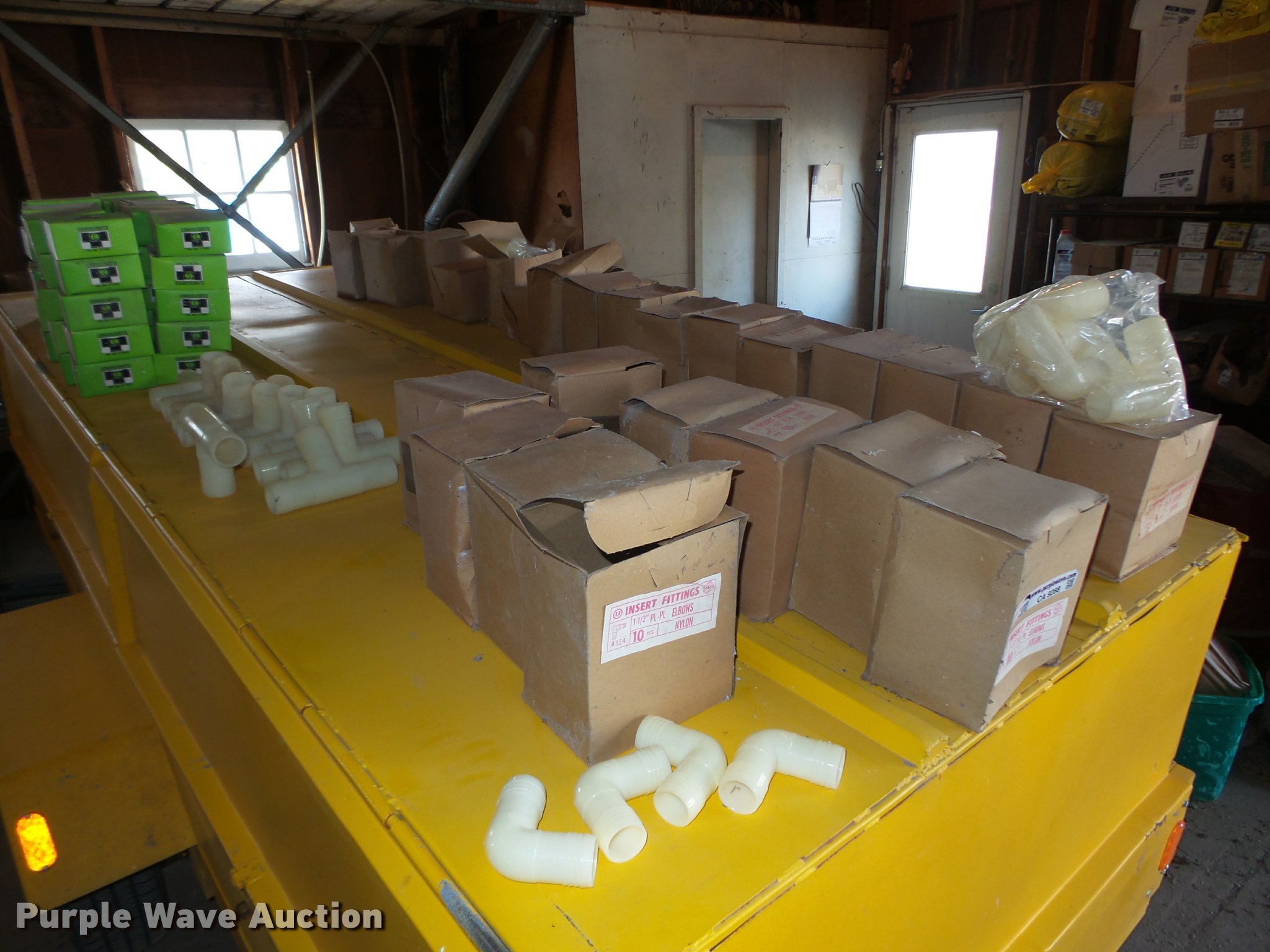 Approximately 800 nylon insert fittings. (101) 2" 90 degree elbows, (100) 1.5" 90 degree elbows, (13) 2" ties, (620) 1/2" FIP x 1/2" insert nylon elbows, Trailer not included. Adams Plumbing & Heating. 11318 Jefferson Ave. Odell, NE 68415