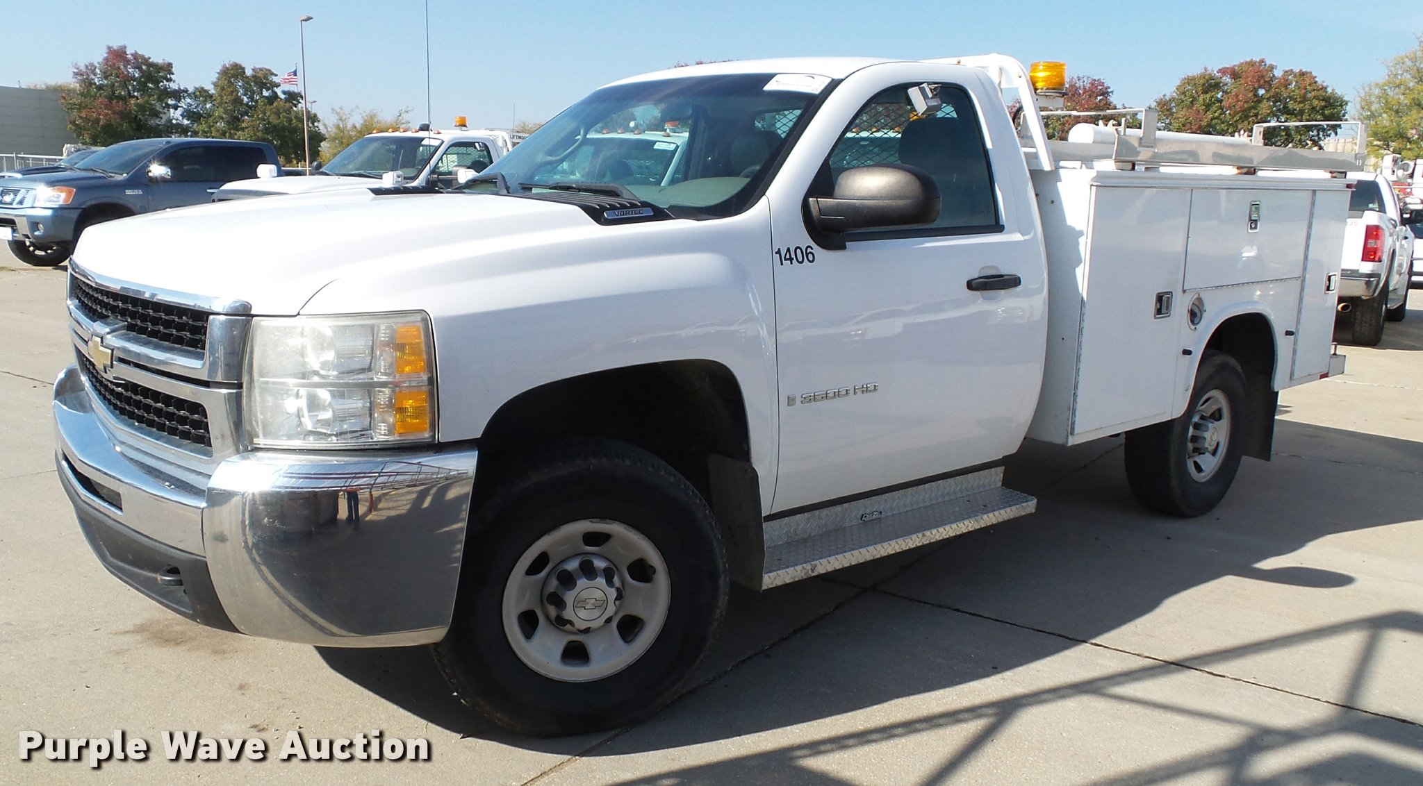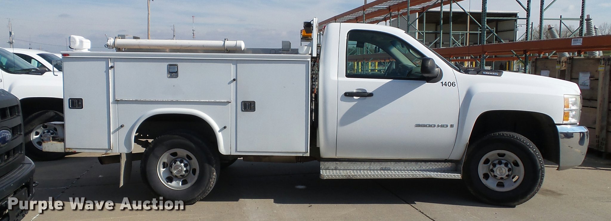 Purple Wave is selling a used 3/4 or 1 Ton Pickup or Van in Kansas. This item is a 2008 Chevrolet Silverado 3500HD utility truck with the following: 177,052 miles on odometer, 6.0L V8 OHV 16V gas engine, Automatic transmission, AC and heat, Tilt, Cruise, AM/FM/CD, Power windows, locks, and mirrors, Vinyl interior, Front tow hooks, Running boards, Strobe light, Light bar, Exterior go light, Knapheide utility bed, Model 696D48J, (6) compartments, Ladder and pipe rack, LED Traffic Assist II arrow control, No arrow board, Pintle hitch, Trailer wiring, 265/75R16 tires, Unit# 1406