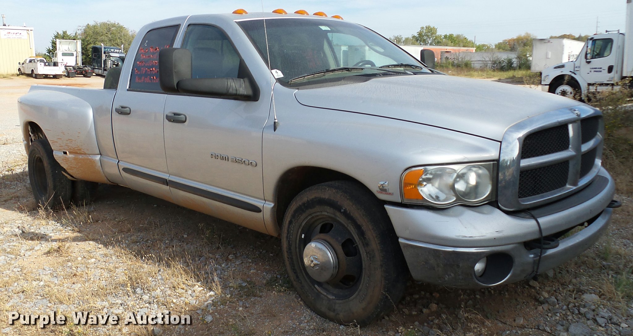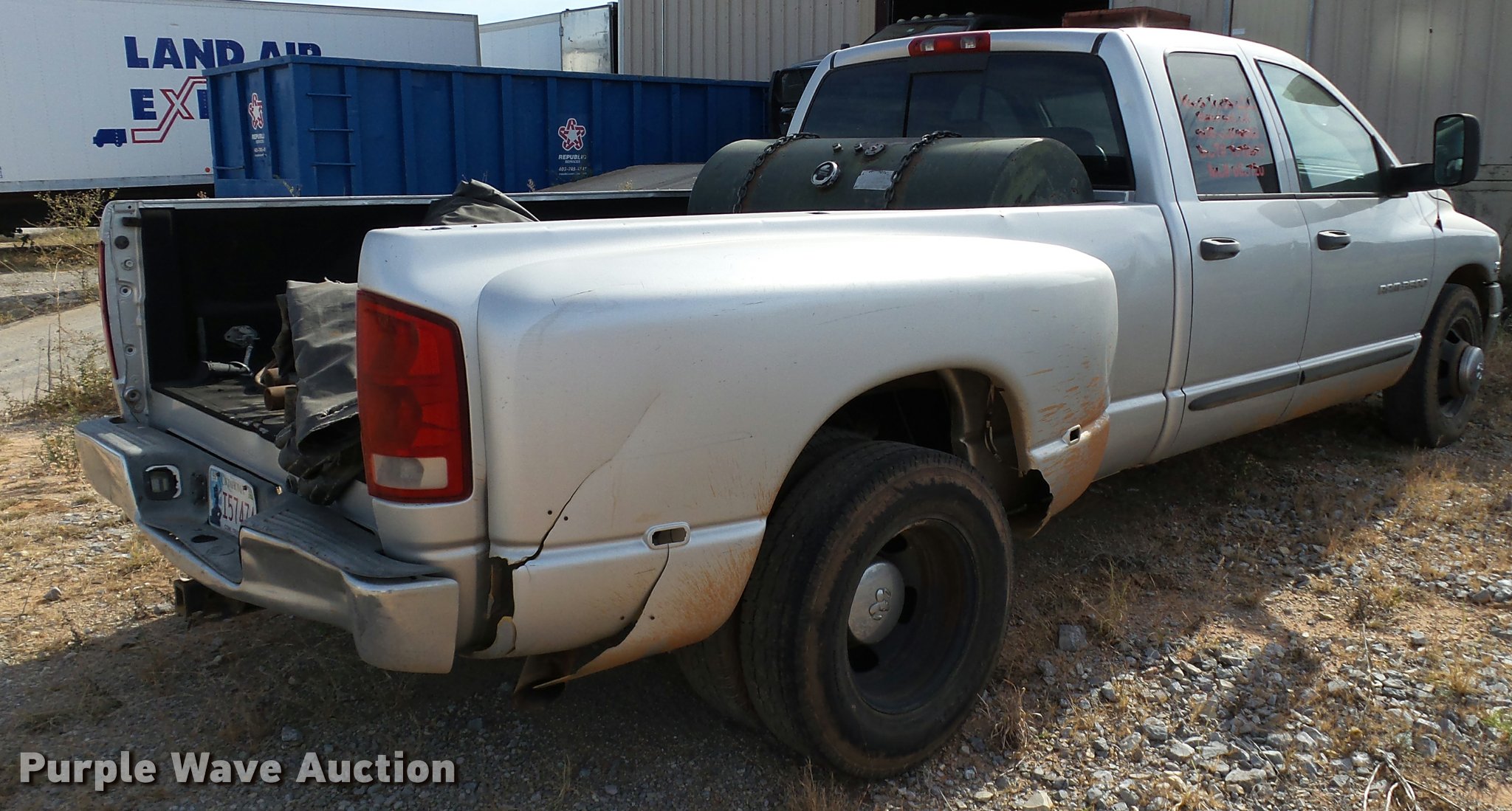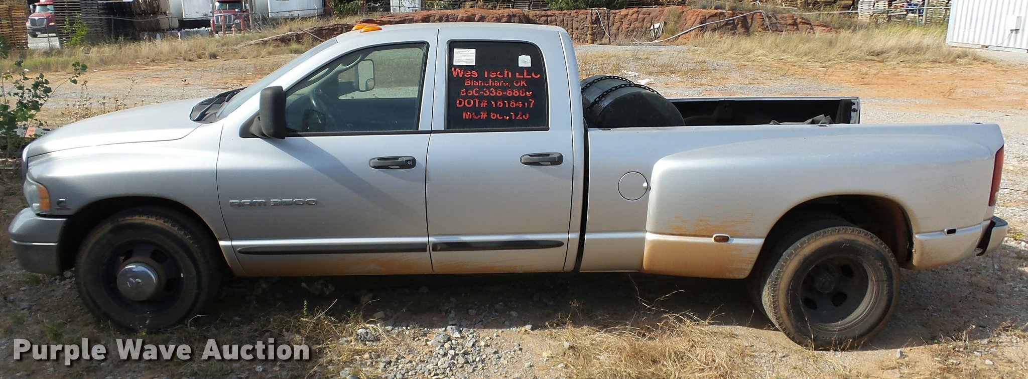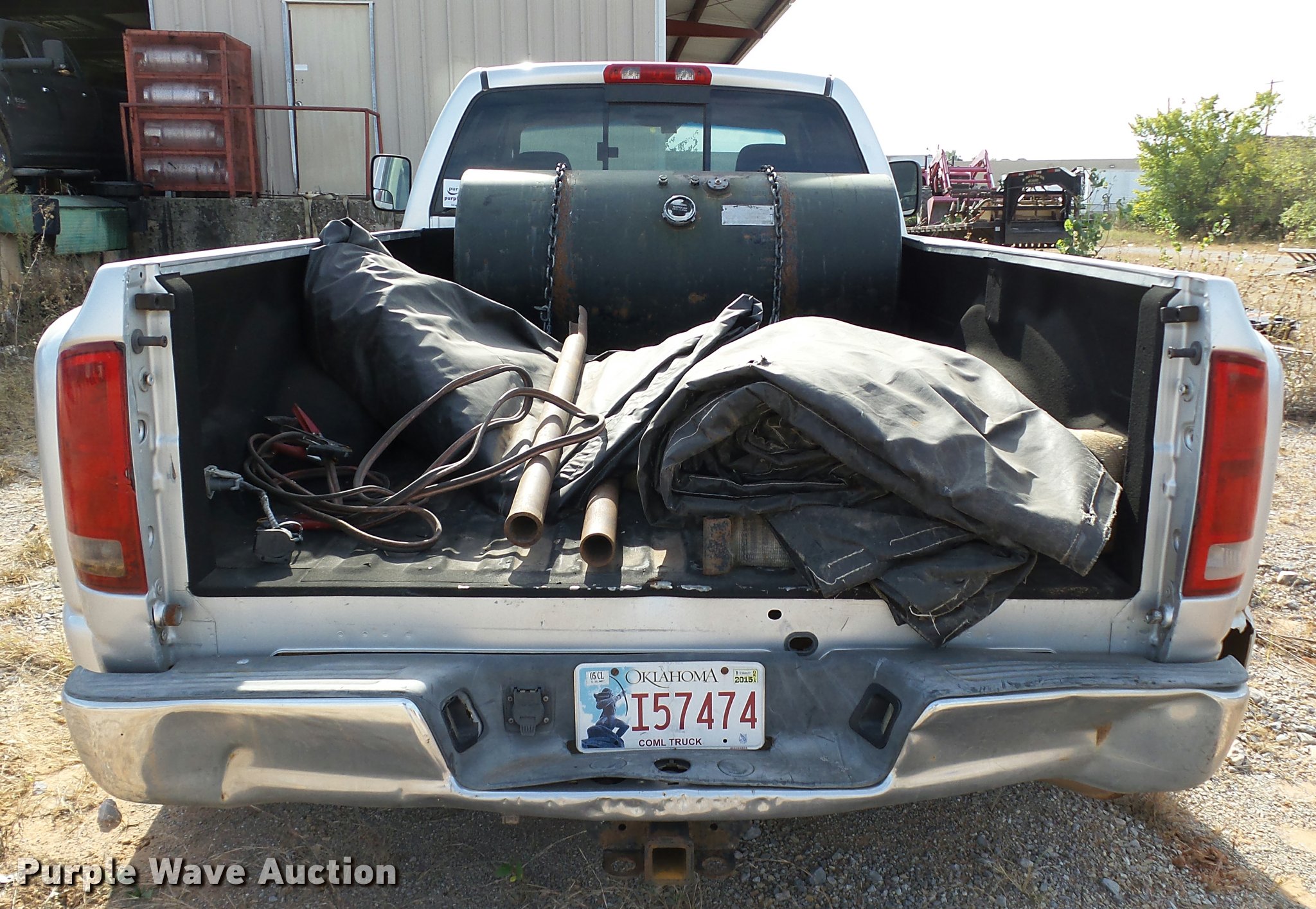 Purple Wave is selling a used 3/4 or 1 Ton Pickup or Van in Oklahoma. This item is a 2005 Dodge Ram 3500 Quad Cab pickup truck with the following: 275,342 miles on odometer, 5.9L L6 OHV 24V turbo diesel engine, 325 HP, Serial 57314704, Six speed manual transmission, AC and heat, Tilt, Cruise, AM/FM/CD, Power windows, locks, and mirrors, Cloth interior, Brake controller, Fog lights, Front tow hooks, Auxiliary fuel tank, 100 gallon capacity, Receiver hitch, Trailer wiring, LT235/80R17 tires, Check engine light on, Non-operational unit