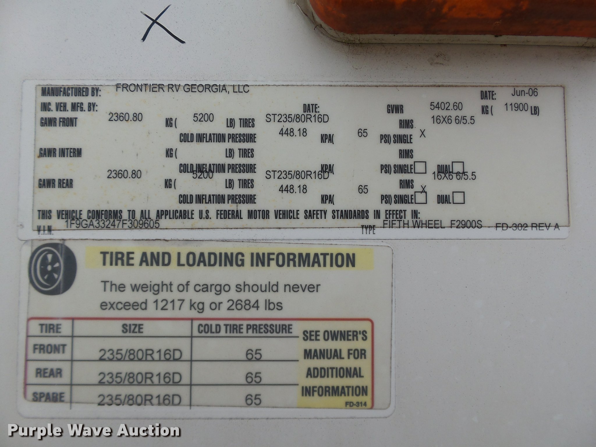 2007 Aspen F2900S camper. 31'L x 8'W overall, 18' retractable awning, 12' slide-out, AC and heat, RCA DVD player, (2) recliners, Couch with hide-a-bed, Dining table, Master bedroom 78"L x 60"W bed, Bathroom Shower, Sink, Vanity, Lavatory, Head/toilet, Kitchen Hair refrigerator/freezer, Dometic microwave, Suburban three burner range Oven and exhaust hood, Two basin sink, Water system maintenance hoses, Internal/external storage, (2) propane tanks, Gooseneck hitch, Tandem axle, 235/80R16 tires, GVWR 11,900 lbs. Oklahoma title. Title distribution may be delayed up to 14 days from verification of funds. 1F9GA33247F309605. Frontier Bridge, Inc.. 7820 NW Expressway. Okarche, OK 73762