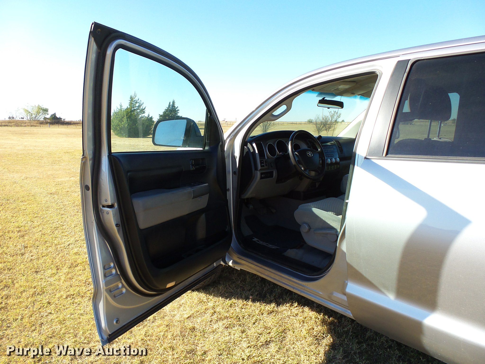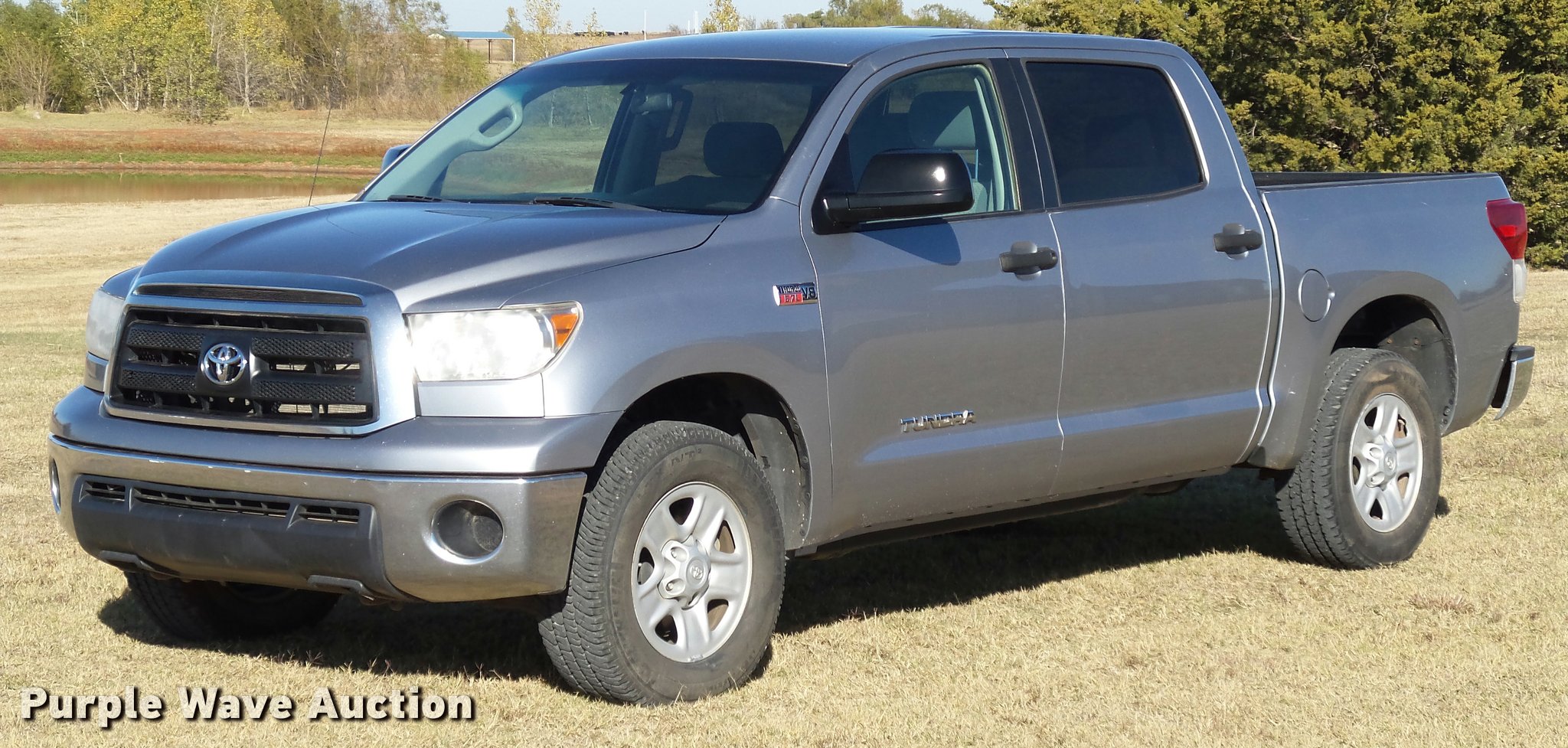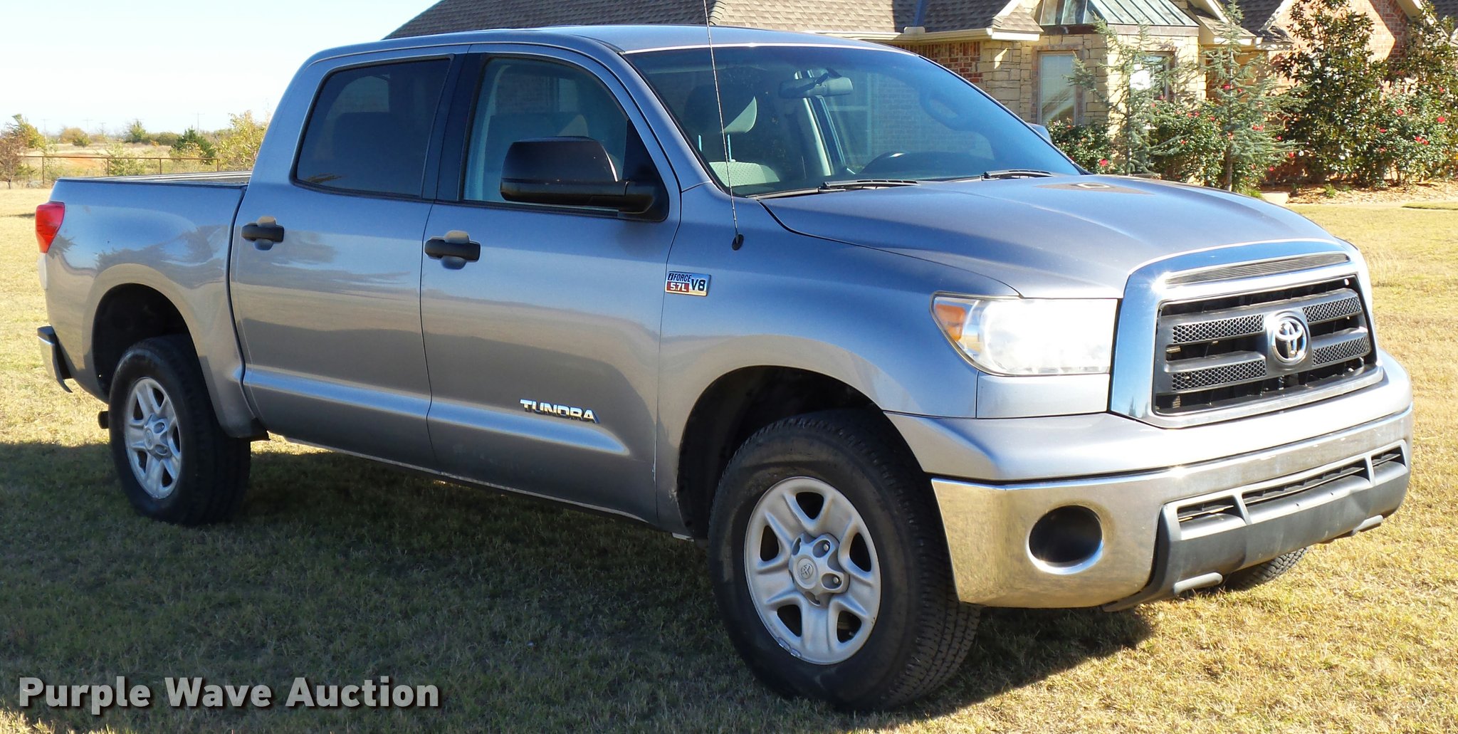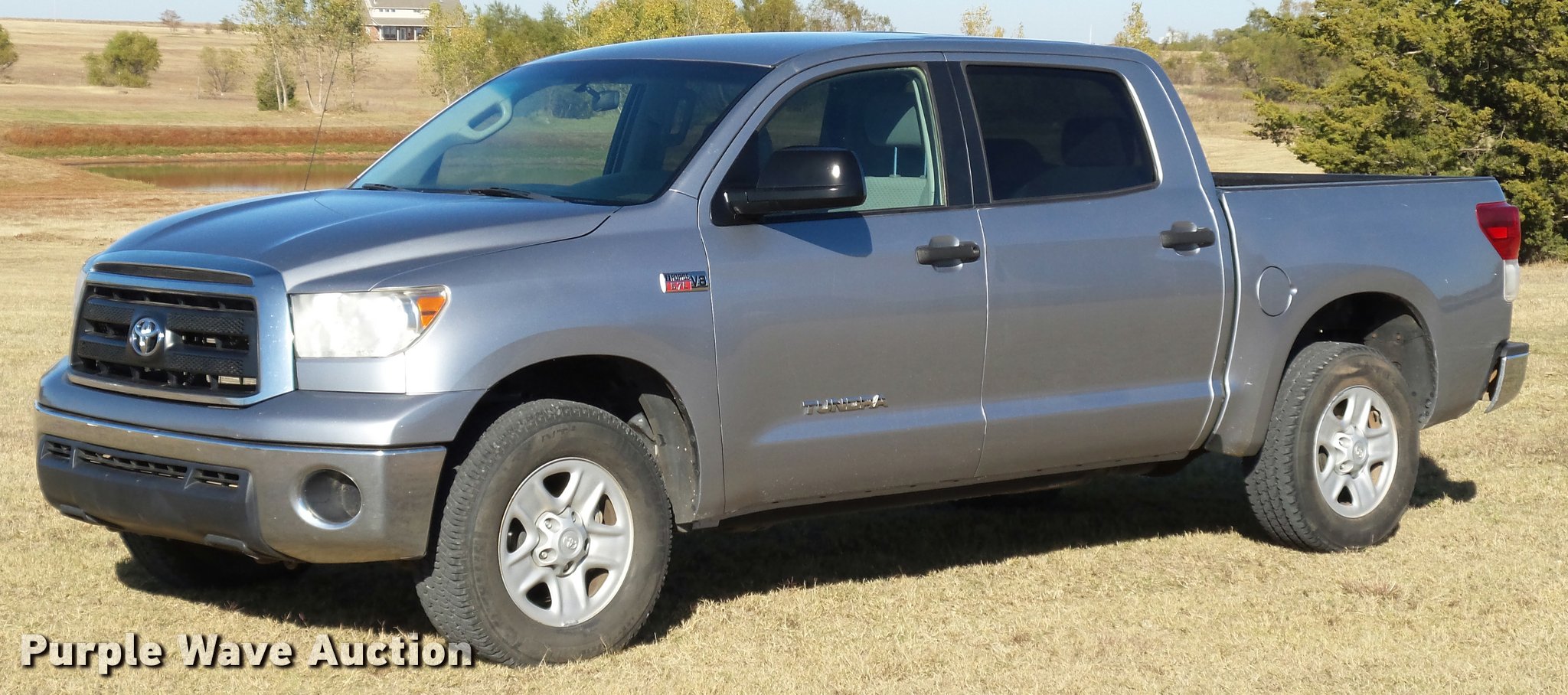 Purple Wave is selling a used 1/2 Ton Pickup or Van in Oklahoma. This item is a 2010 Toyota Tundra SR5 CrewMax pickup truck with the following: 138,963 miles on odometer, 5.7L V8 DOHC 32V FFV gas engine, Automatic transmission, Four wheel drive, AC and heat, Tilt, Cruise, AM/FM/CD, Power windows, locks, and mirrors, Cloth interior, Front tow hooks, Poly bed liner, Receiver hitch, Trailer wiring, LT275/65R18 tires
