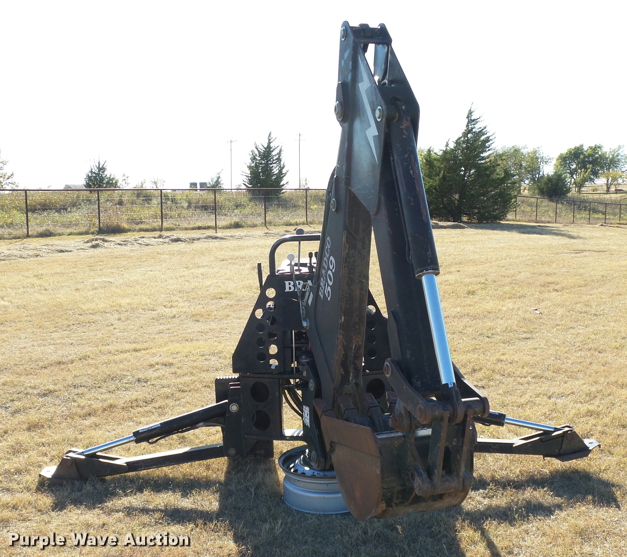 Purple Wave is selling a used Skid Steer Attach. in Oklahoma. This item is a Bradco 509 backhoe attachment with the following: Two stick hydraulic operation, 116" dig depth, Swing and boom lock, 16"W four tooth bucket, Hydraulic outriggers, Quick attach frame mount, Serial 8509X24303