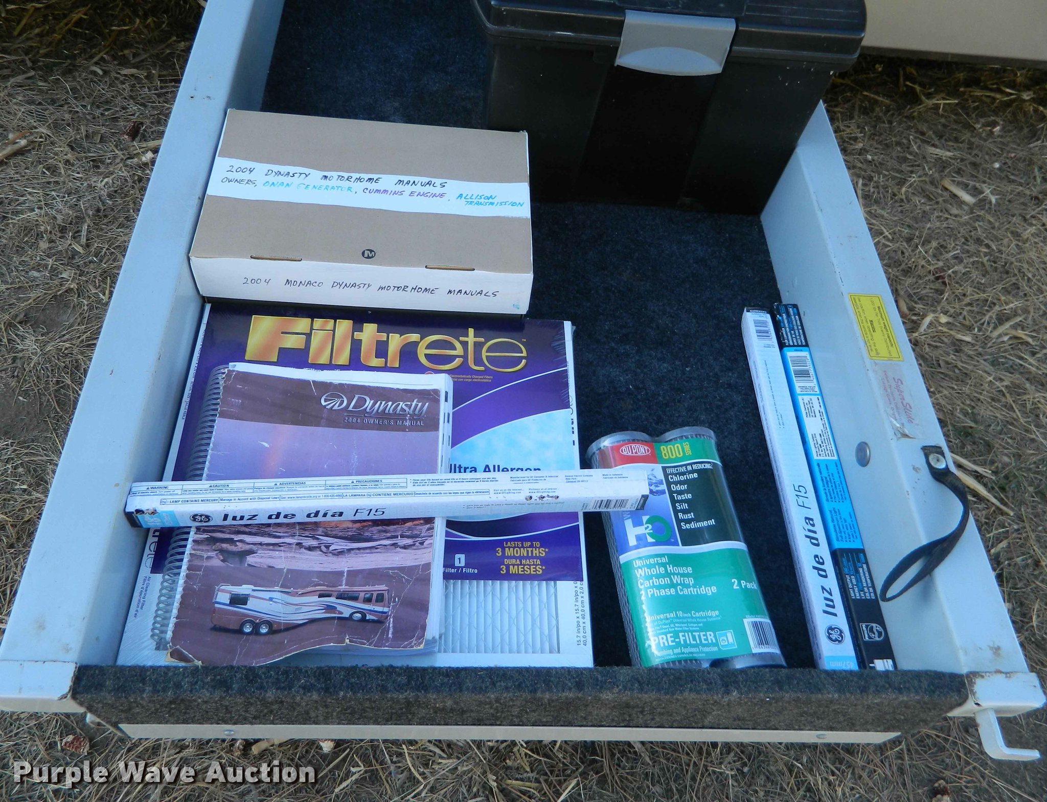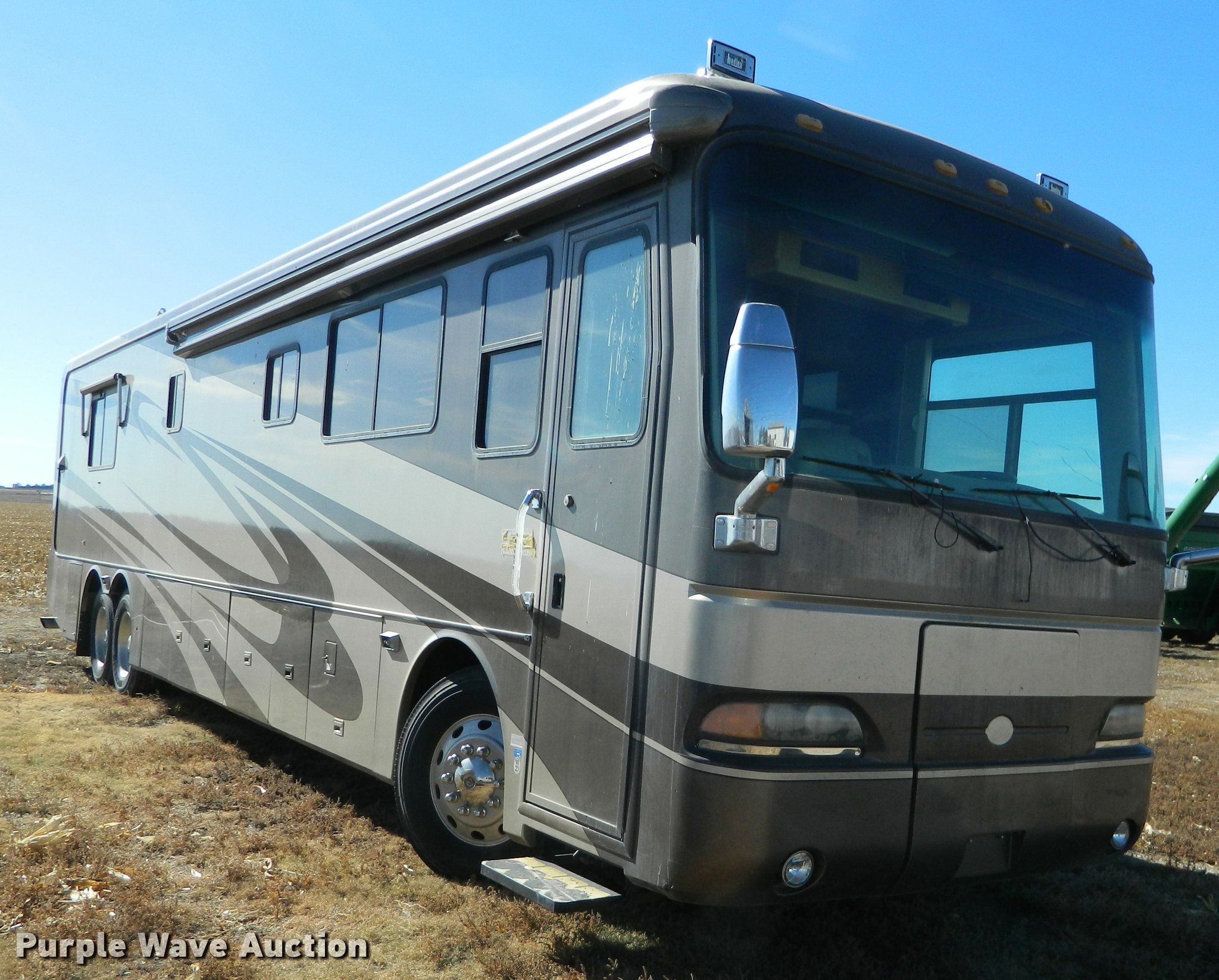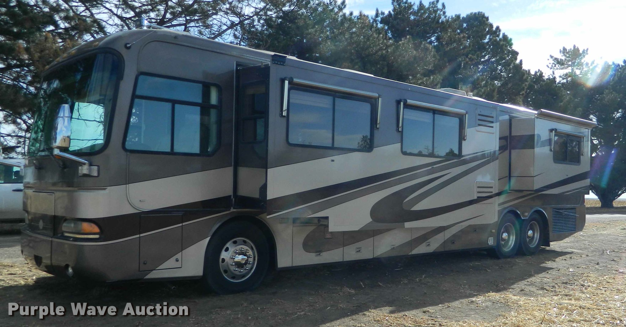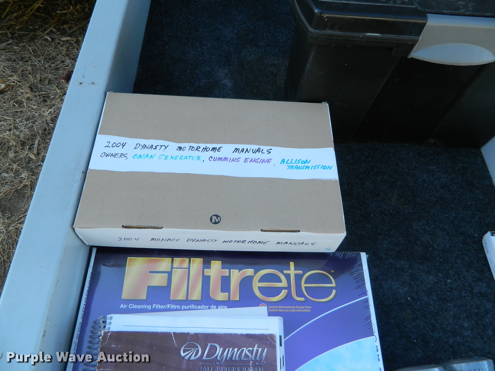 Purple Wave is selling a used RV in Kansas. This item is a 2004 Monaco Dynasty Princess RV with the following: 52,867 miles on odometer, Cummins diesel engine, 400 HP, Allison automatic transmission, Tandem axle, Tag axle, 43'L, (2) slide-outs, Power seats, Leather interior, Six-way heated mirrors, Onan generator, Diesel engine, 14 kW, (3) AC units, Air horns, Temperpedic king bed, Aqua hot heat system, Electric flush toilet, (2) televisions, Washer/dryer, Underbody slide-out trays, 120/240V 50 amp supply, NWH air level, Air suspension, Air brakes, Two stage engine brake, Michelin 11R22.5 YZE tires, GVWR 44,600 lbs, Mechanical manuals included, Recent interior cleaning and detail, Cracked windshield, Awning damaged, Water line broken, Bathroom dome broken