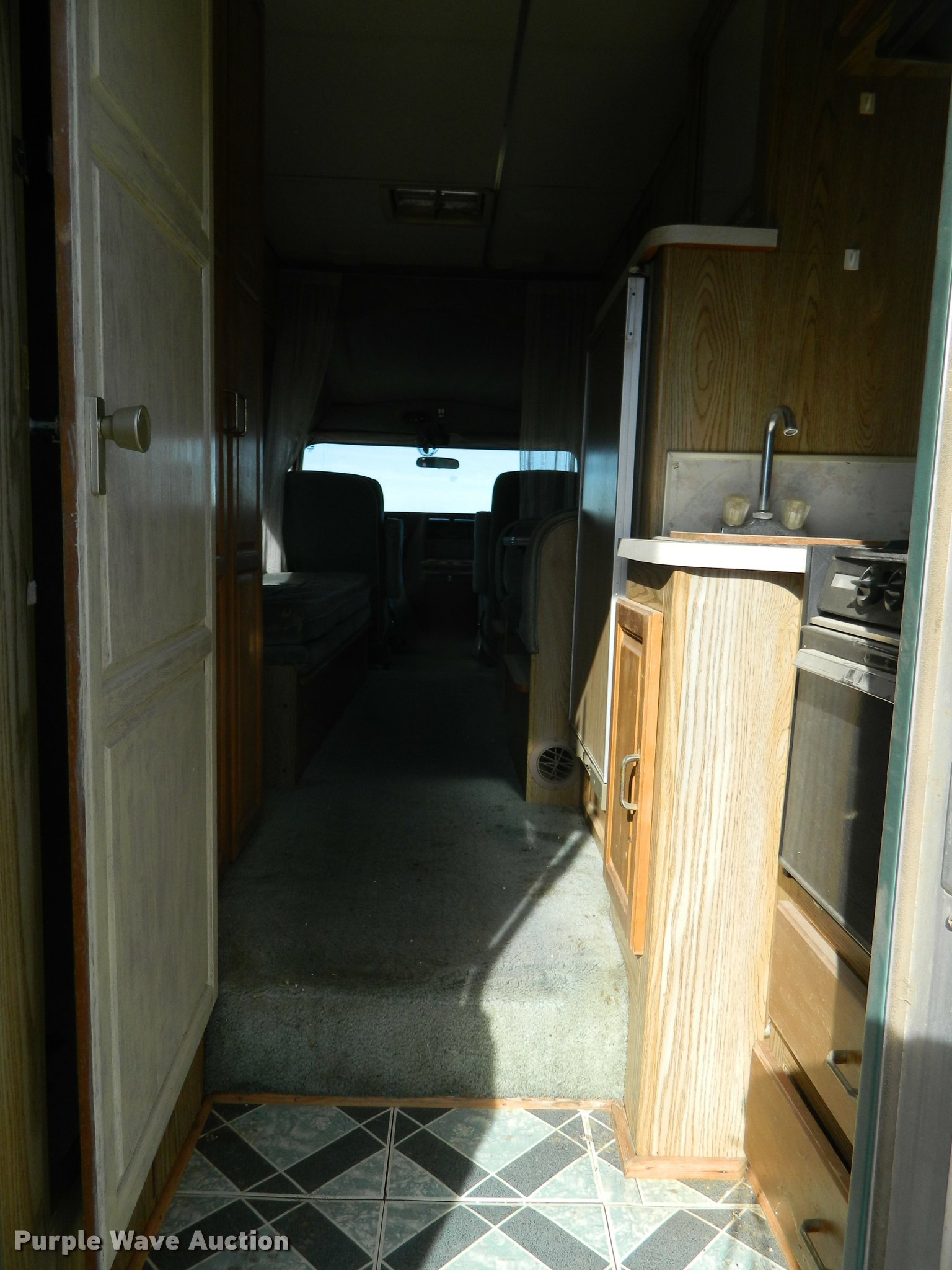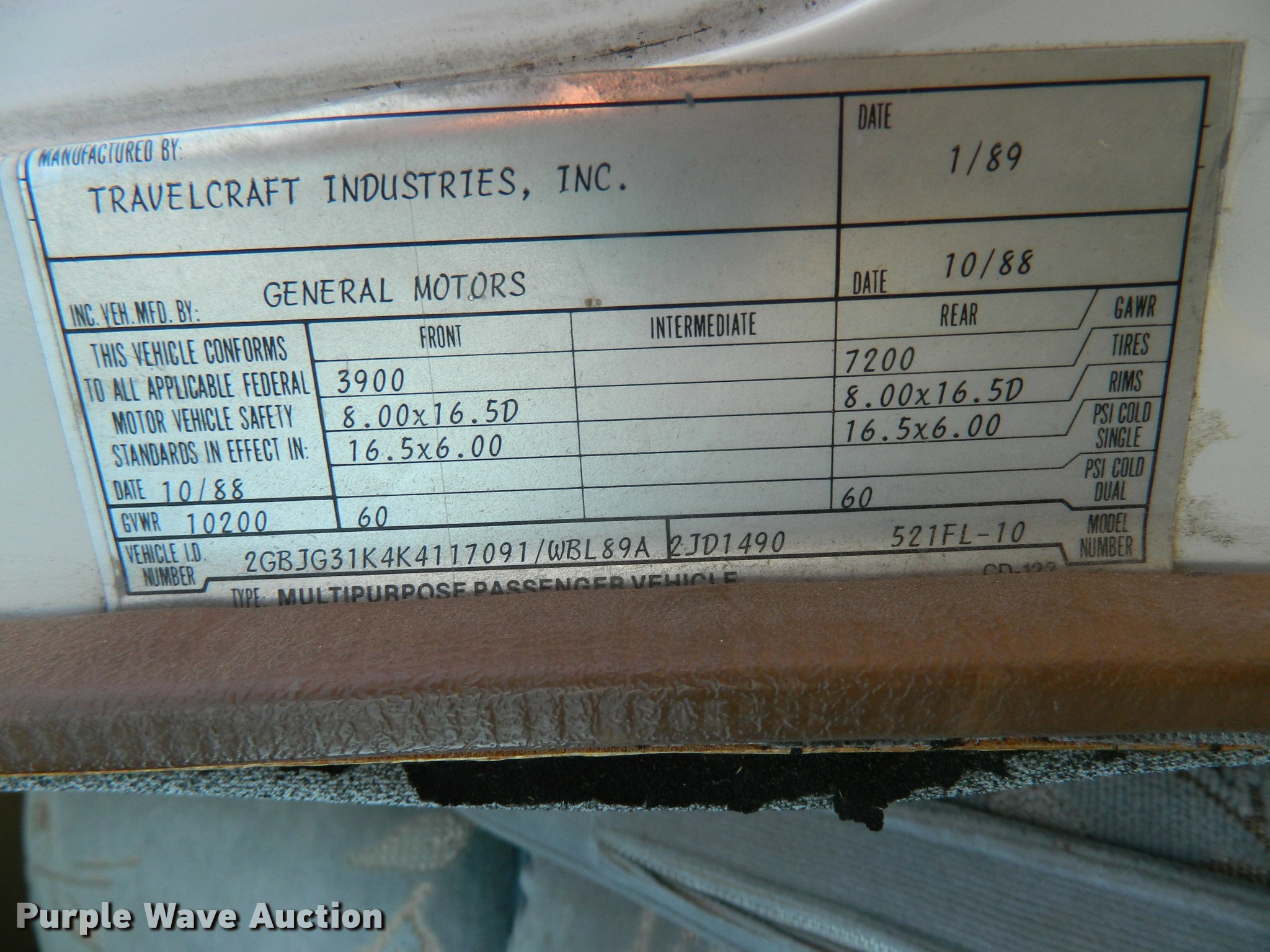 Purple Wave is selling a used RV in Kansas. This item is a 1989 Chevrolet G30 Leisure-Cruiser Travelcraft RV with the following: 67,616 miles on odometer, 5.7L V8 OHV 16V gas engine, Automatic transmission, AC and heat, Tilt, Cruise, AM/FM/cassette, Cloth interior, Propane range top, Sink, Microwave, Refrigerator, Shower, Toilet, Roof mounted AC unit, Onan 2.8 generator, GAs engine, 8.75R16 tires
