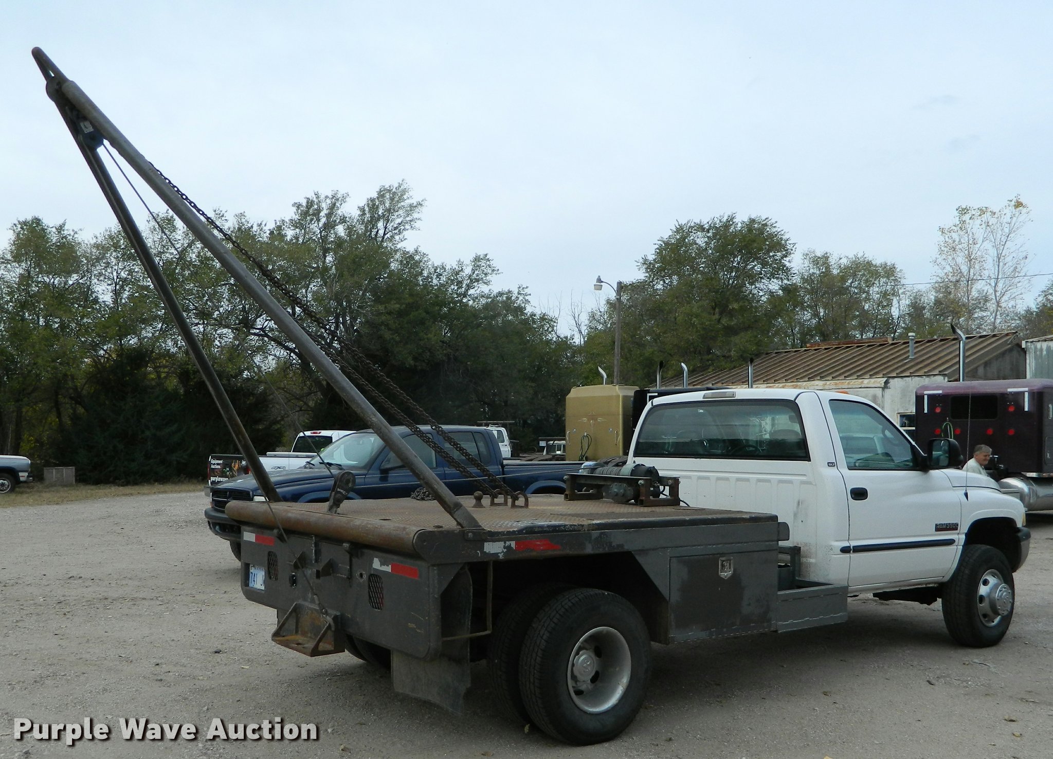 Purple Wave is selling a used 3/4 or 1 Ton Pickup or Van in Kansas. This item is a 2002 Dodge Ram 3500 flatbed pickup truck with the following: 204,866 miles on odometer, 5.9L L6 OHV 24V diesel engine, 245 HP, Six speed manual transmission, Four wheel drive, AC and heat, Tilt, Cruise, AM/FM/cassette, Power windows and locks, Cloth interior, Front tow hooks, 10'3"L x 90"W flatbed, Toolboxes, Under bed storage, Rolling tailboard, Gin poles, Ramsey winch, 12V, Remote control, Gooseneck ball, Spring suspension, Hydraulic brakes, 235/85R16 tires, Cracked windshield, No chains or blocks included
