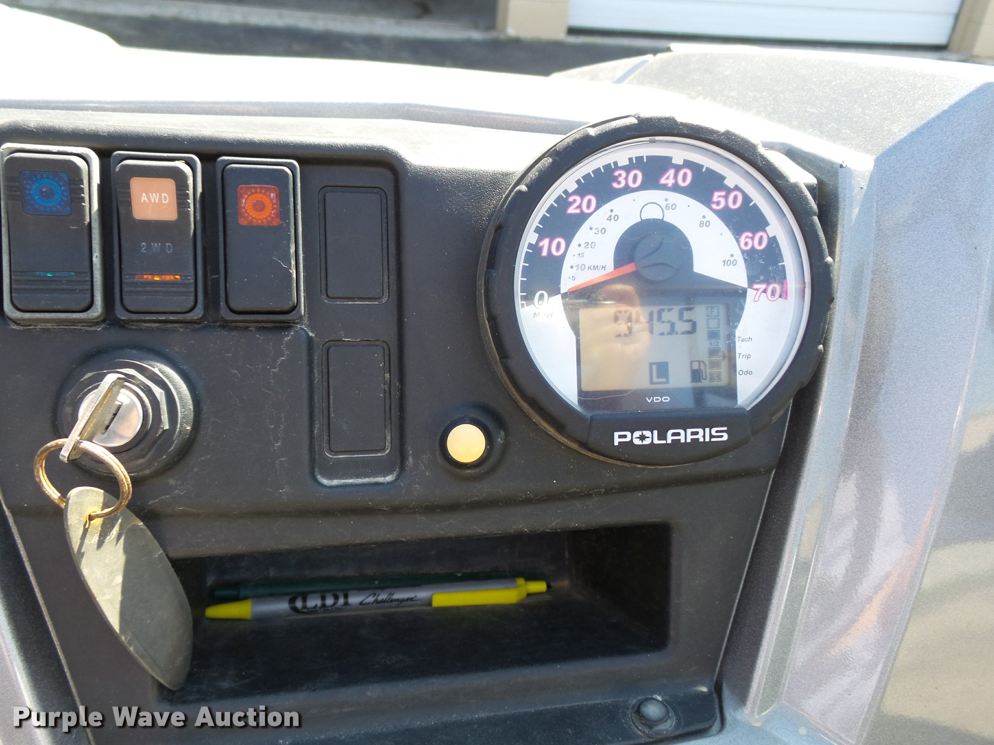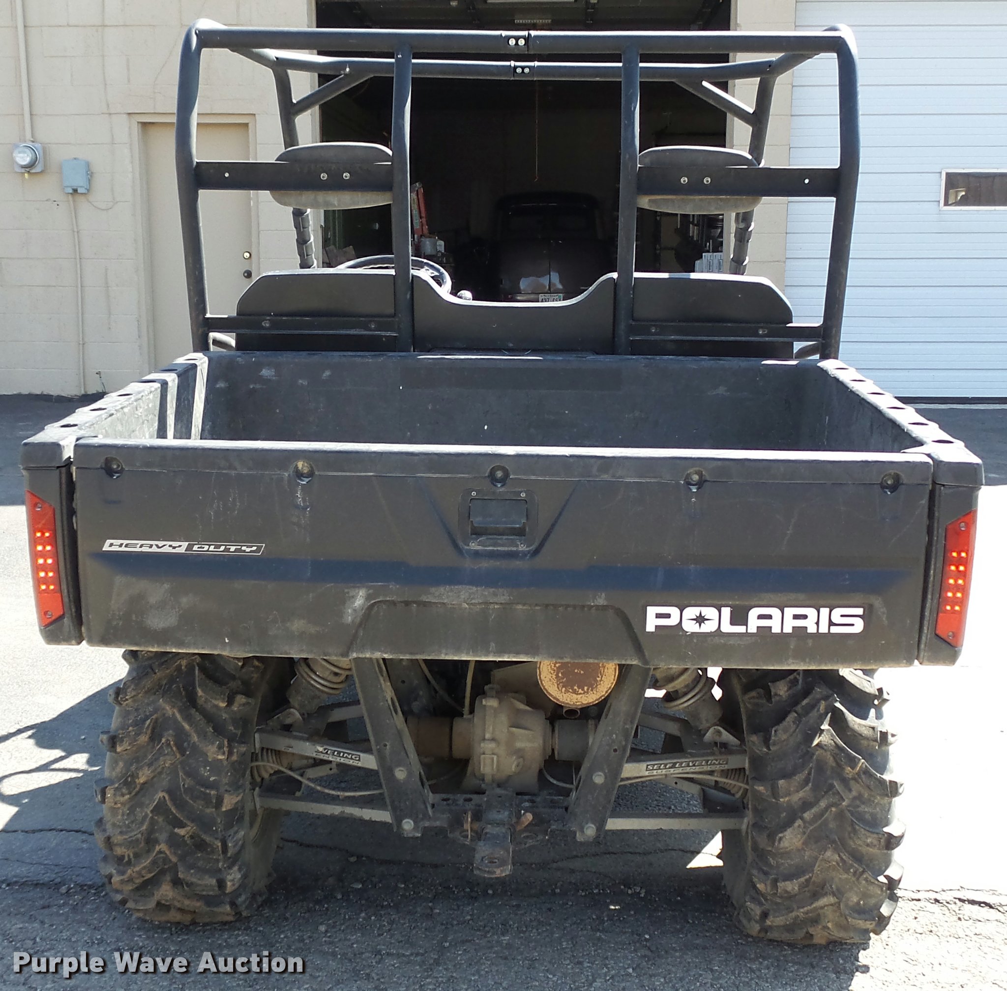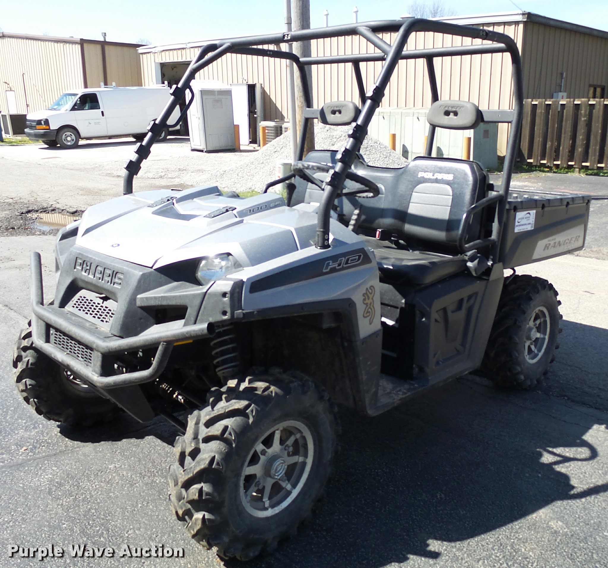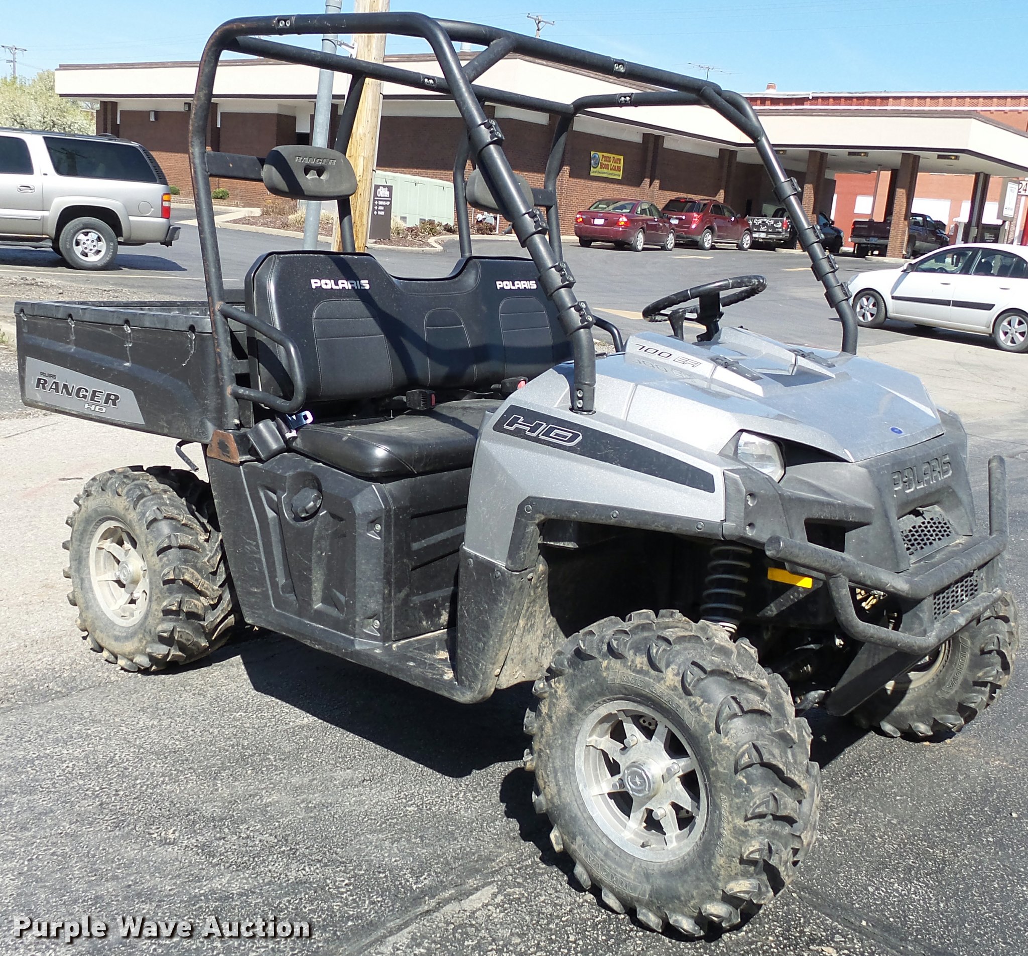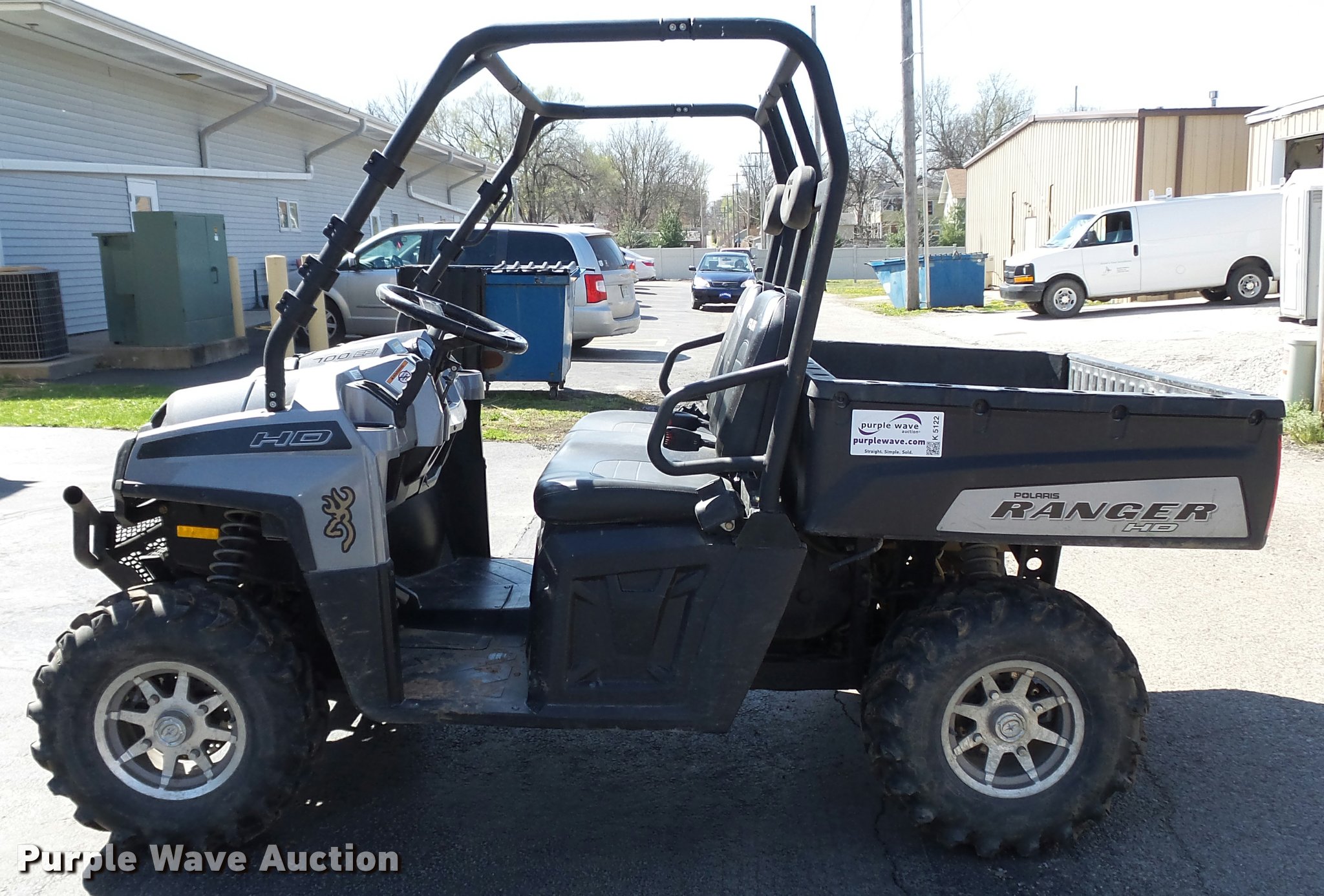 Purple Wave is selling a used Utility Vehicle in Kansas. This item is a 2009 Polaris Ranger HD700 utility vehicle with the following: 945 hours on meter, Two cylinder gas engine, Hi-Lo transmission, Four wheel drive, ROPS, Head lights, 41"L x 60"W bed, Receiver hitch, 26x9-12 front tires, 26x12-12 rear tires