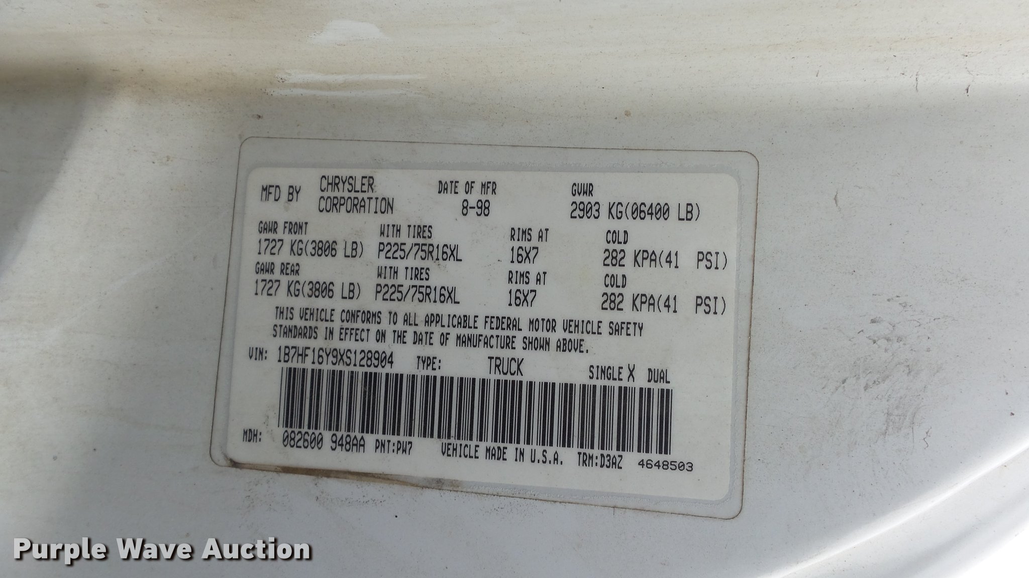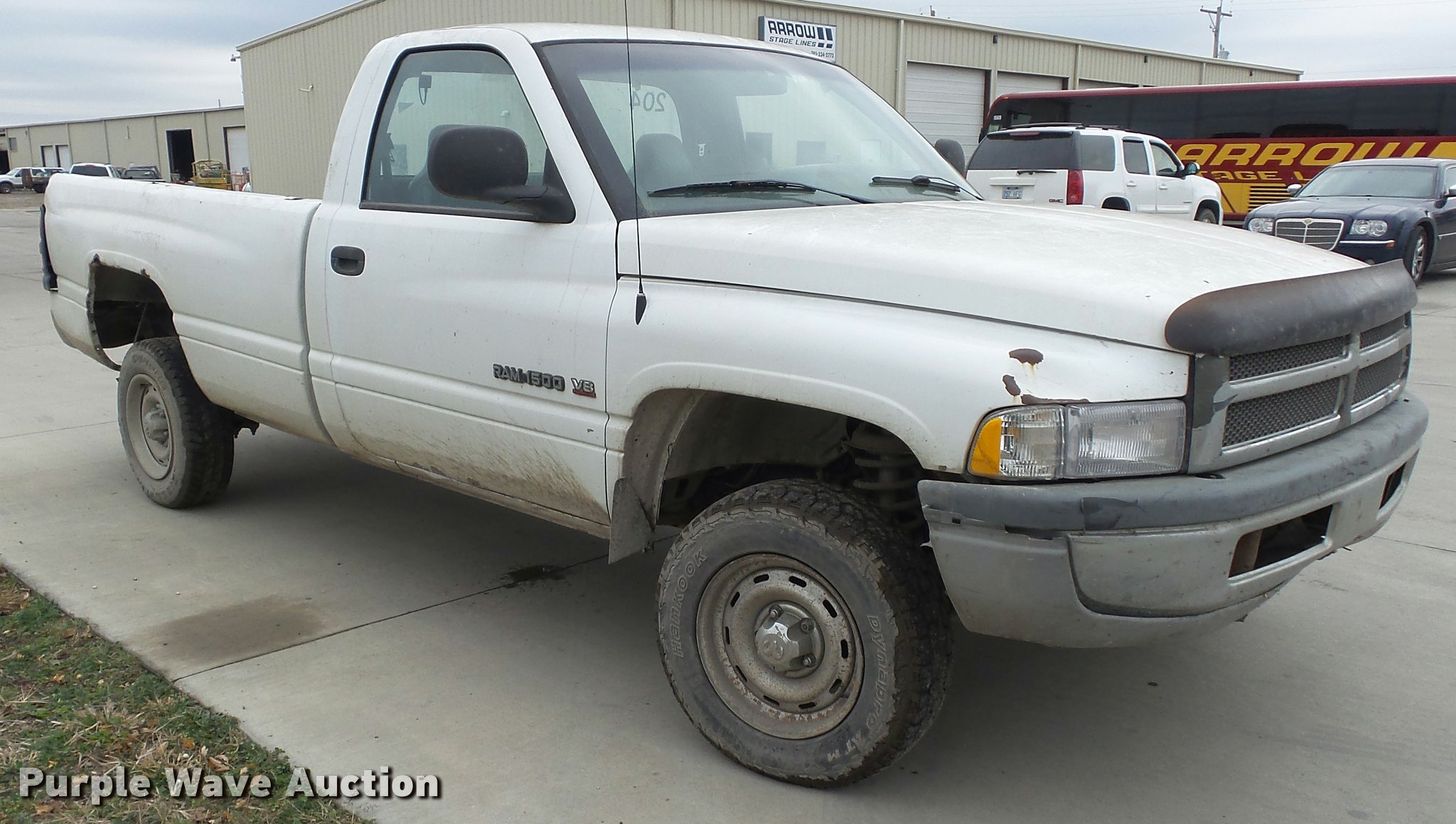 Purple Wave is selling a used 1/2 Ton Pickup or Van in Kansas. This item is a 1999 Dodge Ram 1500 pickup truck with the following: 277,278 miles on odometer, Miles may vary, still in use, 5.2L V8 OHV 16V gas engine, Automatic transmission, Four wheel drive, AC and heat, AM/FM/cassette, Manual windows and locks, Vinyl interior, Receiver hitch, Trailer wiring, 225/75R16 tires, Check engine light on, No tailgate, Rust, Ball hitch not included, Headliner needs replaced