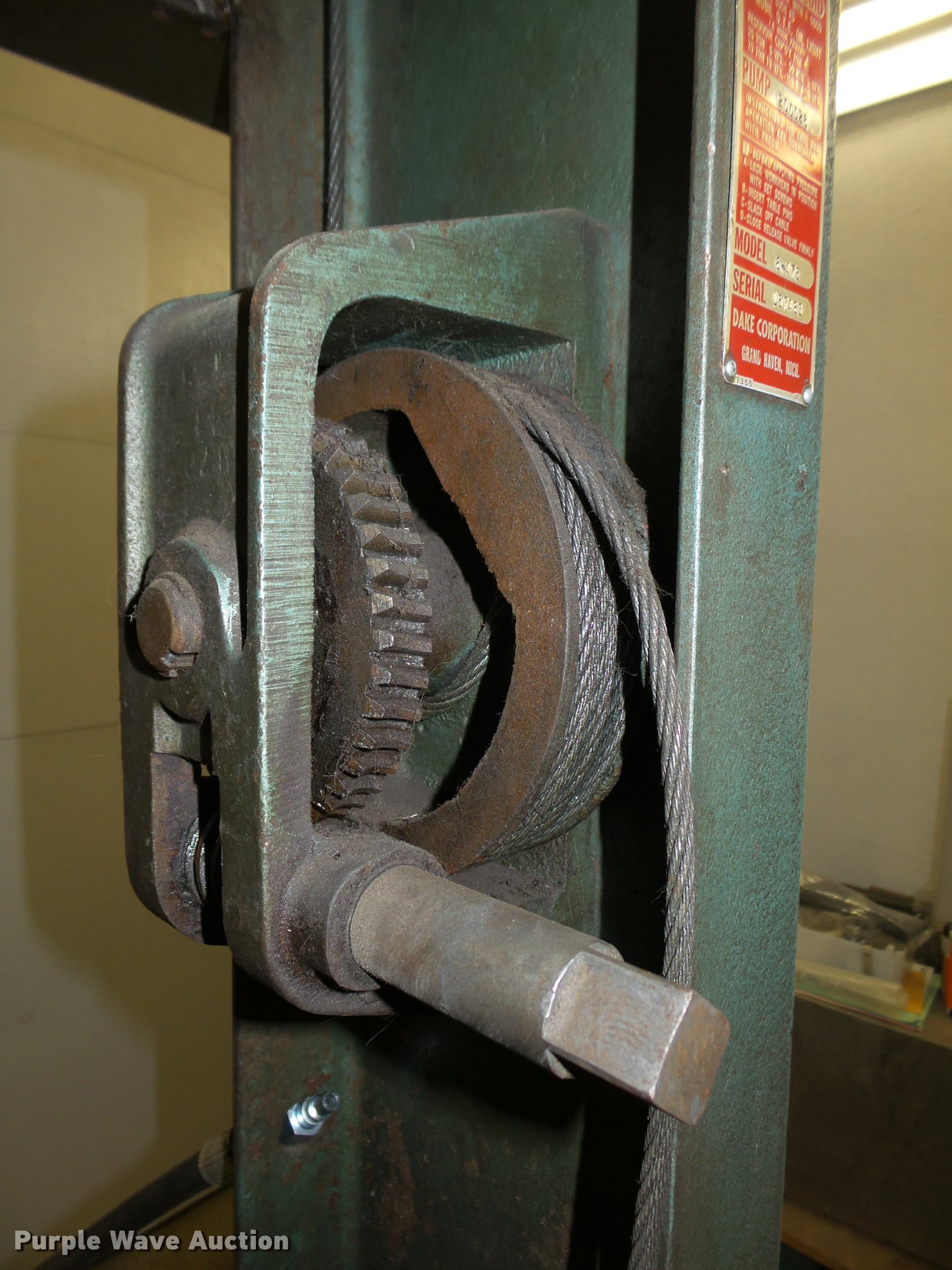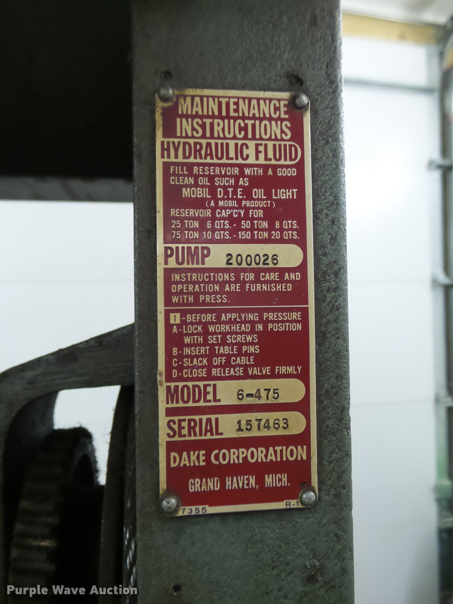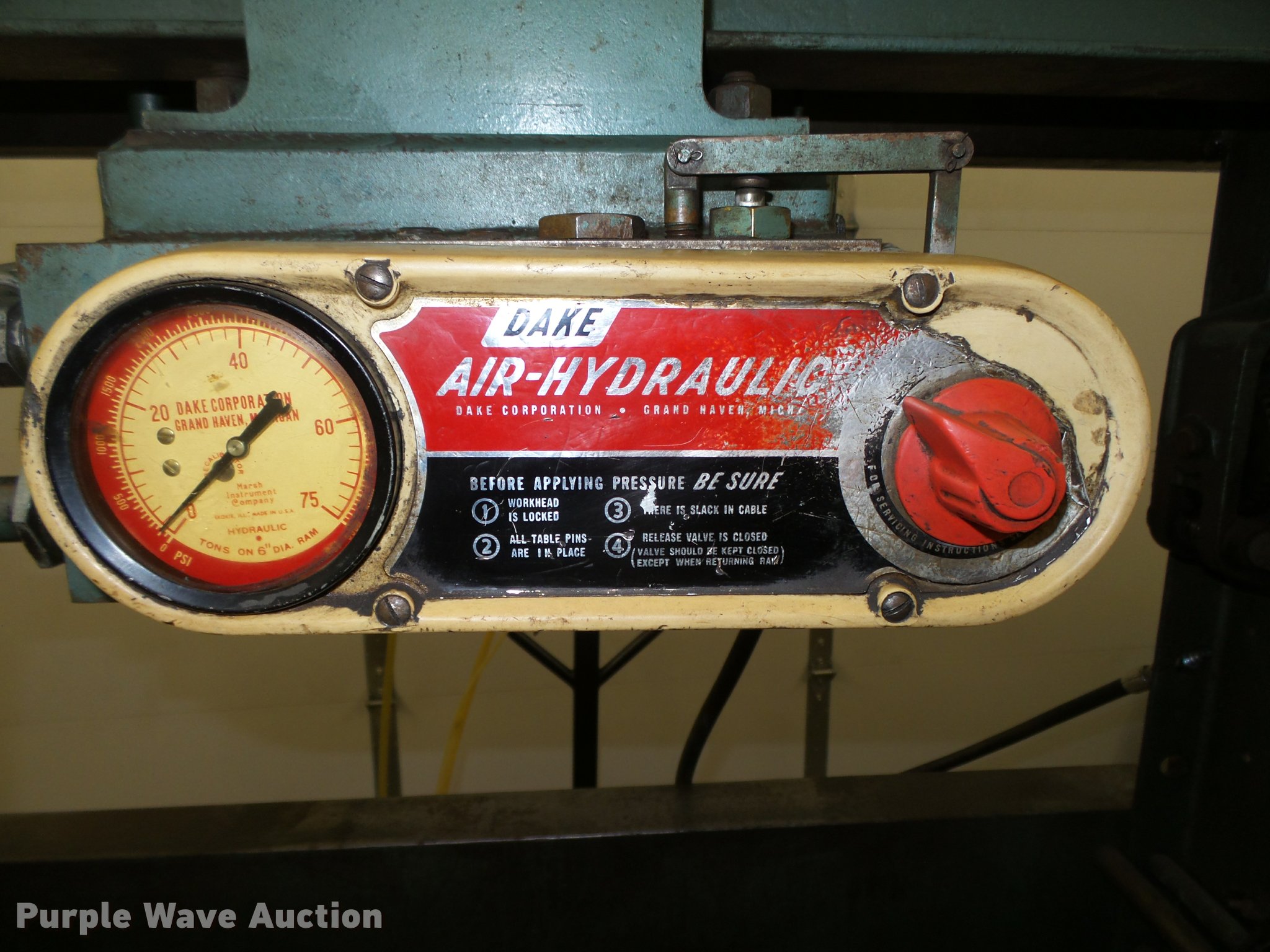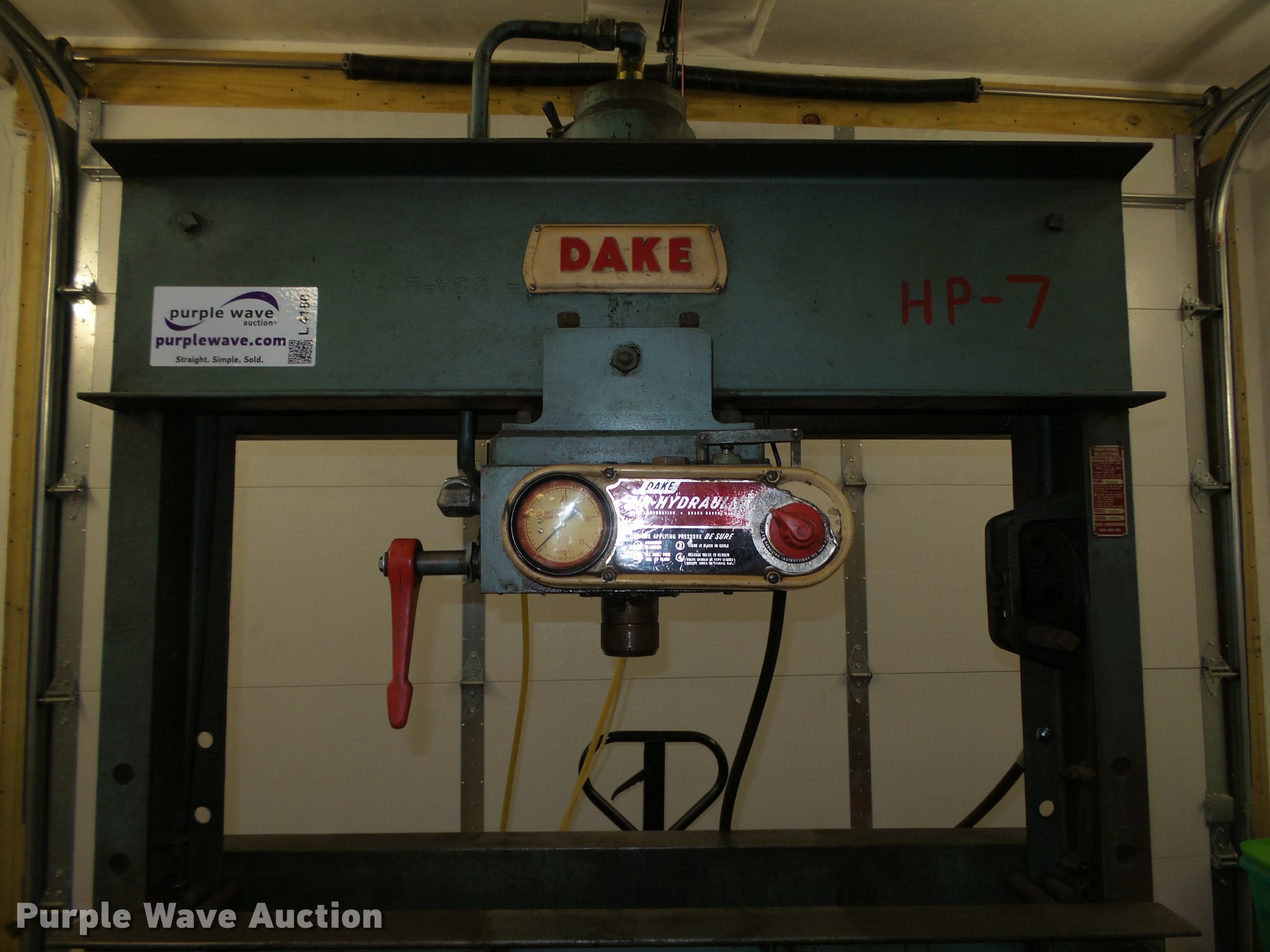 Purple Wave is selling a used Tools in Iowa. This item is a Dake 6-475 press with the following: 55"W x 36"D x 87"H, 75 ton, Air over hydraulic, Bucket, Bolted to pallet, 48" x 56" pallet base, Pallet jack not included, No handle for winch, Serial 157463, Unit# HP-7