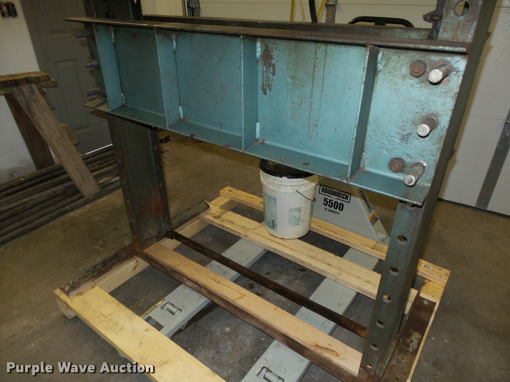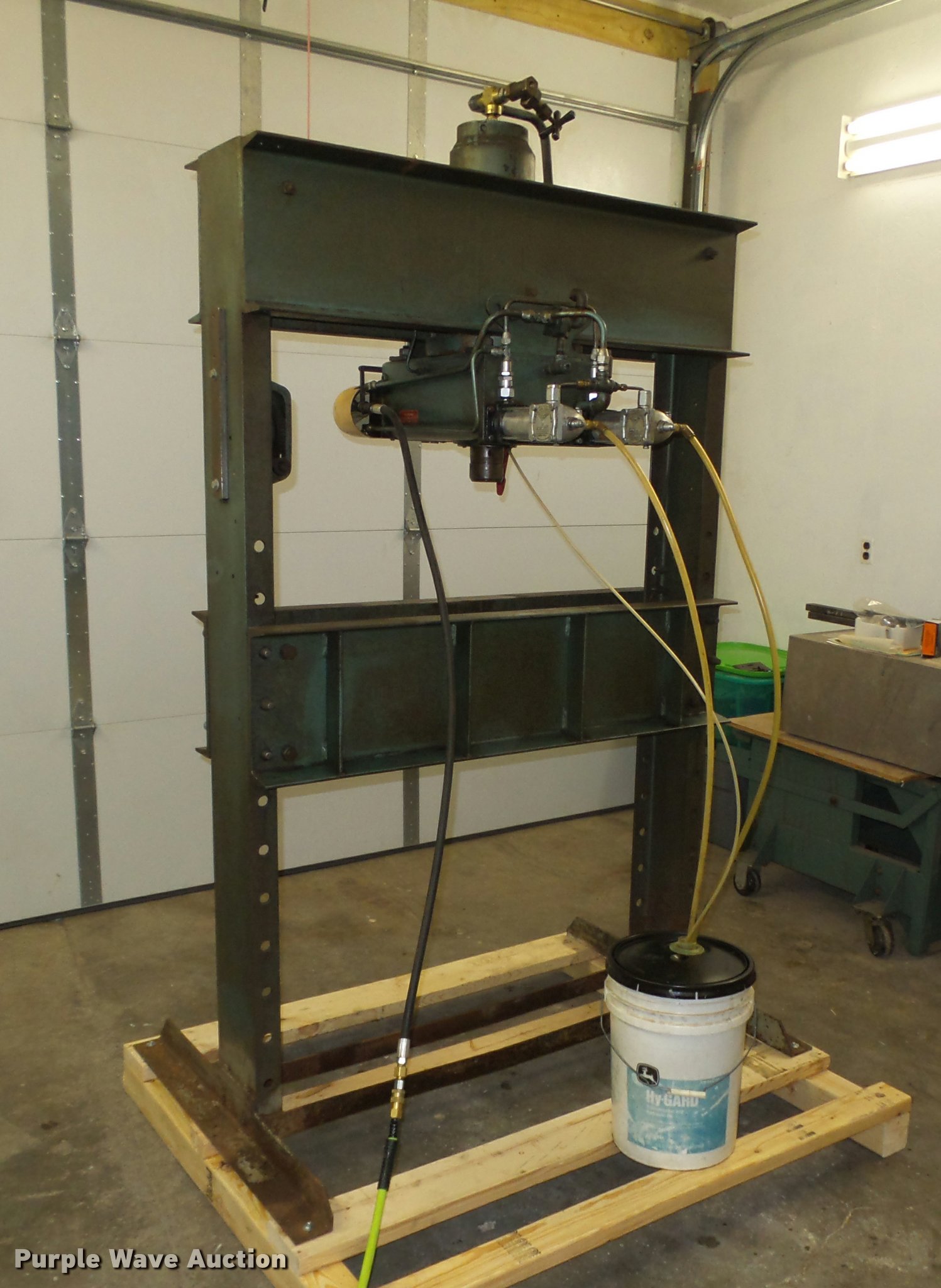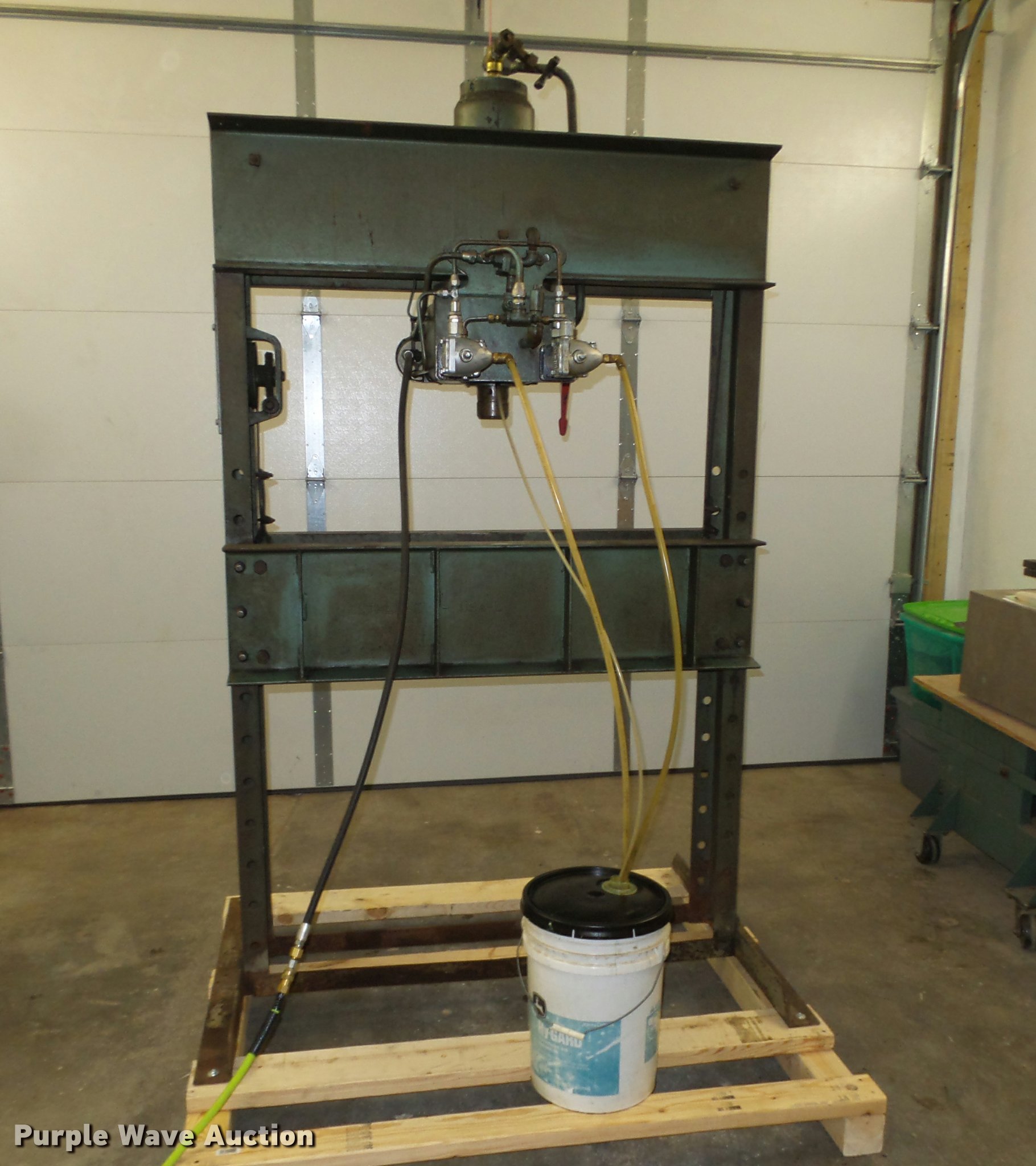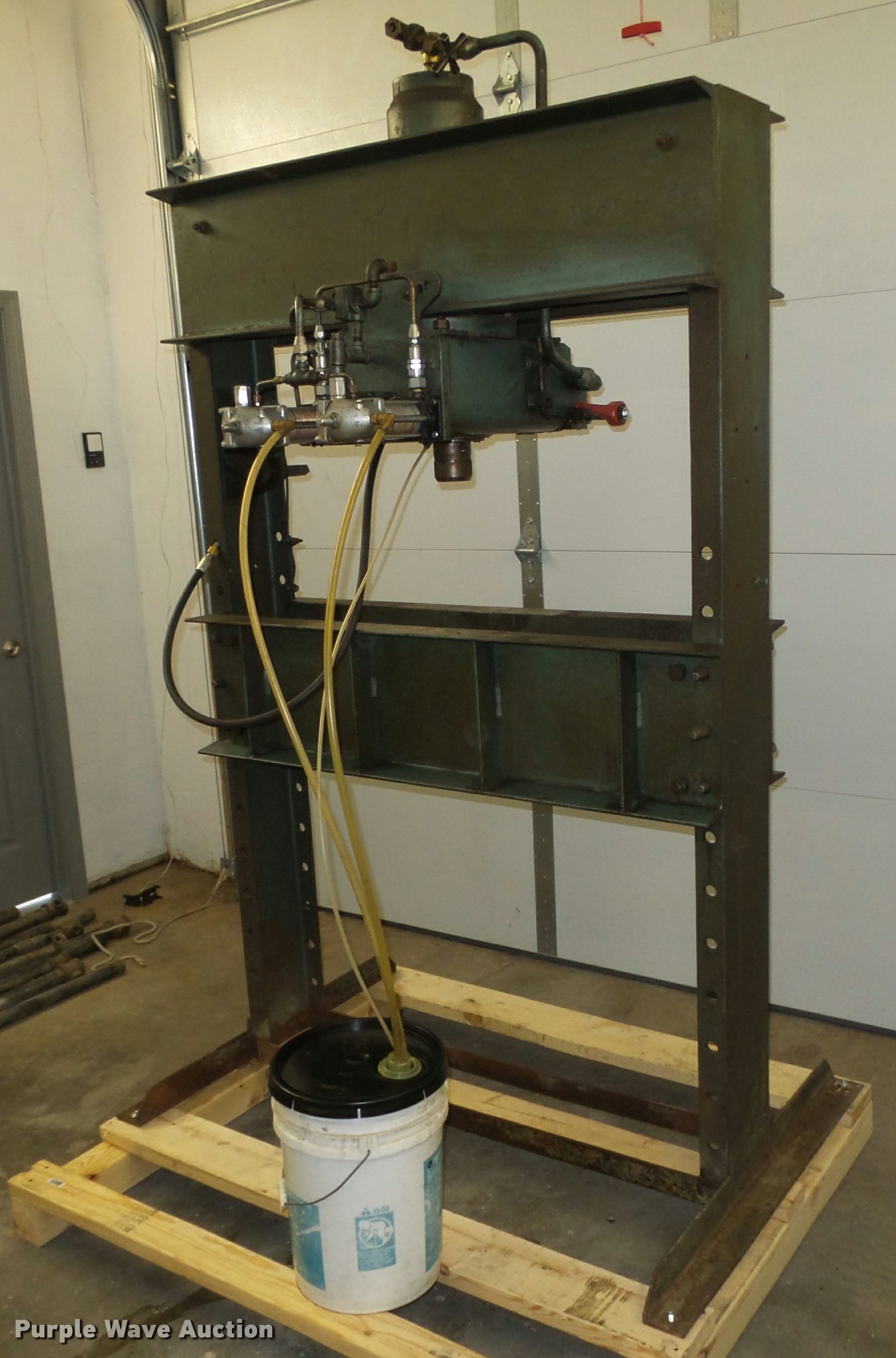 Purple Wave is selling a used Tools in Iowa. This item is a Dake 6-475 press with the following: 55"W x 36"D x 87"H, 75 ton, Air over hydraulic, Bucket, Bolted to pallet, 48" x 56" pallet base, Pallet jack not included, No handle for winch, Serial 157463, Unit# HP-7