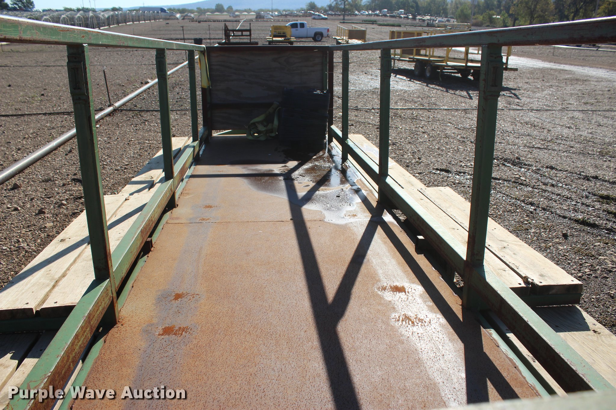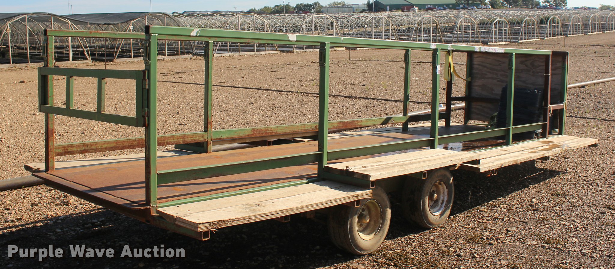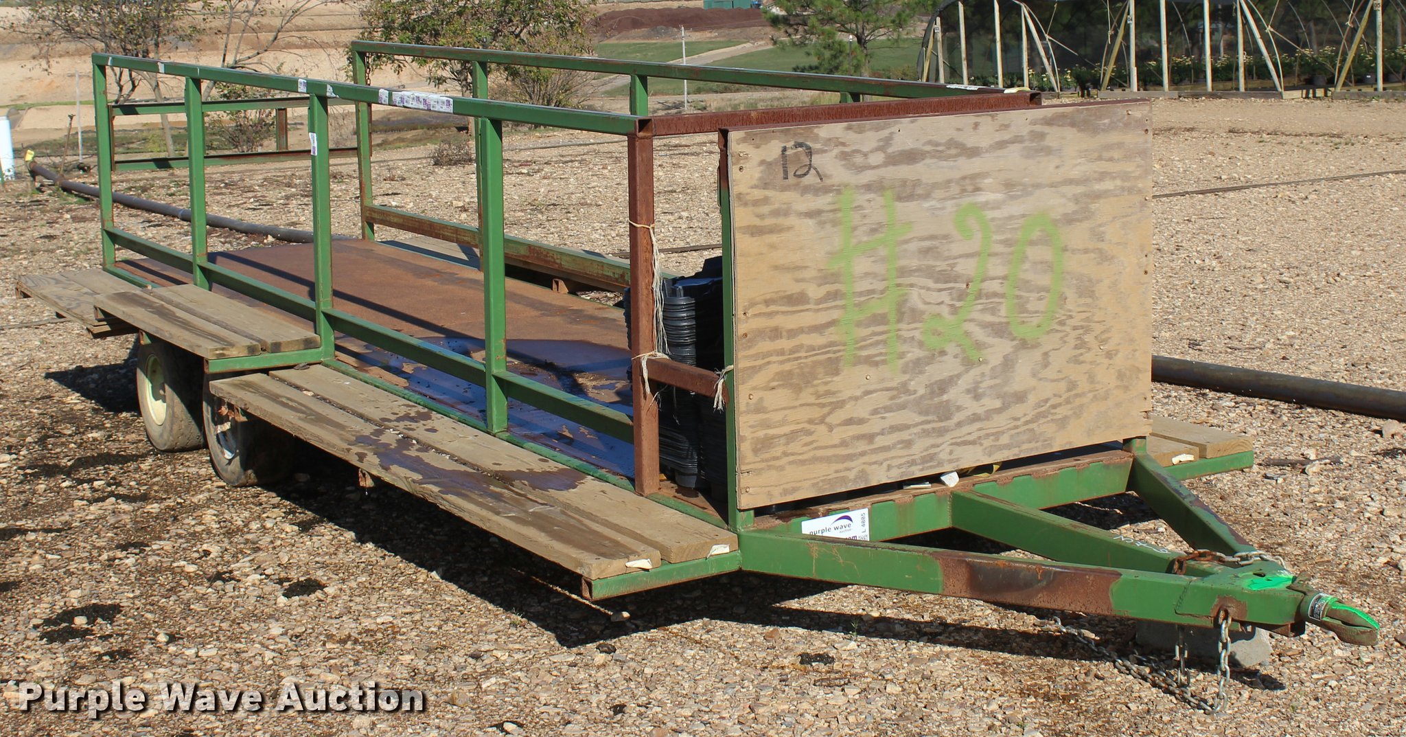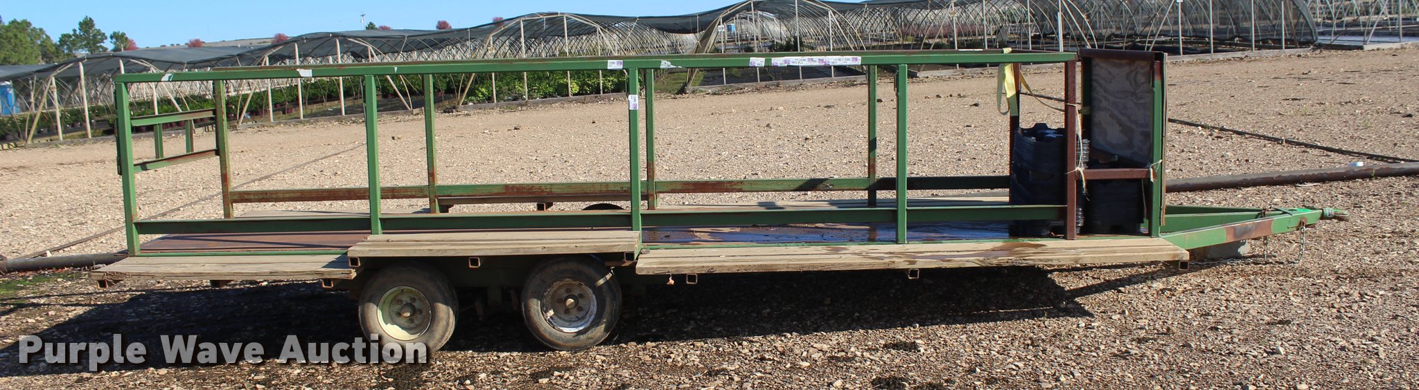 Purple Wave is selling a used Trailer Other in Oklahoma. This item is a Nursery/plant trailer with the following: 20'L x 82"W, 20'L x 52"W x 38"H enclosure, 52" rear gate, 15" wood running boards, Steel deck and frame, Strap hooks, 2" ball hitch, Jack stand, Tandem axle, 20.5x8.0-10 tires, Unit# 346