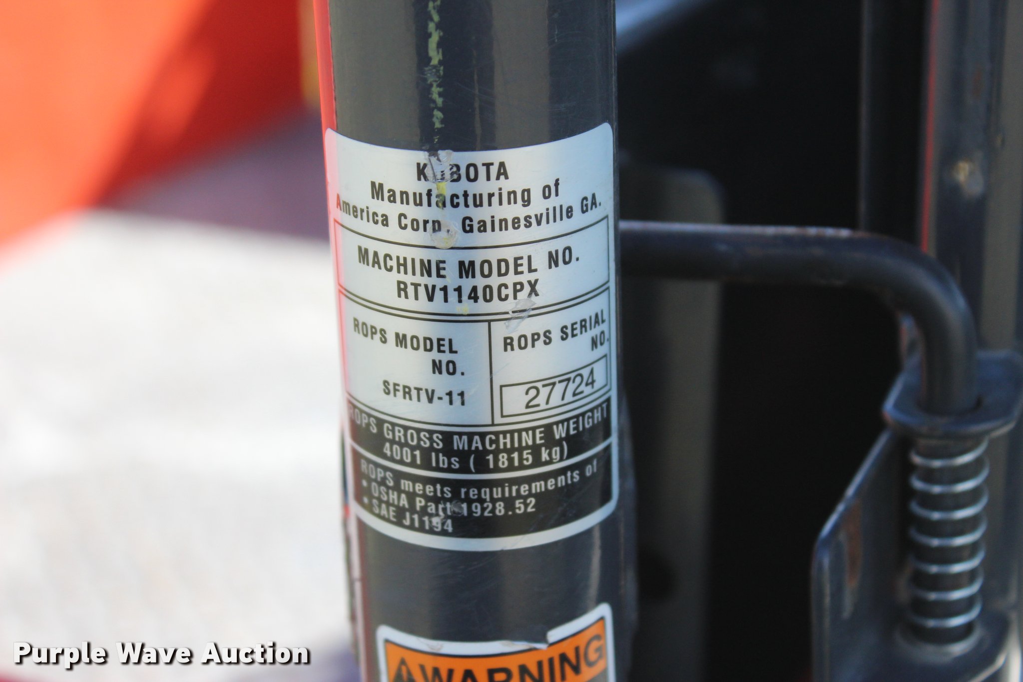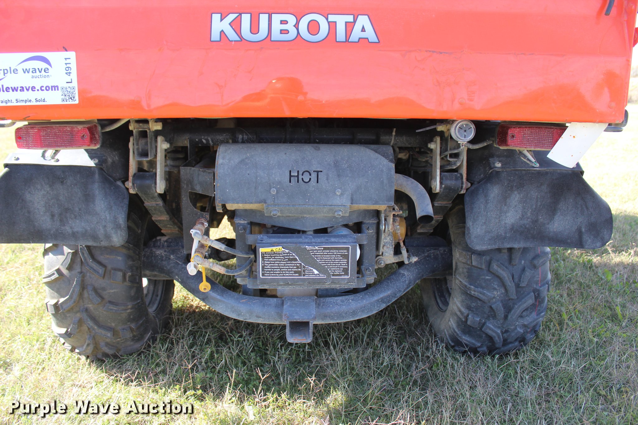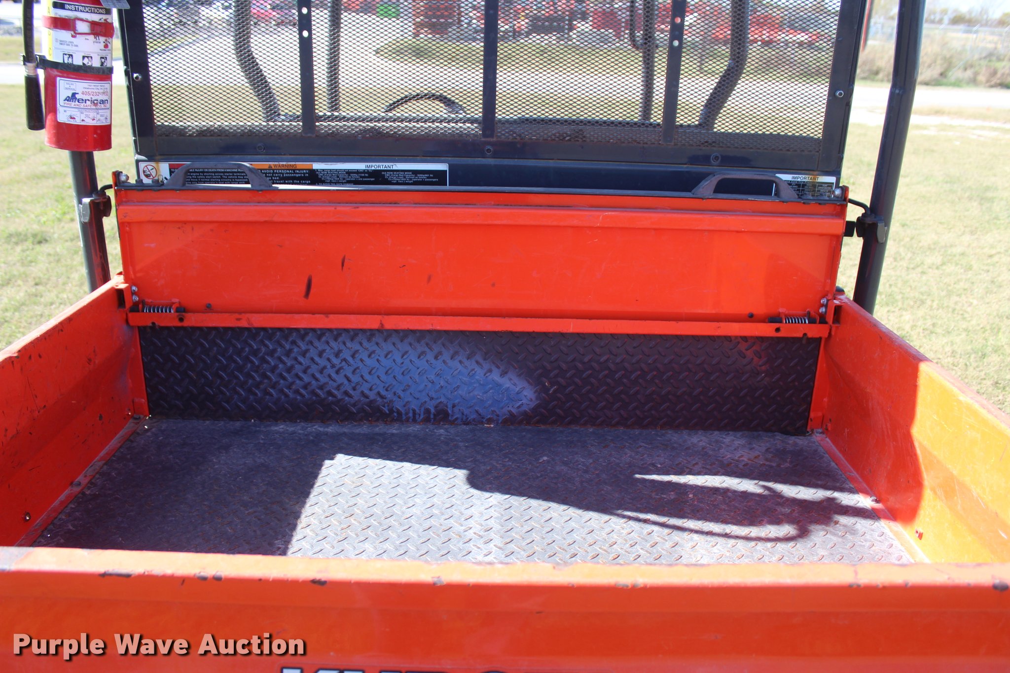 Purple Wave is selling a used Utility Vehicle in Oklahoma. This item is a 2014 Kubota RTV1140CPX utility vehicle with the following: 578 hours on meter, Kuboat three cylinder diesel engine, Hydrostatic transmission, Four wheel drive, Locking differential, OROPS, Four person capacity, Grill guard, Backup alarm, Hydraulic dump bed, Manual tailgate, Rear passenger screen, Turn signals, Receiver hitch, 25 x 12.00-12 tires, Serial 31870