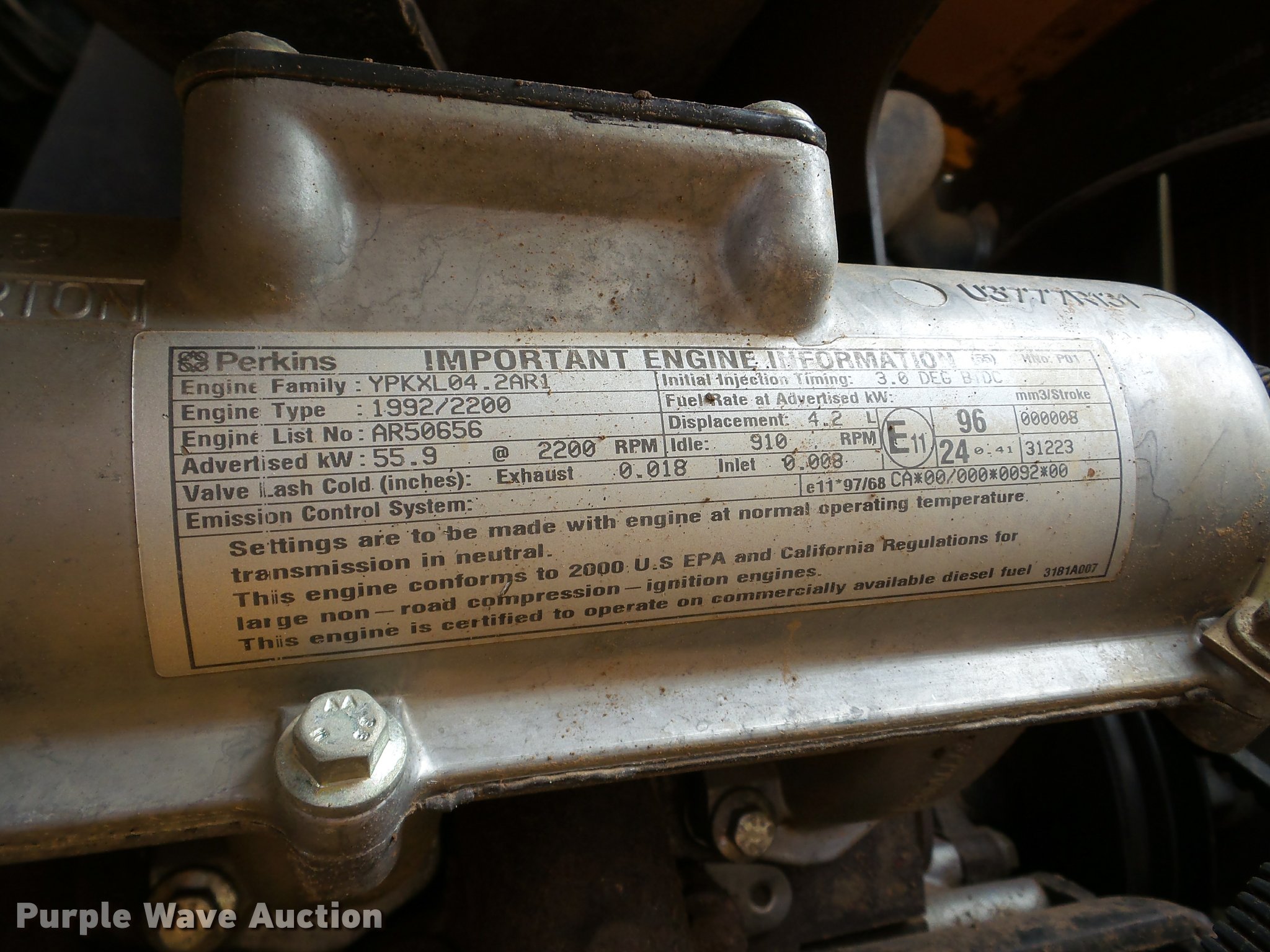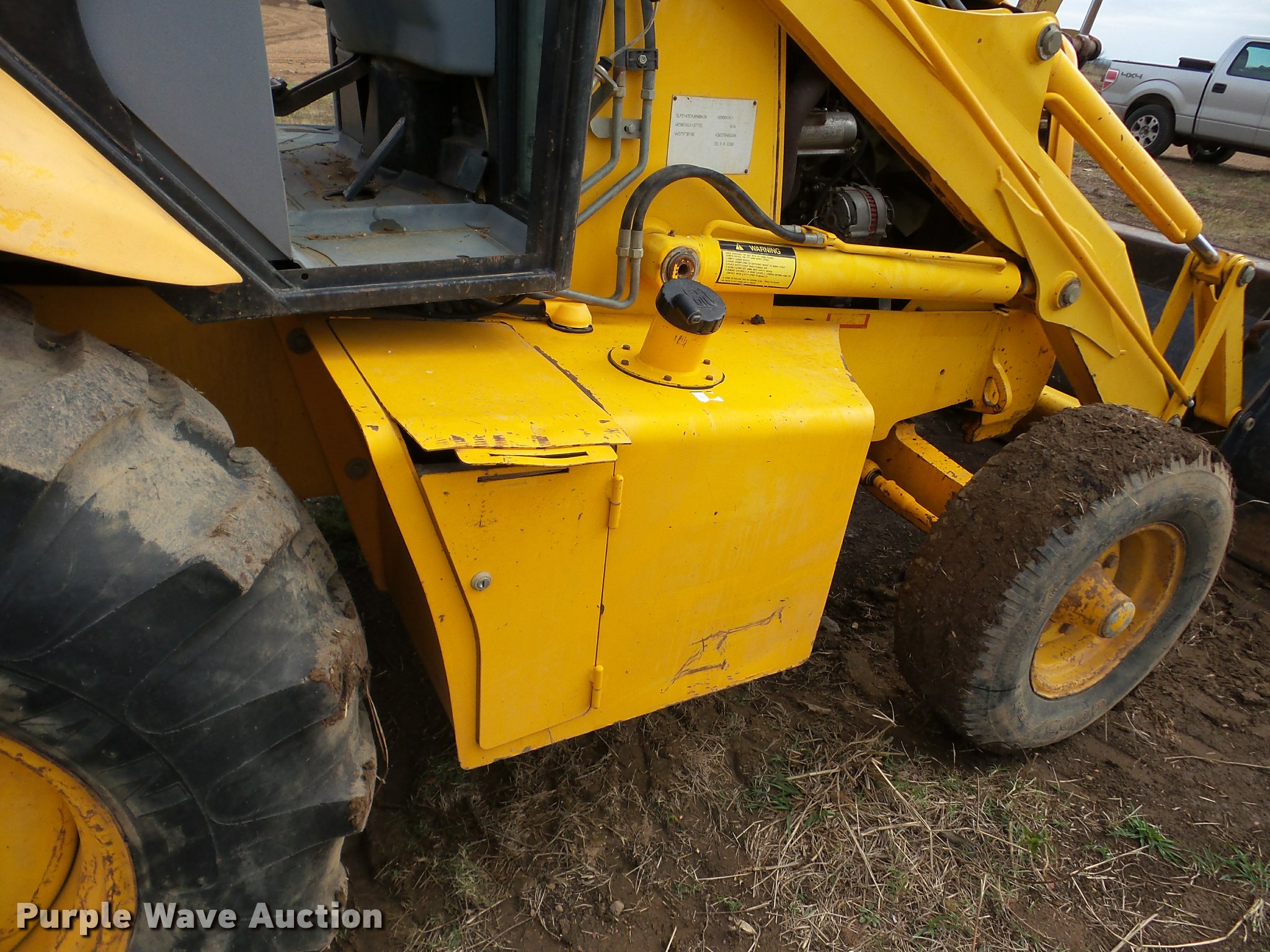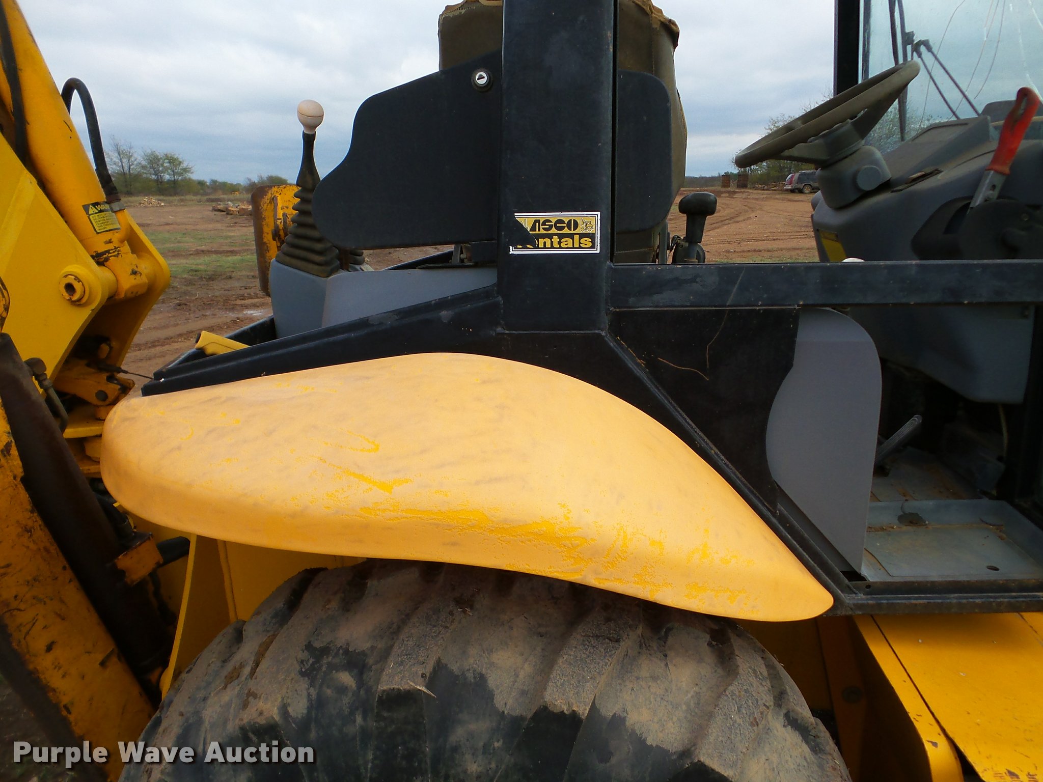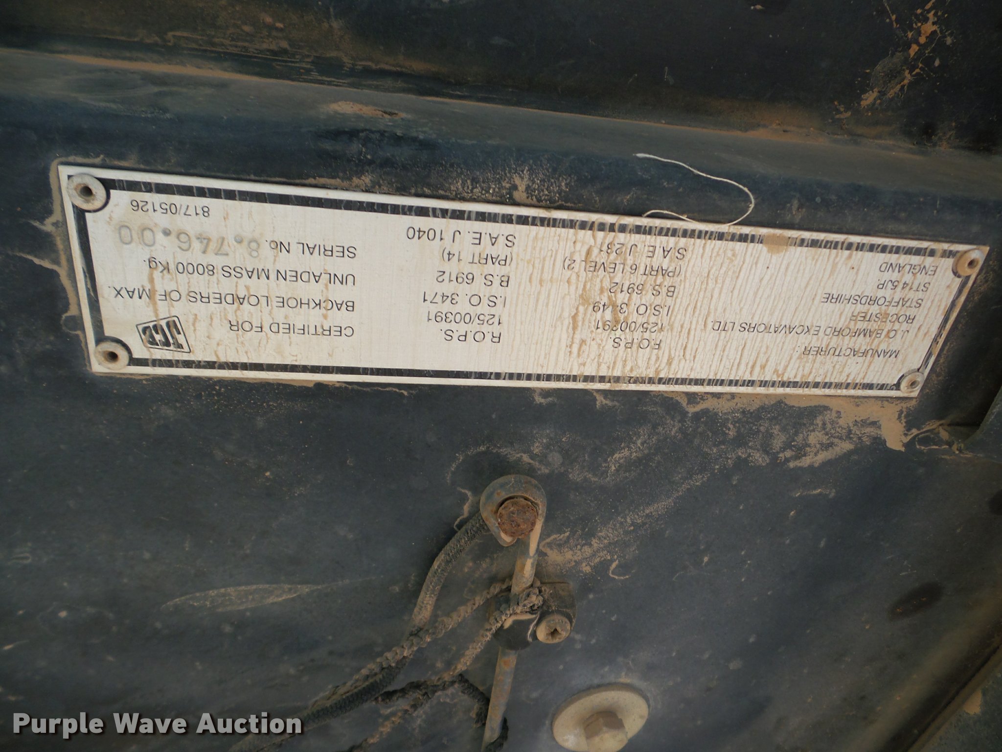 Purple Wave is selling a used Industrial Loader Tractor in Oklahoma. This item is a 2001 JCB 214E backhoe with the following: 2,991 hours on meter, Perkins YPKXL04.2AR1 diesel engine, Shuttle shift transmission, 4F-4R gears, EROPS, Suspension seat, Wobble stick backhoe controls, 87"W loader bucket, Bolt-on cutting edge, 21"W backhoe bucket, (3) teeth, 245/75R16 front tires, 17.5L-24 rear tires, Cab glass broken and missing, Hydraulic leak, Backhoe bucket teeth missing, Injector leak, Serial 0900434