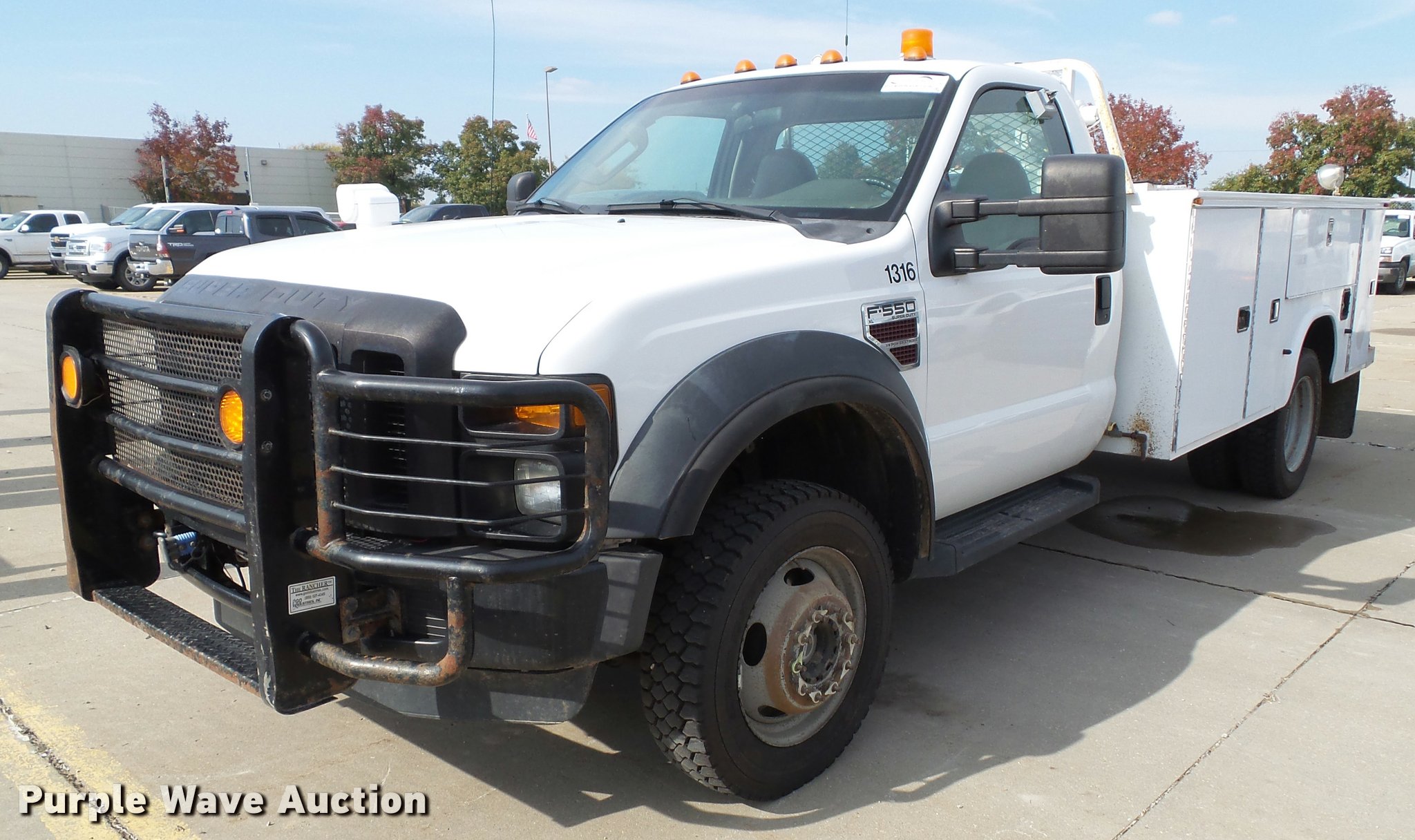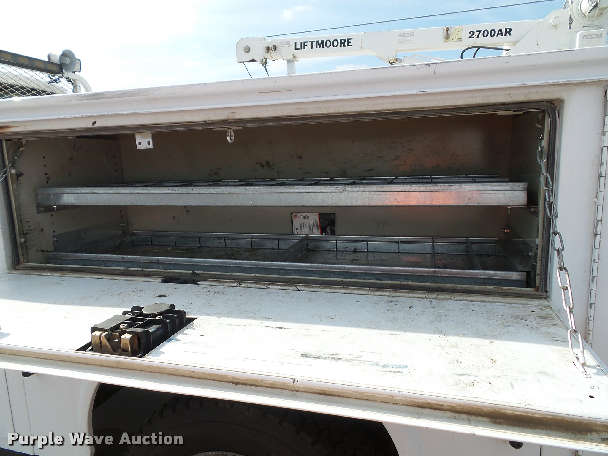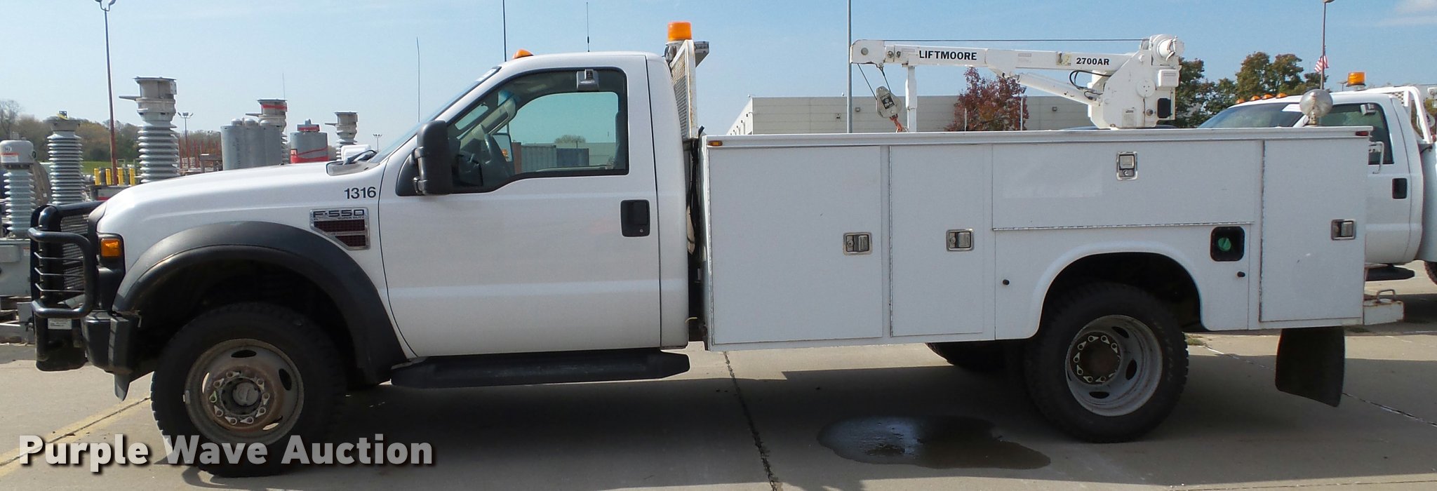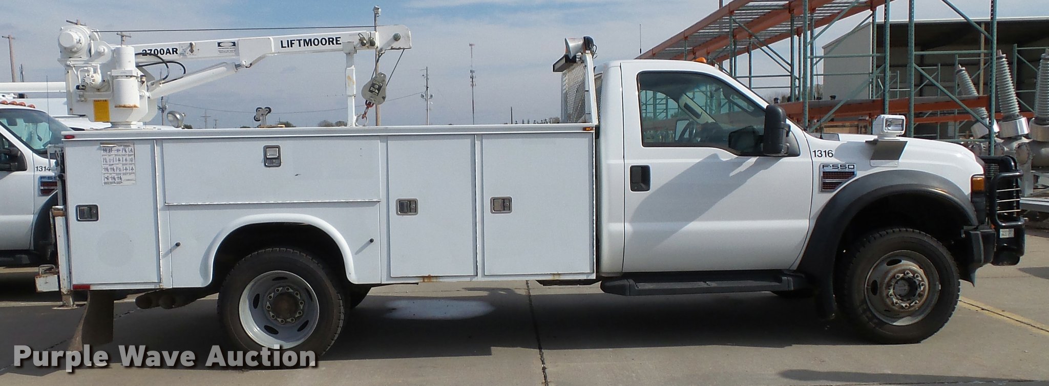 Purple Wave is selling a used Service Truck in Kansas. This item is a 2008 Ford F550 Super Duty XL service truck with crane with the following: 173,978 miles on odometer, 6.4L V8 OHV 32V turbo diesel engine, Automatic transmission, Four wheel drive, AC and heat, Tilt, Cruise, AM/FM/CD, Manual windows and locks, Vinyl interior, Knapheide 6132D54J utility bed, (8) compartments, Slide-out drawers, Rear stabilizer jack, Tommy lift end gate, Rusted, Exterior worklights, Strobe light, Light bar, Liftmoore 2700AR crane, 2,700 lbs maximum lift capacity, 75 degree maximum lift angle, Remote, Backup alarm, Running boards, Grill guard, Front tow hooks, Pintle hitch, Trailer wiring, 225/70R19.5 tires, GVWR 19,000 lbs, FAWR 7,000 lbs, RAWR 13,660 lbs, Hail damage, Windshield chipped, Unit# 1316
