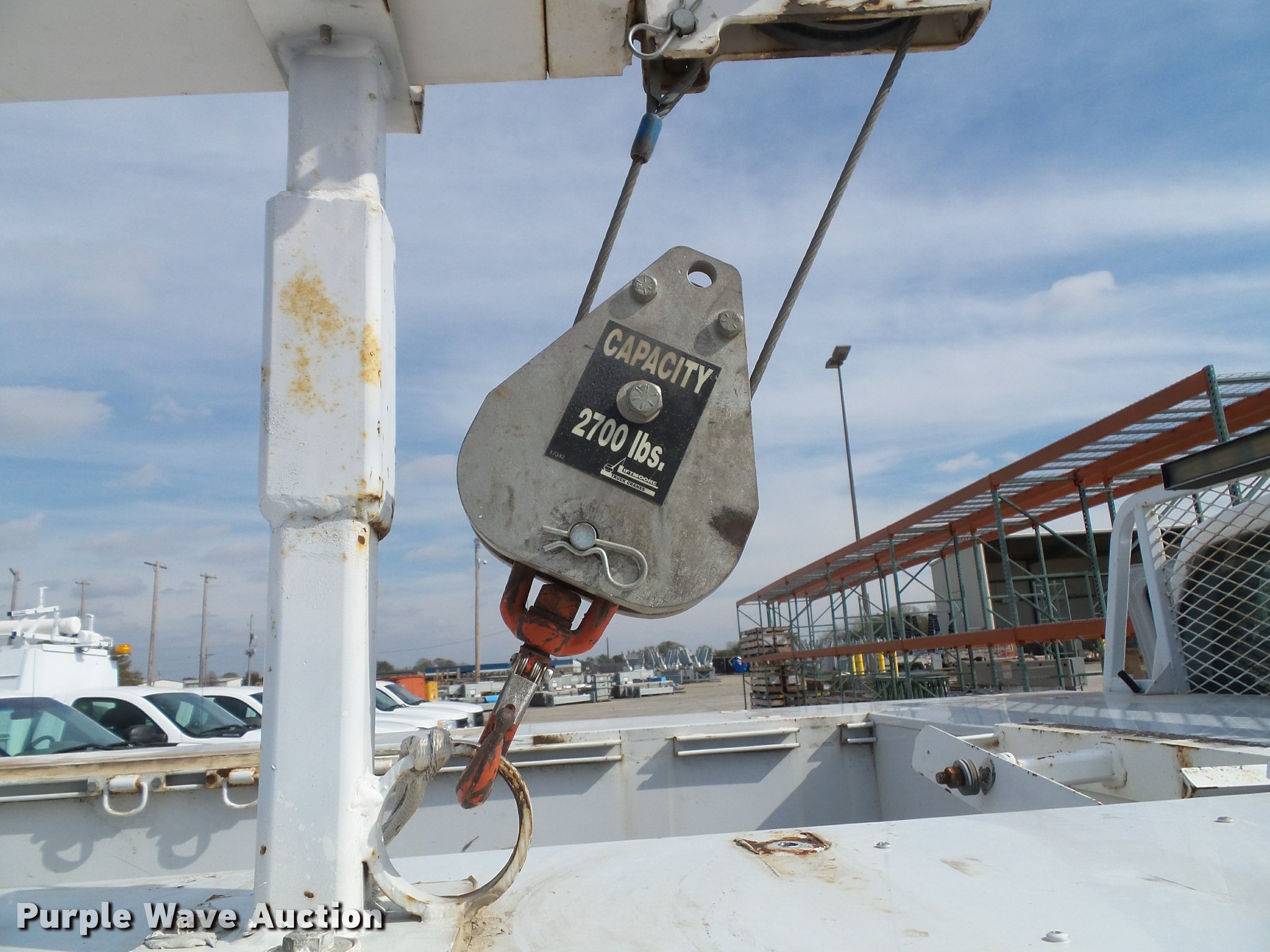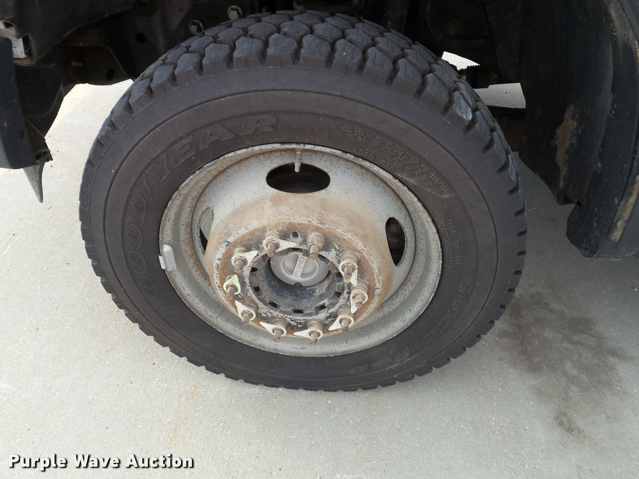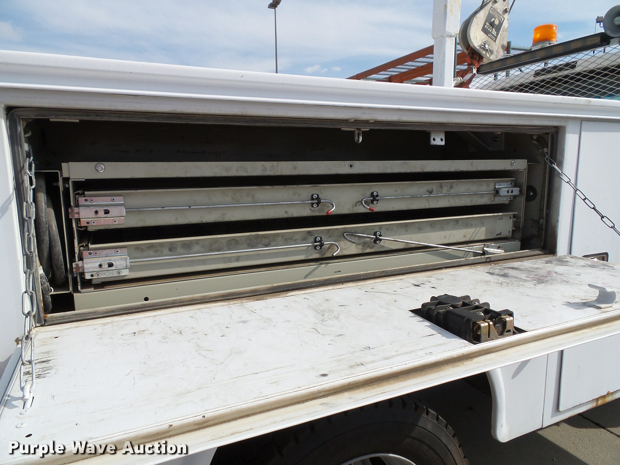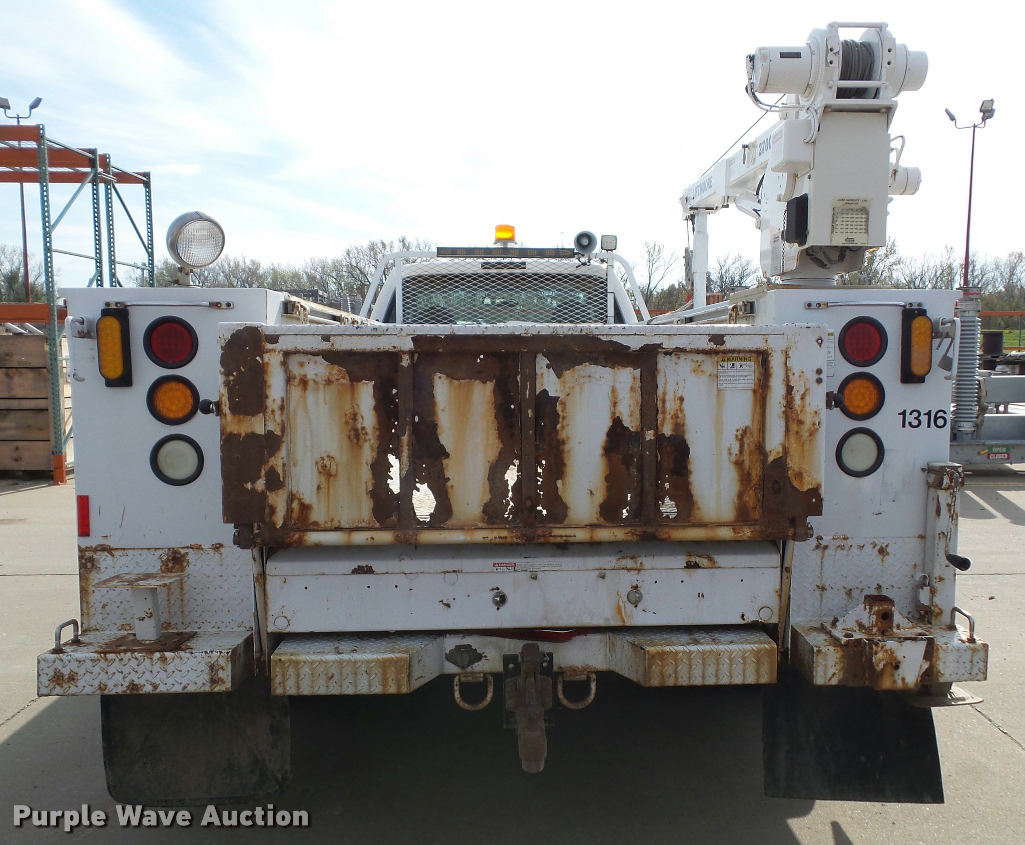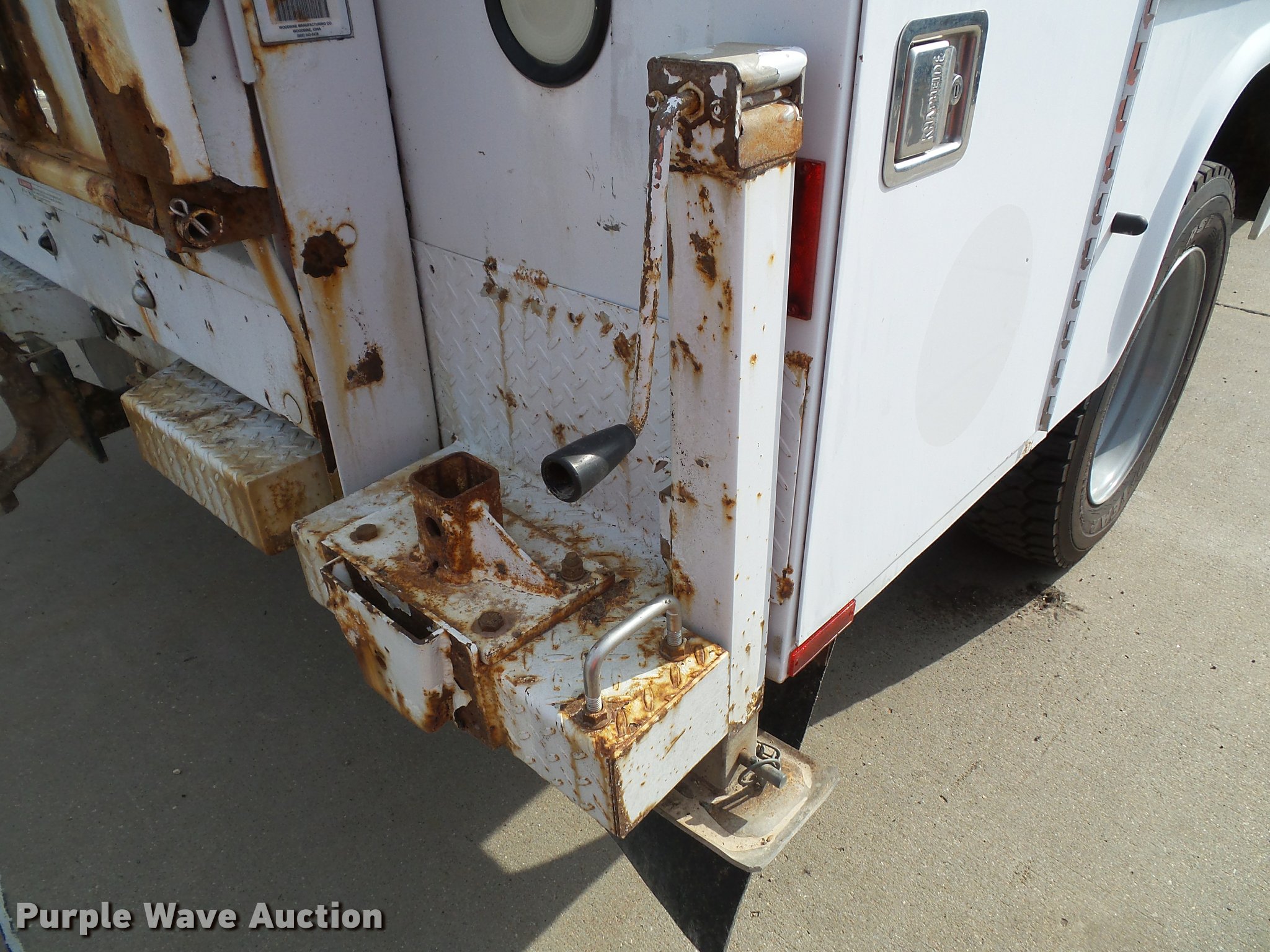 Purple Wave is selling a used Service Truck in Kansas. This item is a 2008 Ford F550 Super Duty XL service truck with crane with the following: 173,978 miles on odometer, 6.4L V8 OHV 32V turbo diesel engine, Automatic transmission, Four wheel drive, AC and heat, Tilt, Cruise, AM/FM/CD, Manual windows and locks, Vinyl interior, Knapheide 6132D54J utility bed, (8) compartments, Slide-out drawers, Rear stabilizer jack, Tommy lift end gate, Rusted, Exterior worklights, Strobe light, Light bar, Liftmoore 2700AR crane, 2,700 lbs maximum lift capacity, 75 degree maximum lift angle, Remote, Backup alarm, Running boards, Grill guard, Front tow hooks, Pintle hitch, Trailer wiring, 225/70R19.5 tires, GVWR 19,000 lbs, FAWR 7,000 lbs, RAWR 13,660 lbs, Hail damage, Windshield chipped, Unit# 1316
