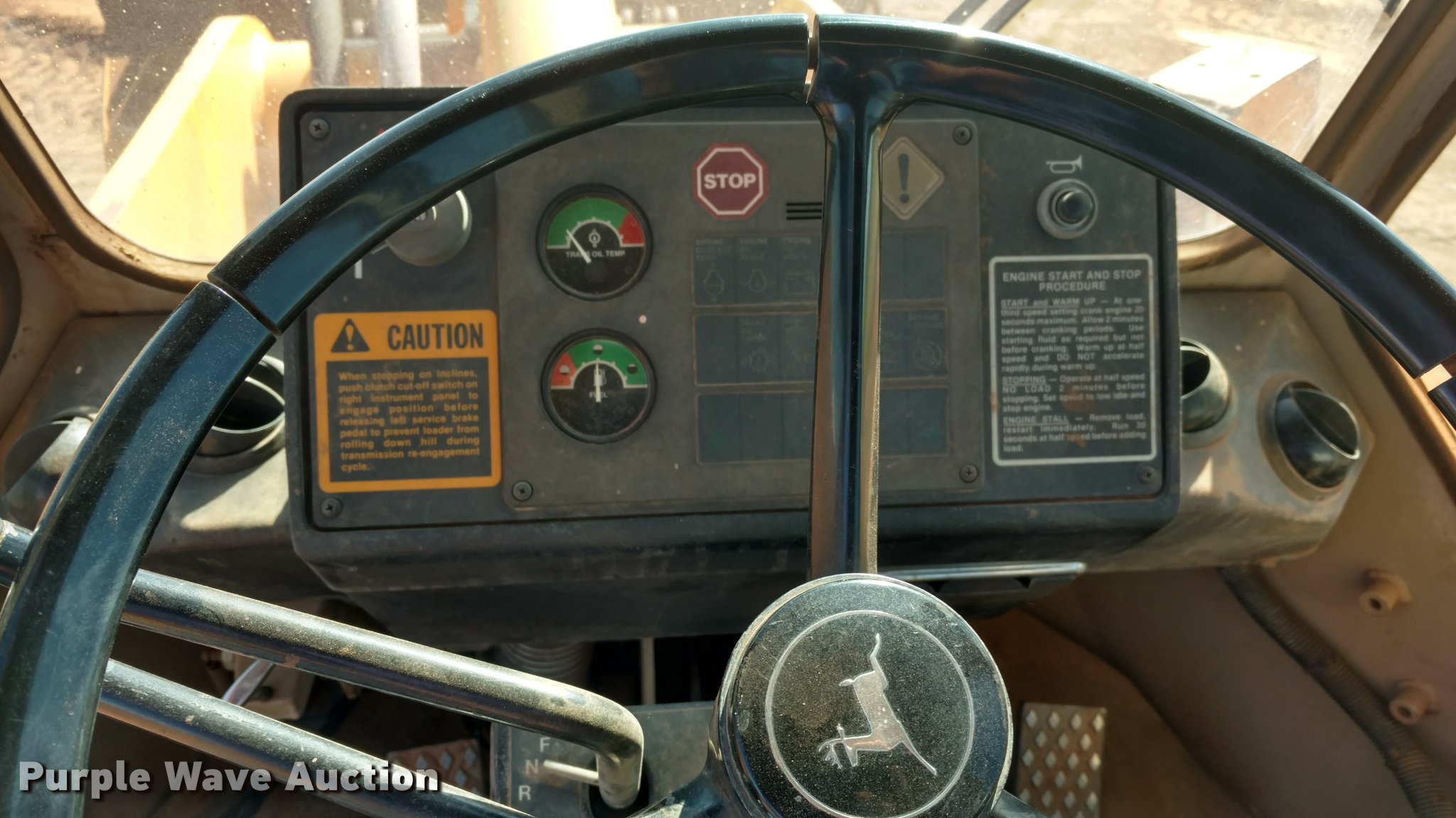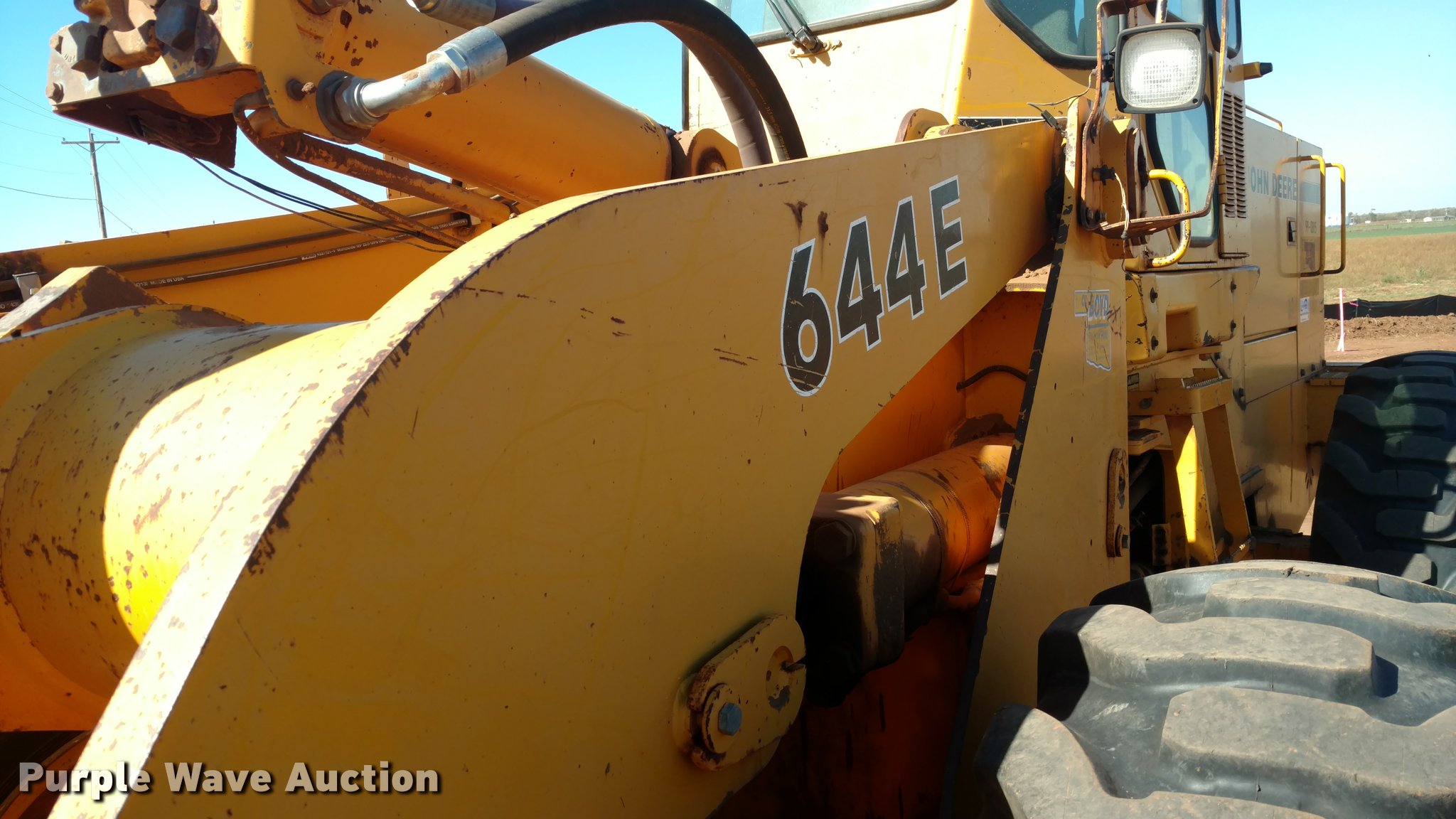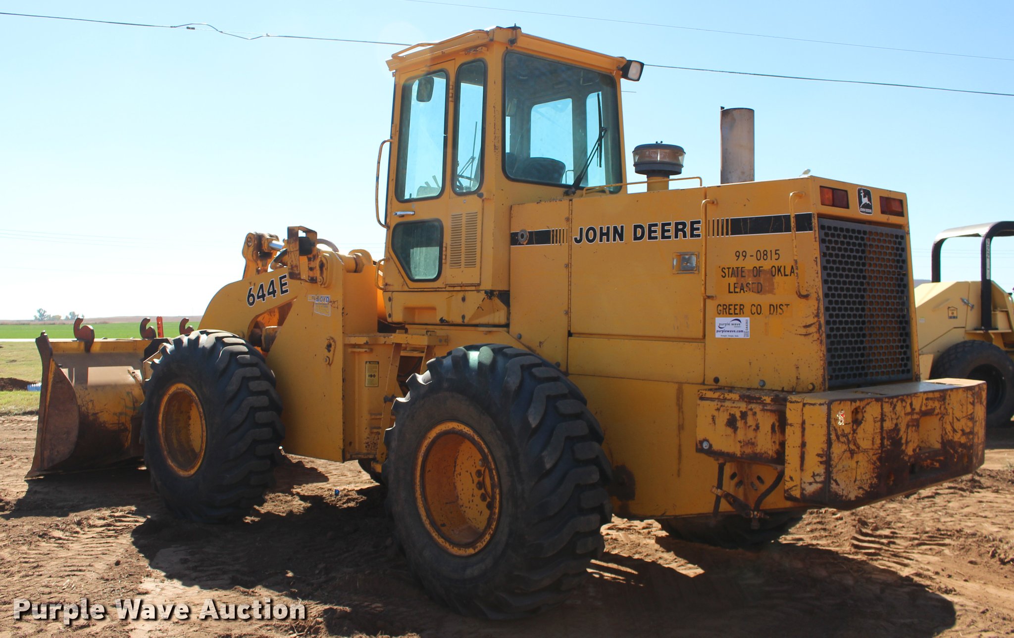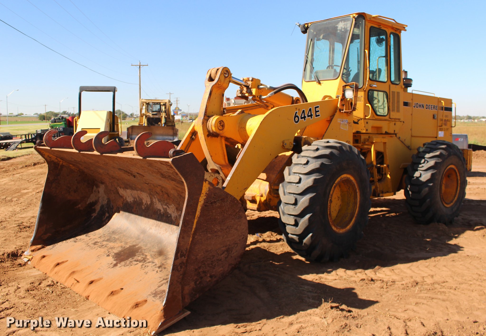 Purple Wave is selling a used Wheel Loader in Oklahoma. This item is a 1988 John Deere 644E wheel loader with the following: 7,325 hours on meter, John Deere six cylinder turbo diesel engine, Powershift transmission, 4F-3R gears, EROPS, Tilt steering wheel, Suspension seat, Joystick bucket controls, 110"W general purpose bucket, 3/4 cu. yd. capacity, JRB hydraulic quick coupler, Counterweights, 20.5-25 tires, Serial DW644EB519730