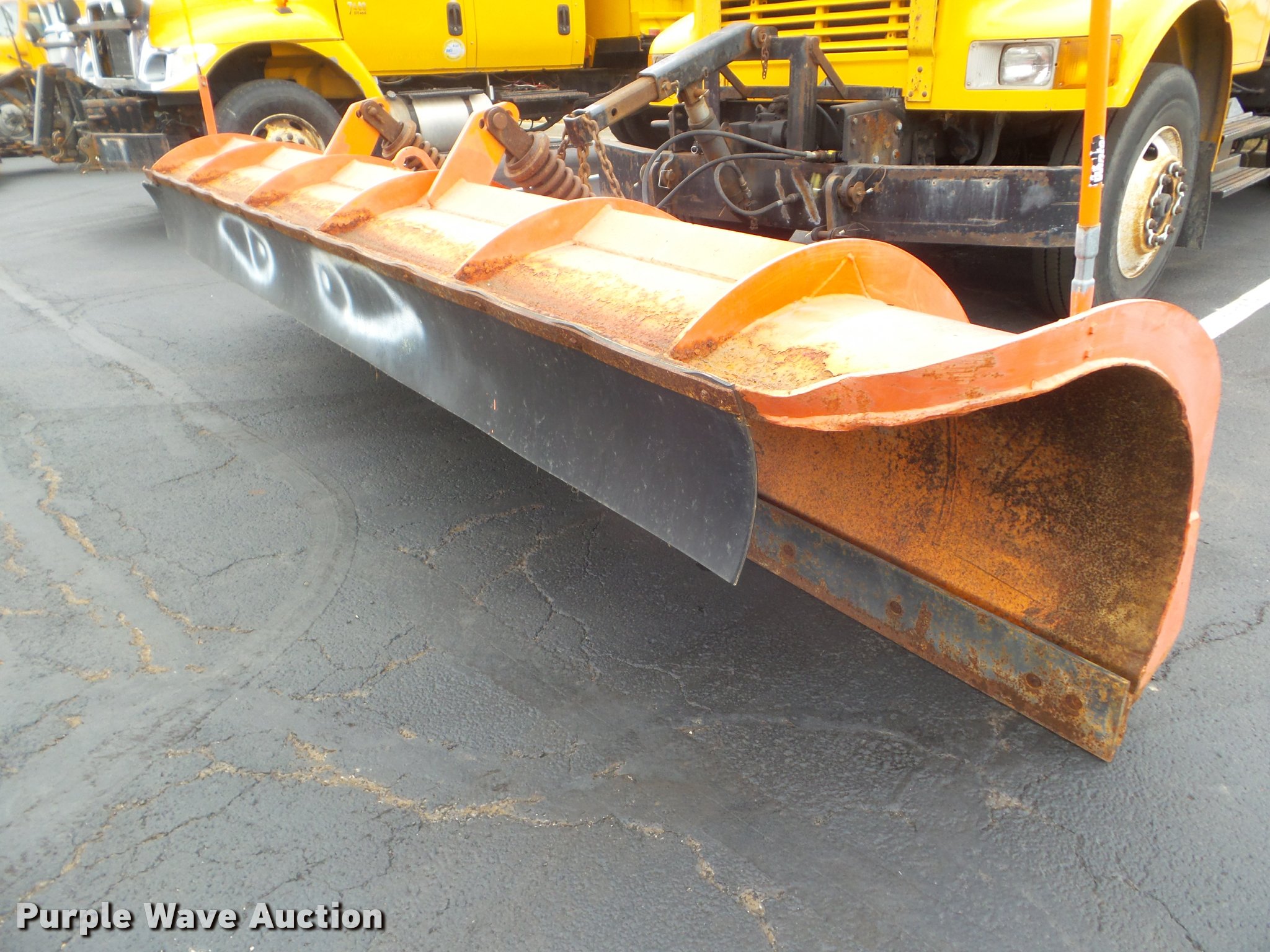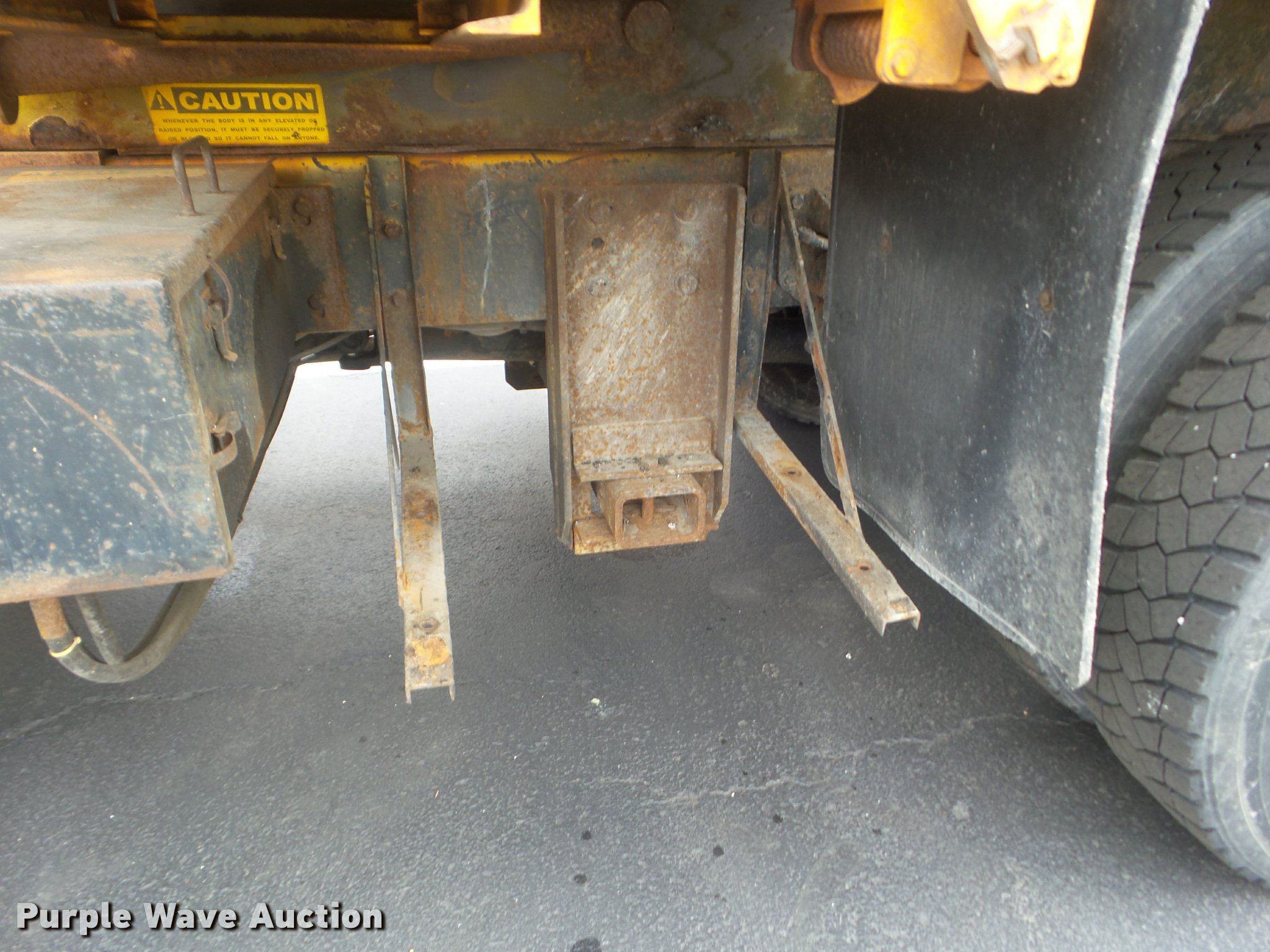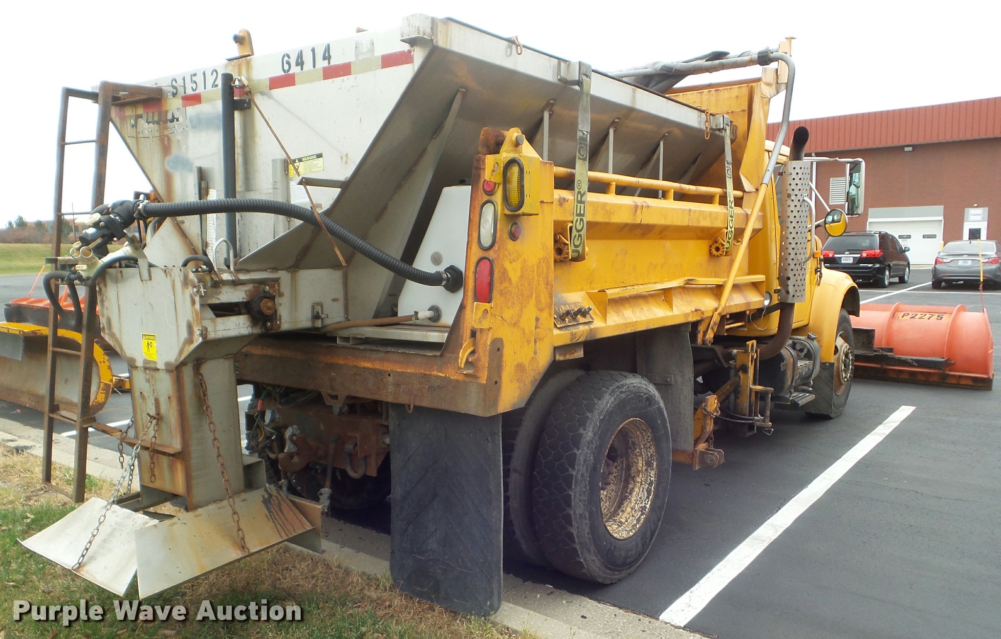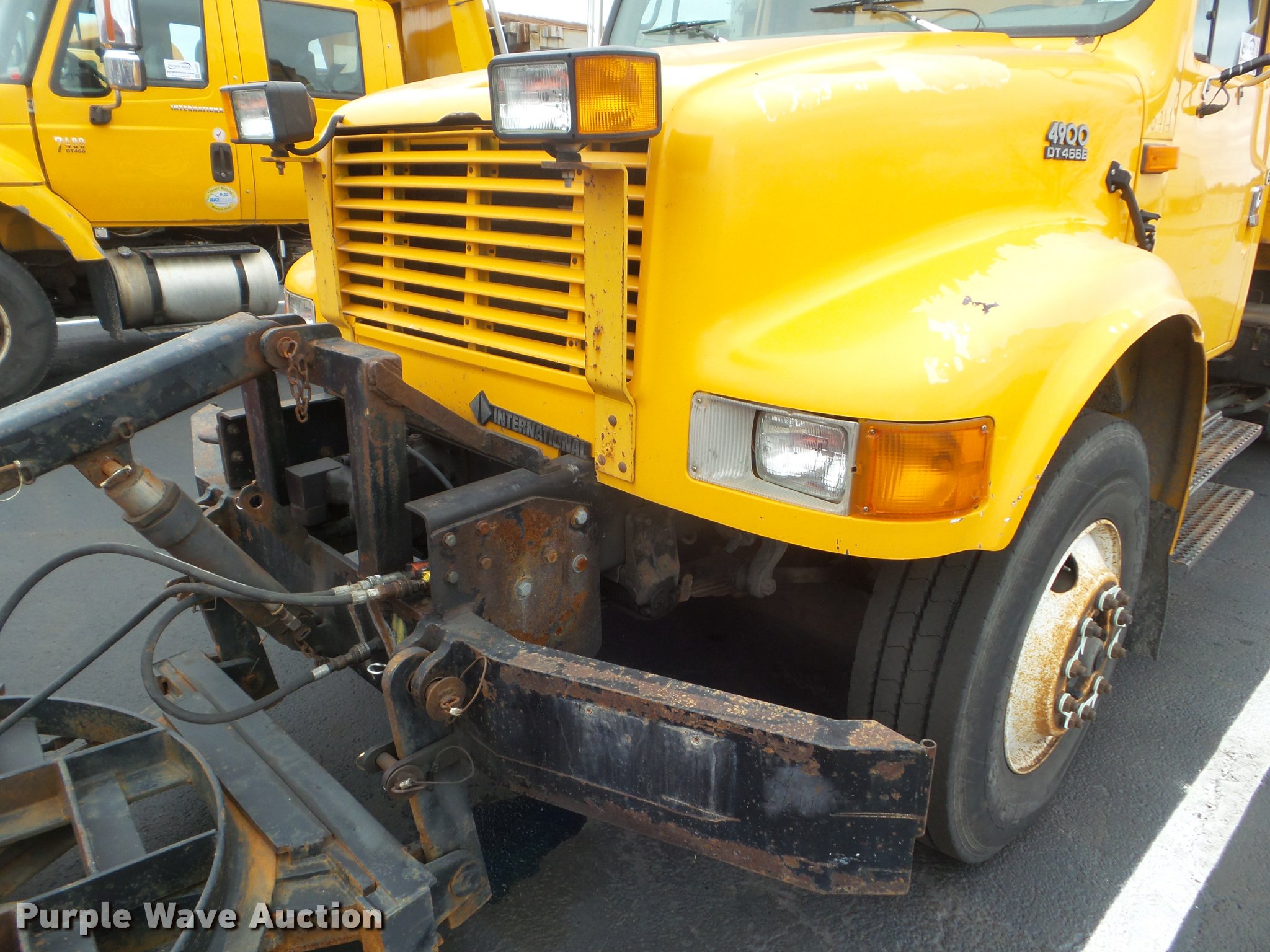 Purple Wave is selling a used Construction Dump Truck in Missouri. This item is a 2001 International 4900 dump truck with the following: 173,576 miles on odometer, Actual mileage unknown, 10,290 hours on meter, International DT466 7.6L L6 turbo diesel engine, Automatic transmission, Single axle, Heat, Cruise, AM/FM, Heated mirrors, Air suspension seat, Block heater, PTO, Steel dump bed, 10'L x 8'W, 24" side height, Single ram hoist, Air operated end gate, Roll tarp, Flink spreader, 14'W snow plow, Wing plow mounting bracket, Single fuel tank, Pintle hitch, Trailer wiring, 170" wheel base, Spring suspension, Air brakes, 11R22.5 tires, Hydraulic pump leaks, Rust hole in muffler, Engine leak, CB radio is not included, MODOT ID 6414