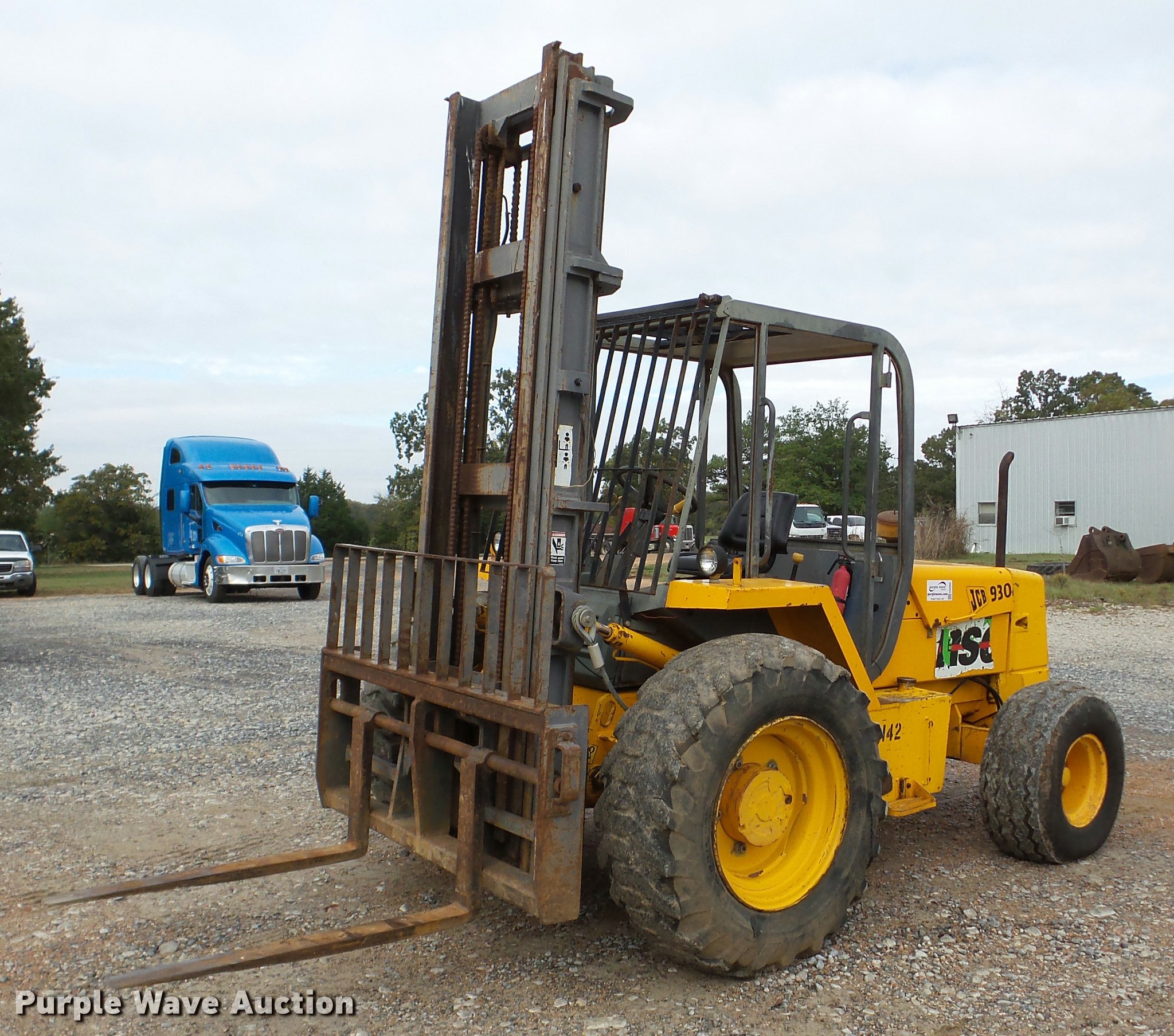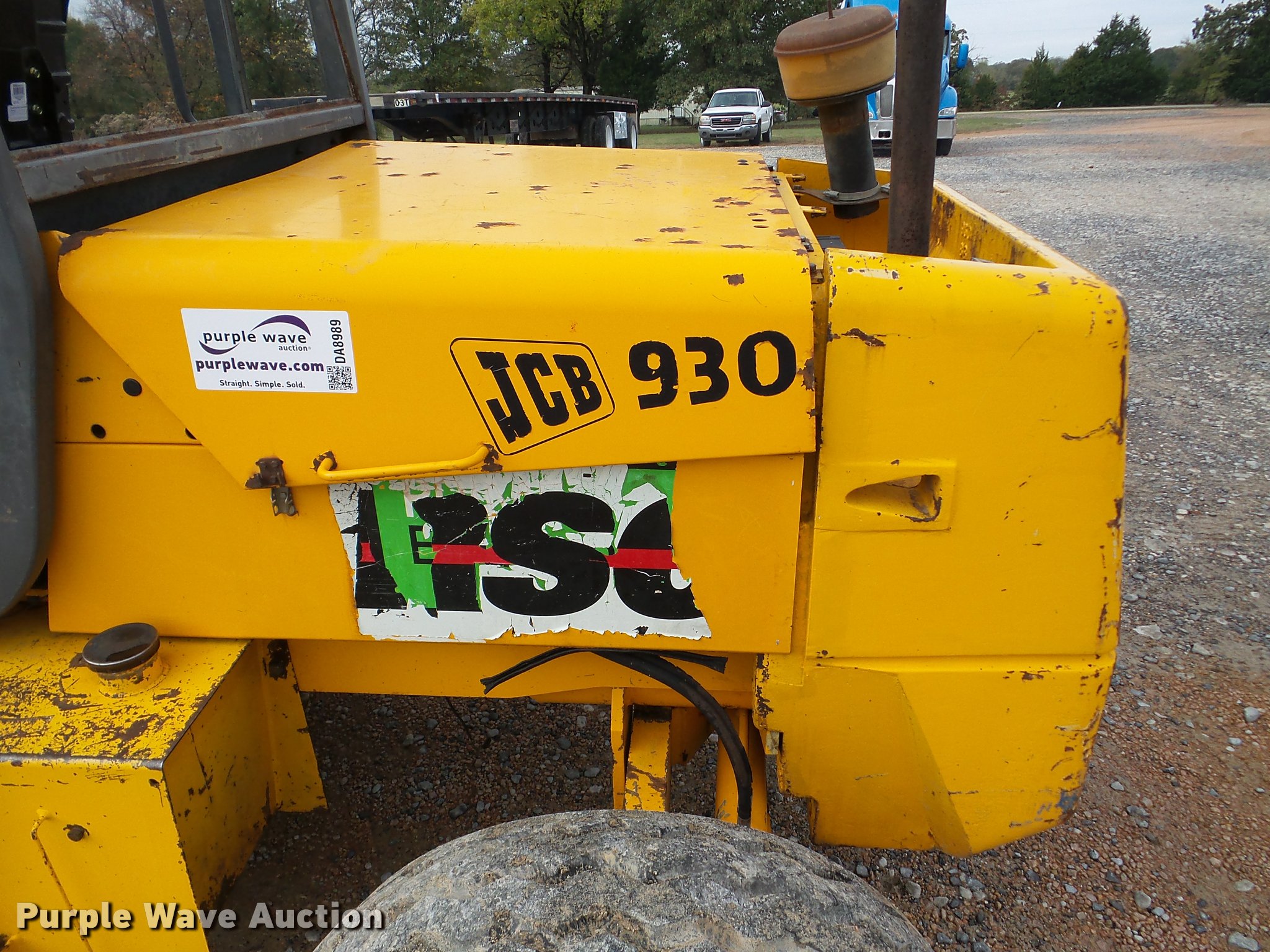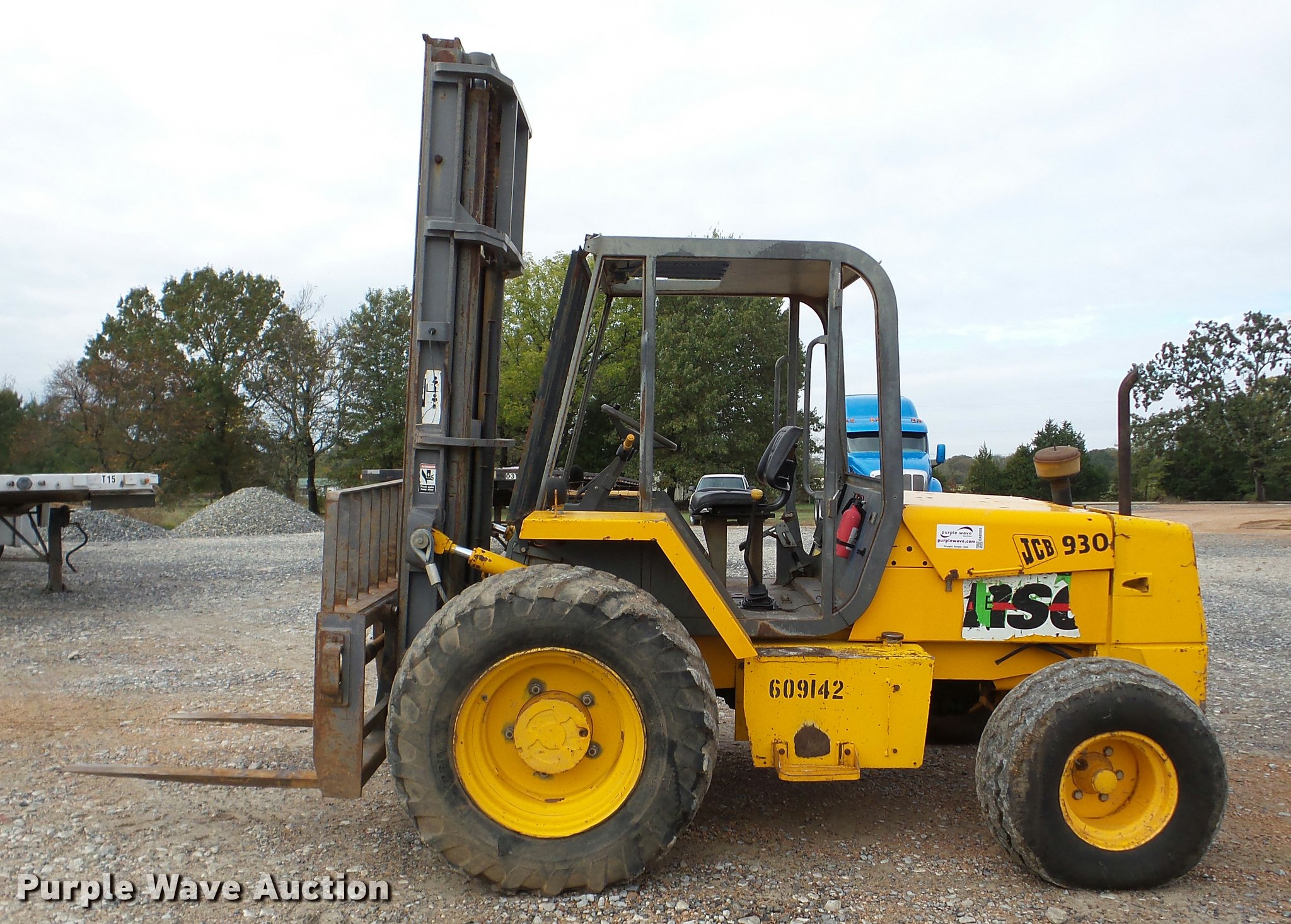 Purple Wave is selling a used Strt. Mast Rough Terr. Forklift in Oklahoma. This item is a 1994 JCB 930 forklift with the following: Four cylinder diesel engine, Shuttle shift transmission, 4F-4R gears, OROPS, Work lights, 15' maximum lift height, Two mast stages, Side shift, Mast tilt, 4' fork length, 15.5-25 front tires, 14.5/75-16.1 rear tires, Serial 609142