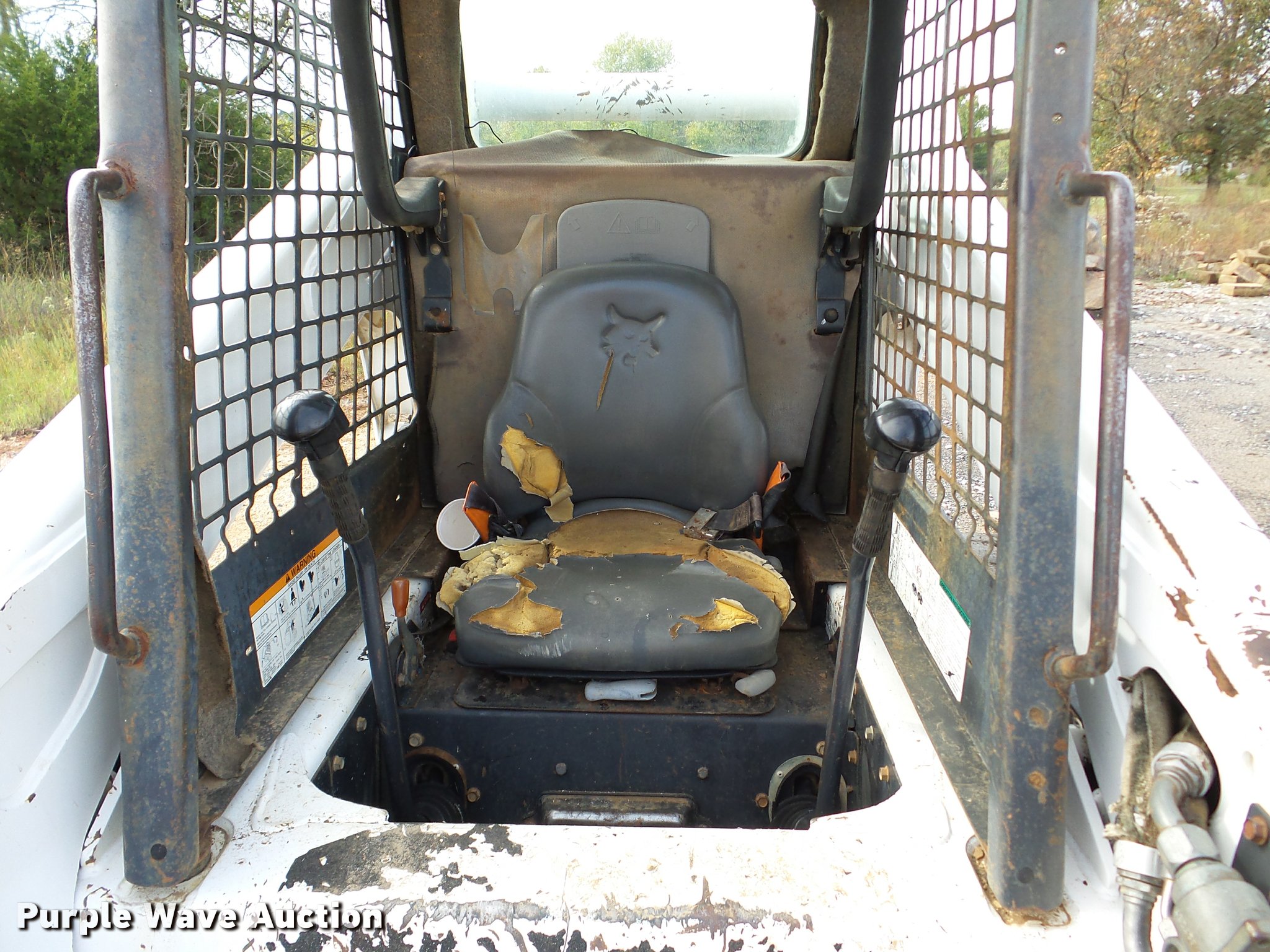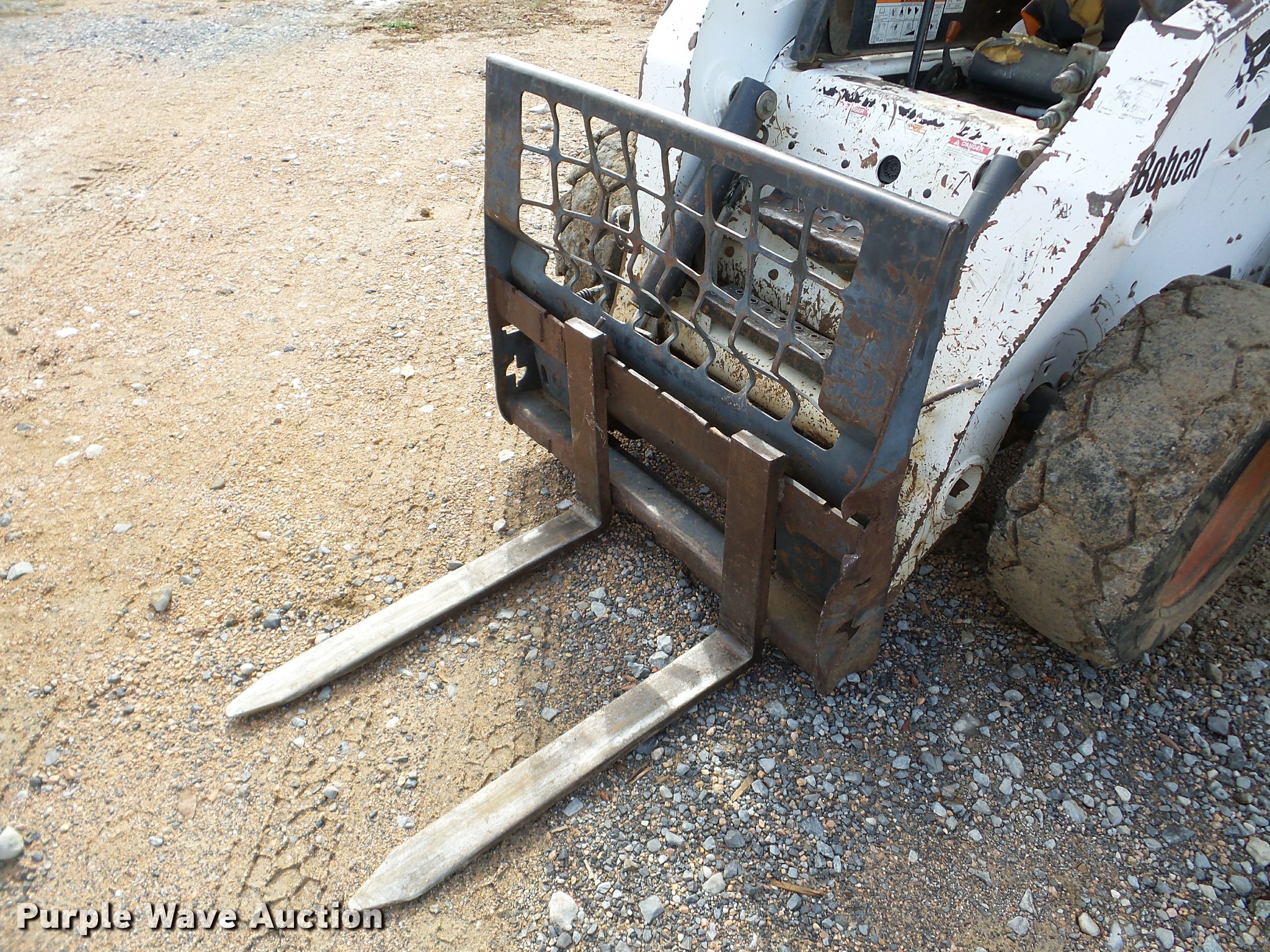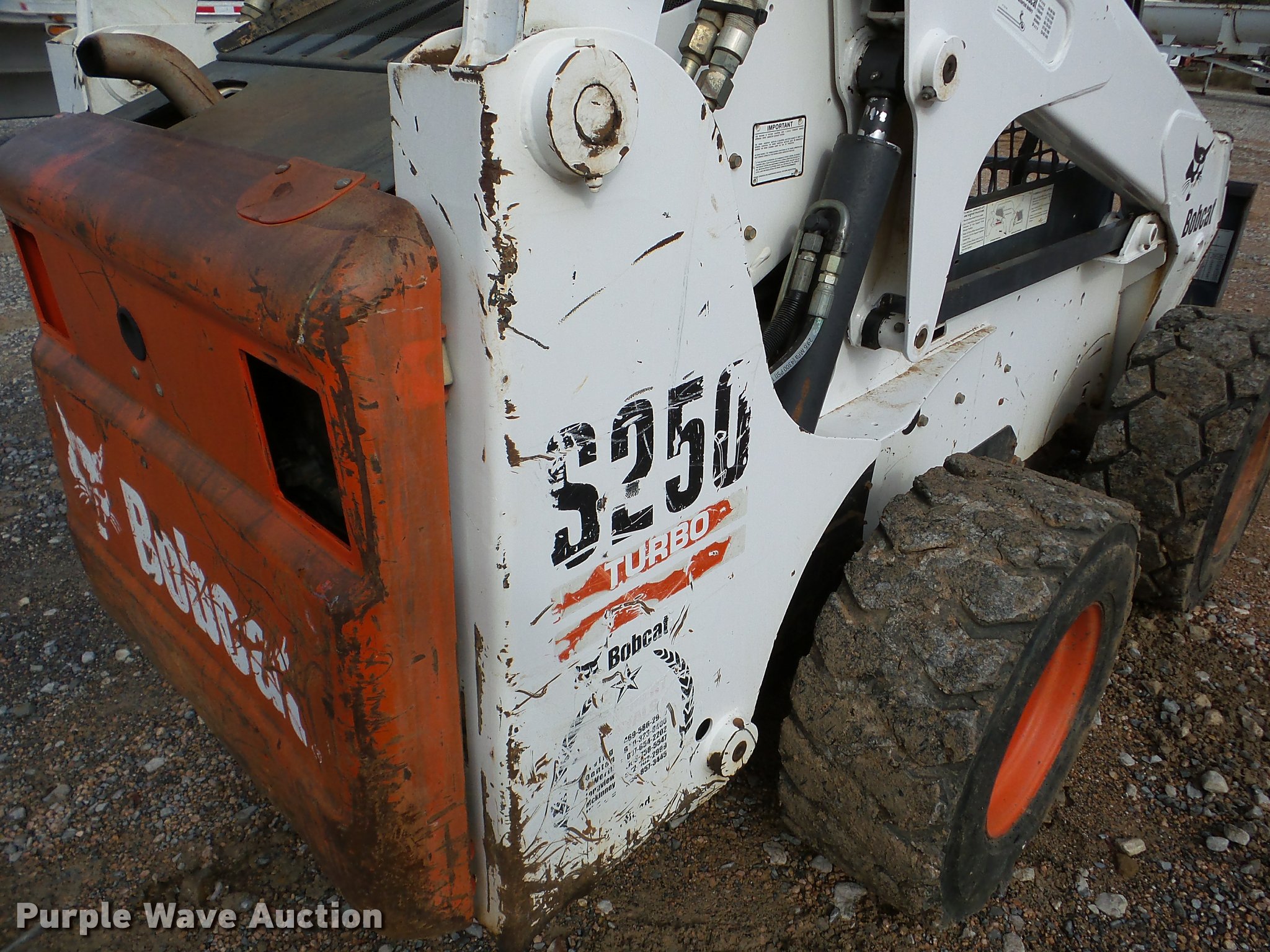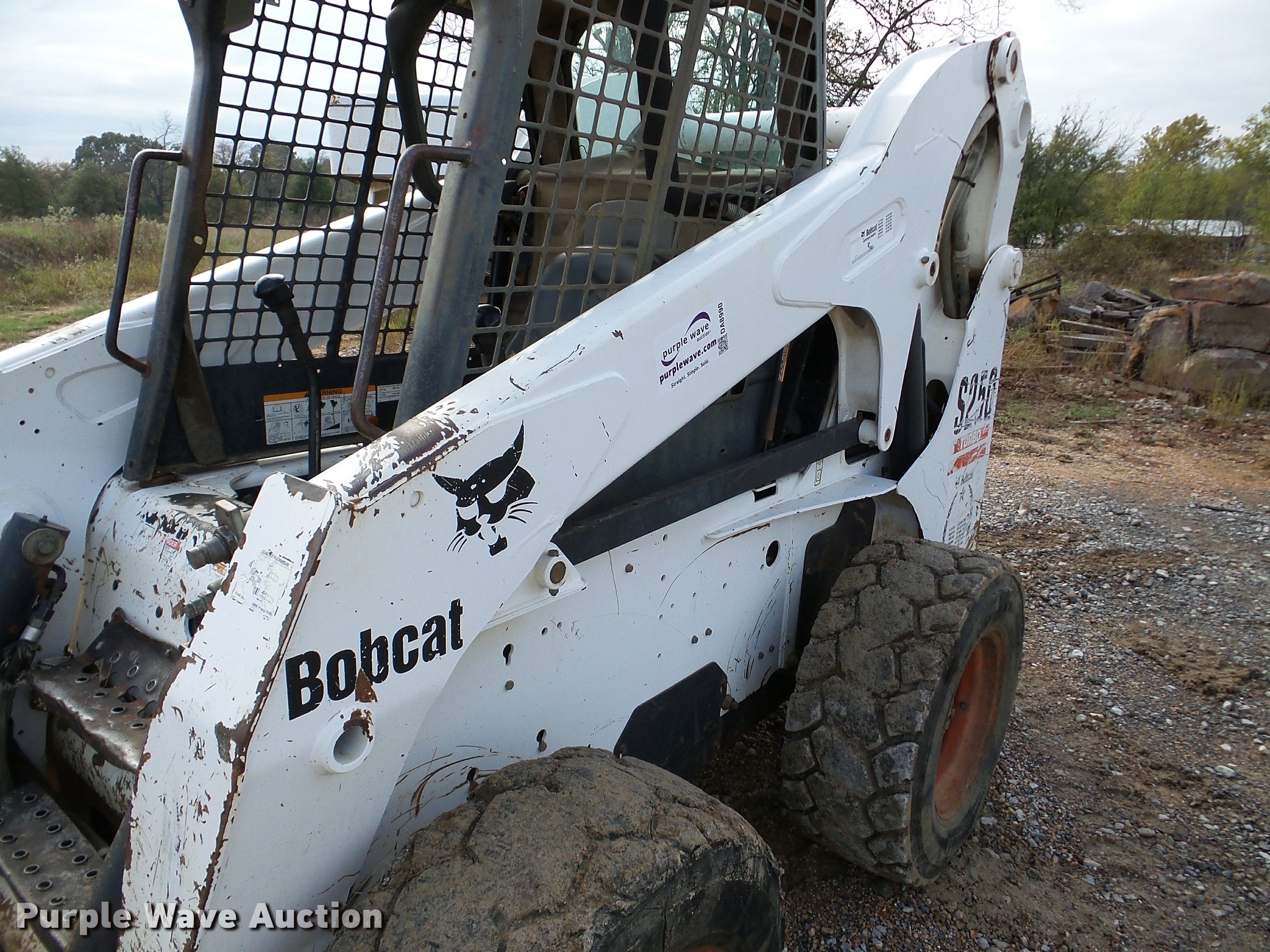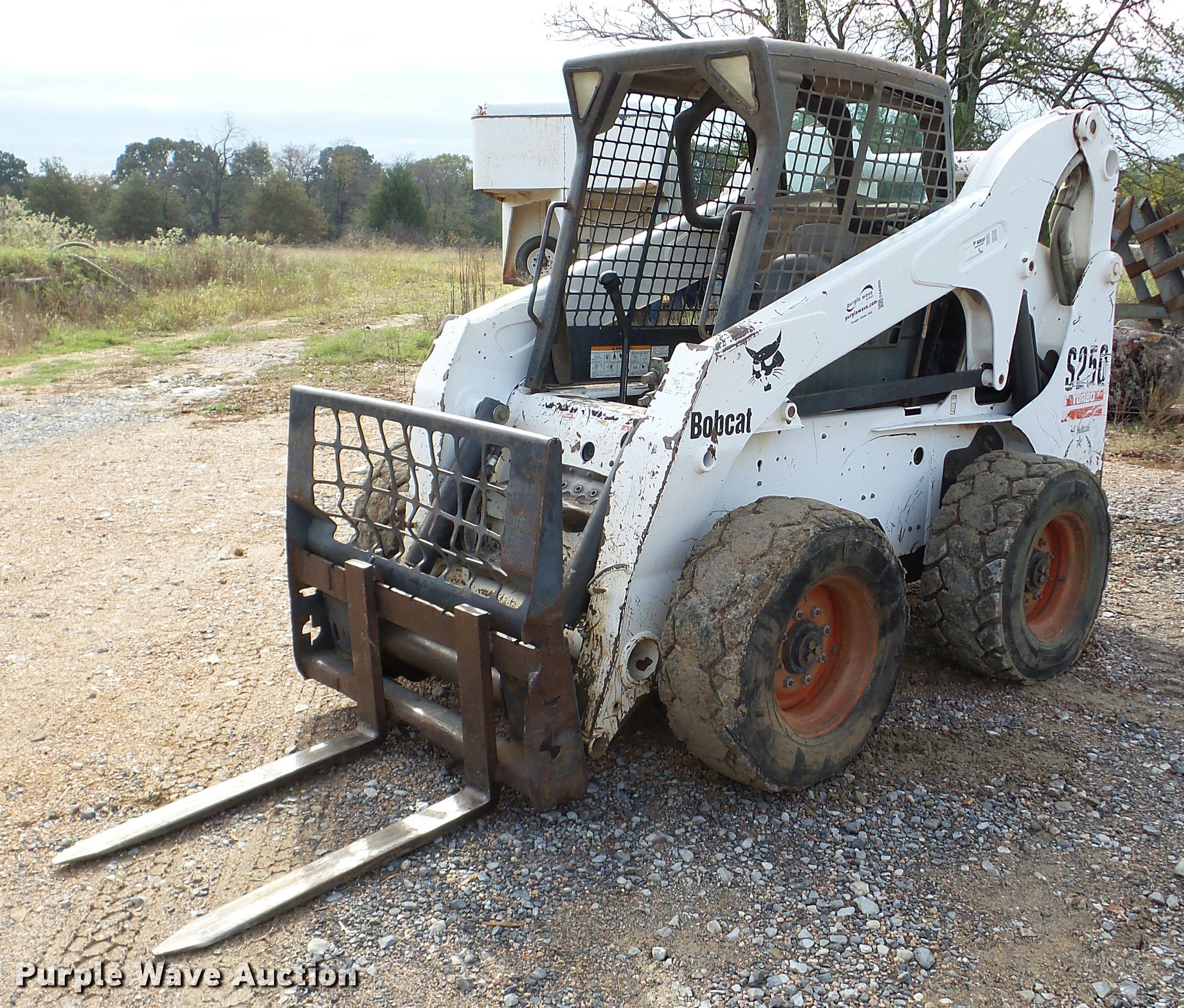 Purple Wave is selling a used Skid Steer Loader in Oklahoma. This item is a 2005 Bobcat S250 skid steer with the following: 7,865 hours on meter, Kubota V3300-T four cylinder turbo diesel engine, Hydrostatic transmission, Hand and foot controls, Front work lights, 34"L pallet forks, Manual quick coupler, Auxiliary hydraulics, 12-16.5 tires, Serial 526017710