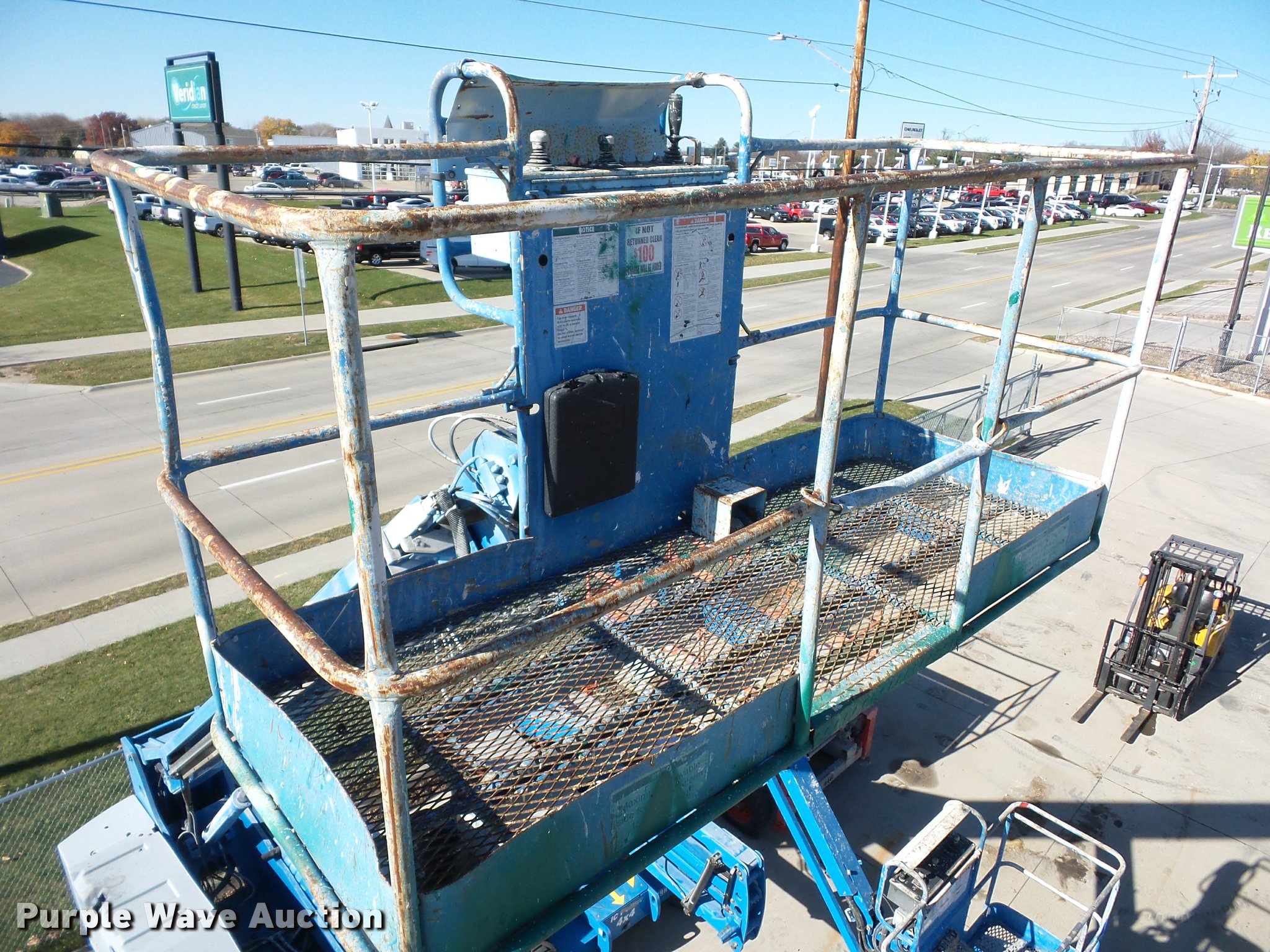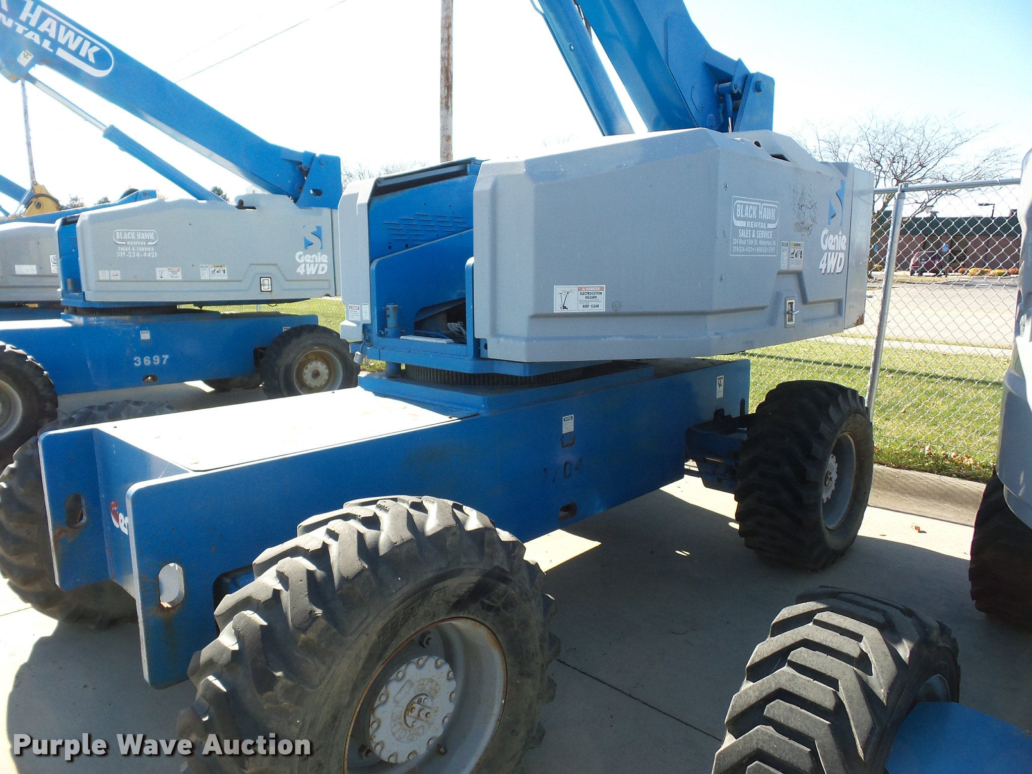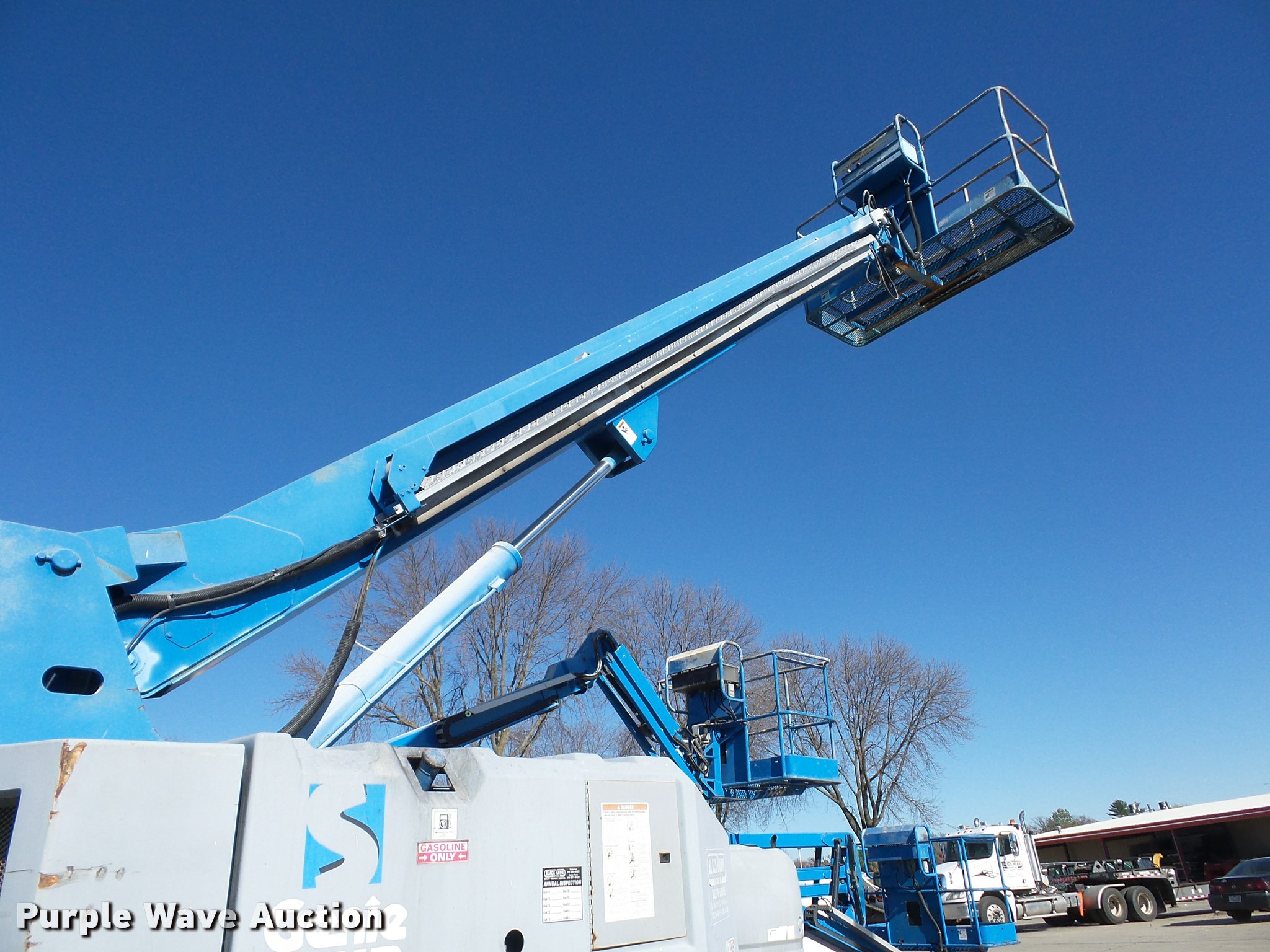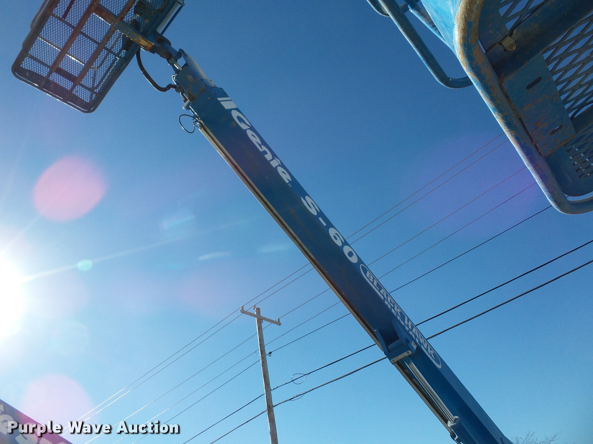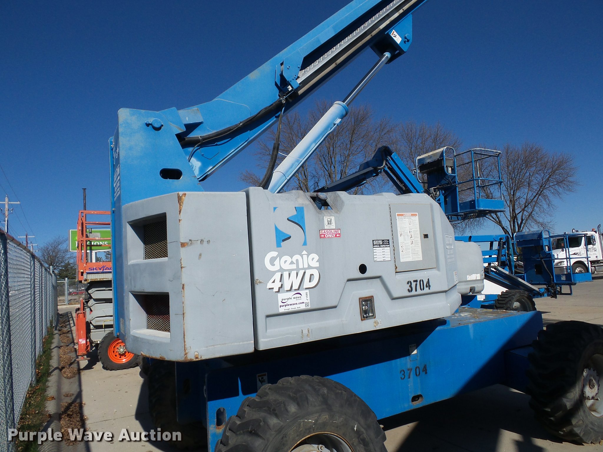 Purple Wave is selling a used Boom Lift in Iowa. This item is a 1998 Genie S60 boom lift with the following: 5,581 hours on meter, Four cylinder dual fuel engine, Gas or propane capable, Hydrostatic transmission, Four wheel drive, 60' maximum lift height, 15 x 16.3 tires, Serial 2659